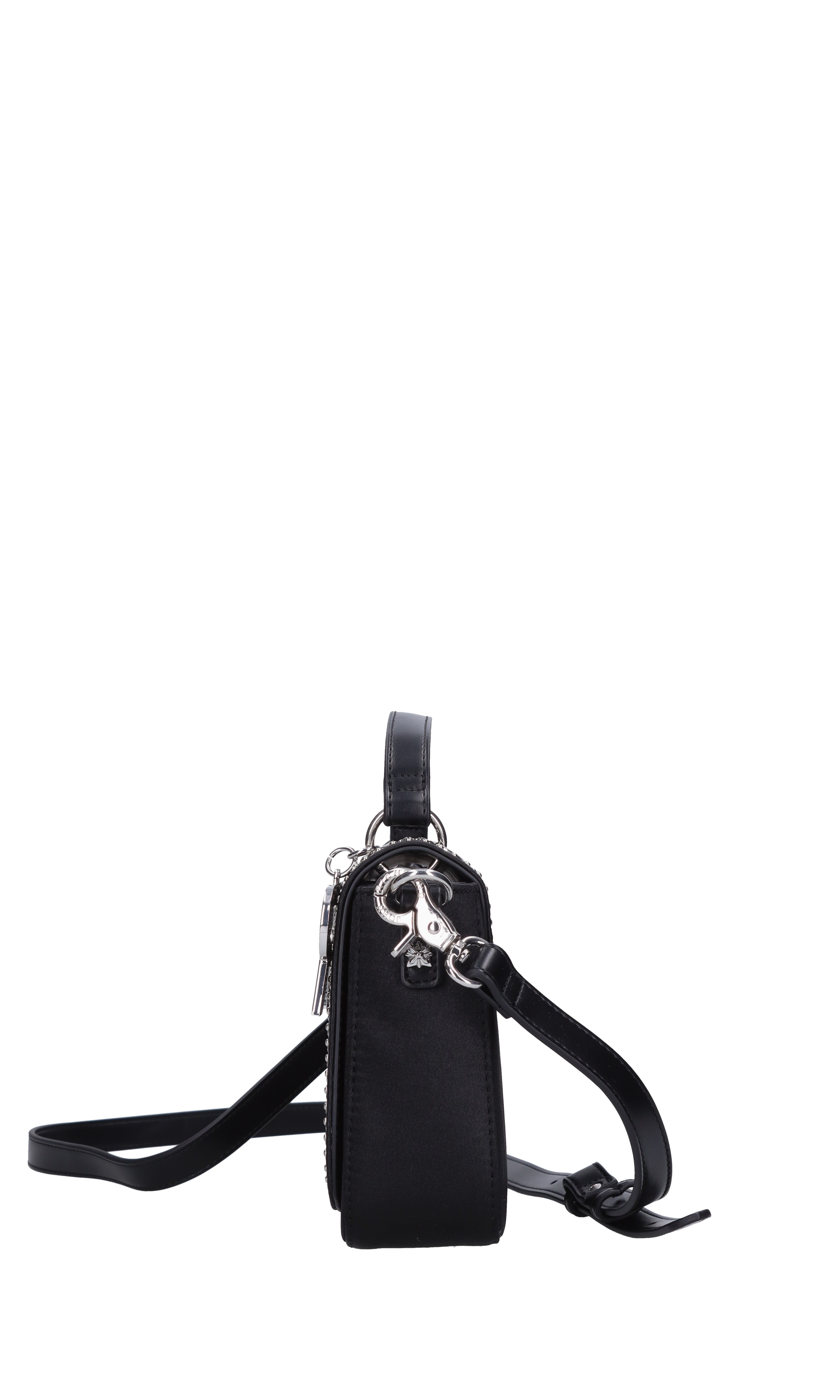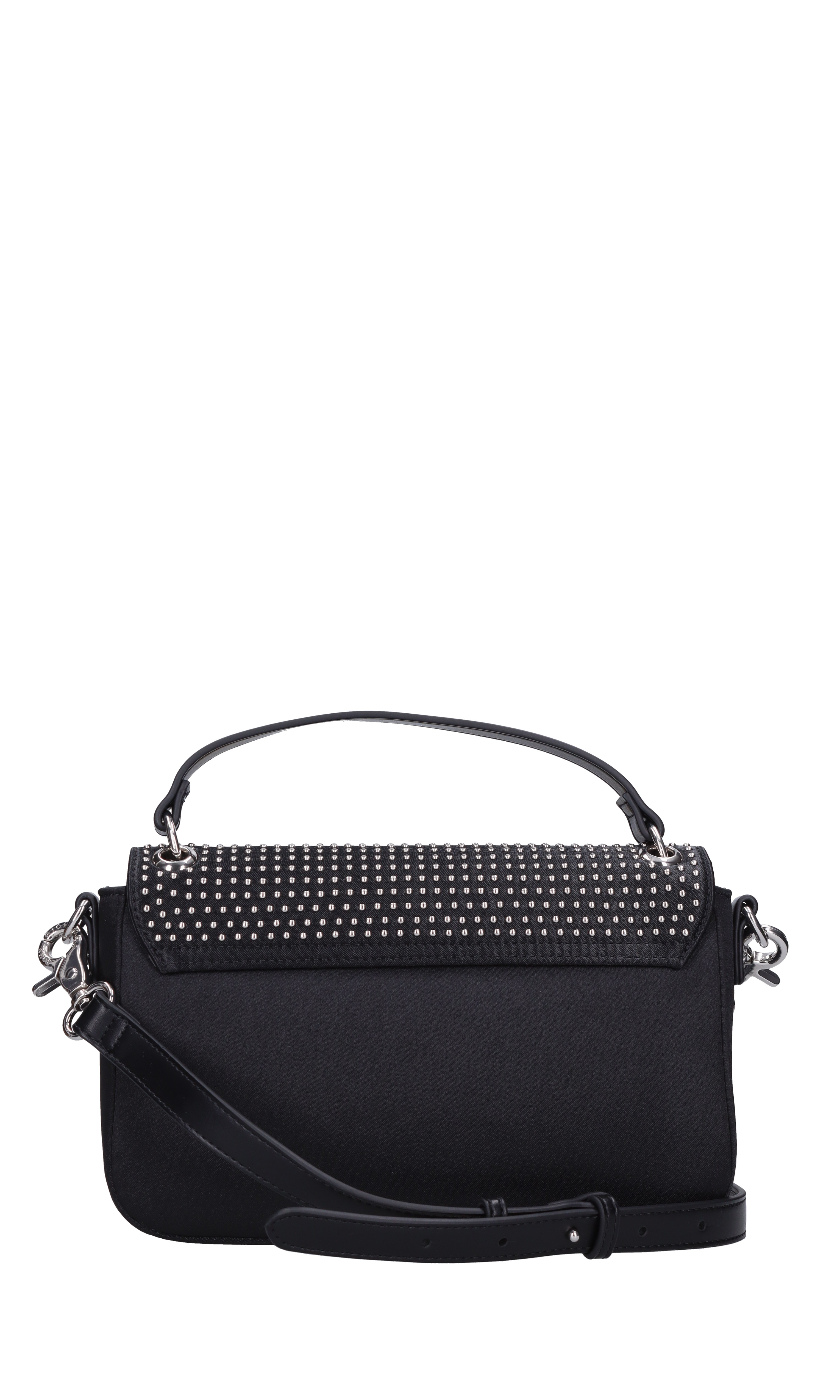 Satin and studded bag. 1 Compartment. Flap with snap button closure. Removable handle and shoulder strap. Shipped on transparent pouch.