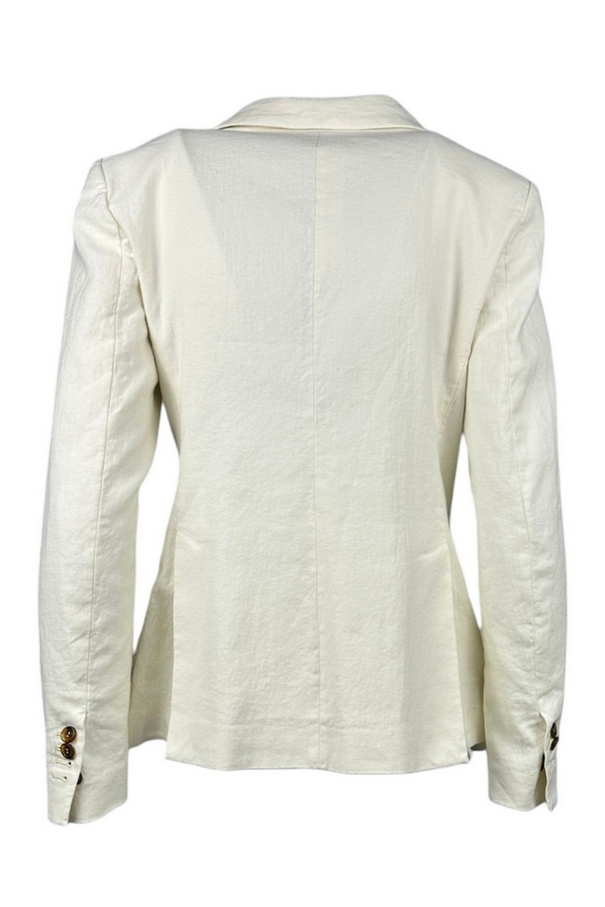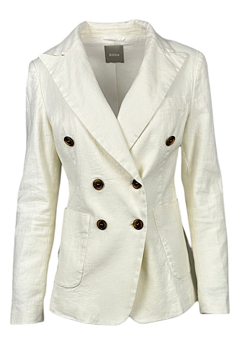 Kiltie Blazer. Double-breasted. Garment-dyed cotton and linen canvas. Patch pockets. Back slits. Fitted waist. Lined interior. Composition: 49% cotton, 49% linen, 2% elastane. Made in Italy.