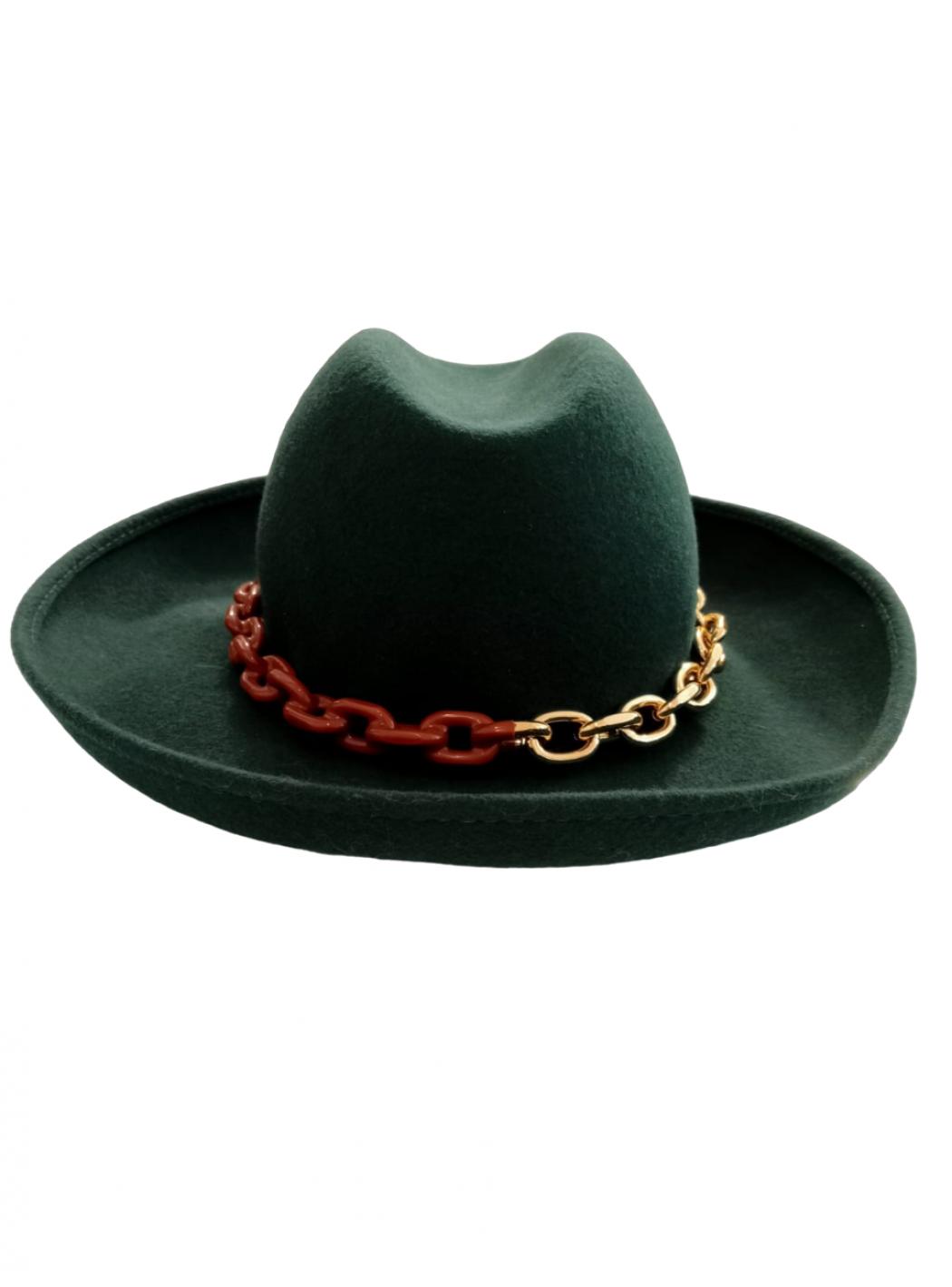 Stunning and elegant hat with soft wide green gucci with golden and brown chain application. 100% wool and made in Italy.