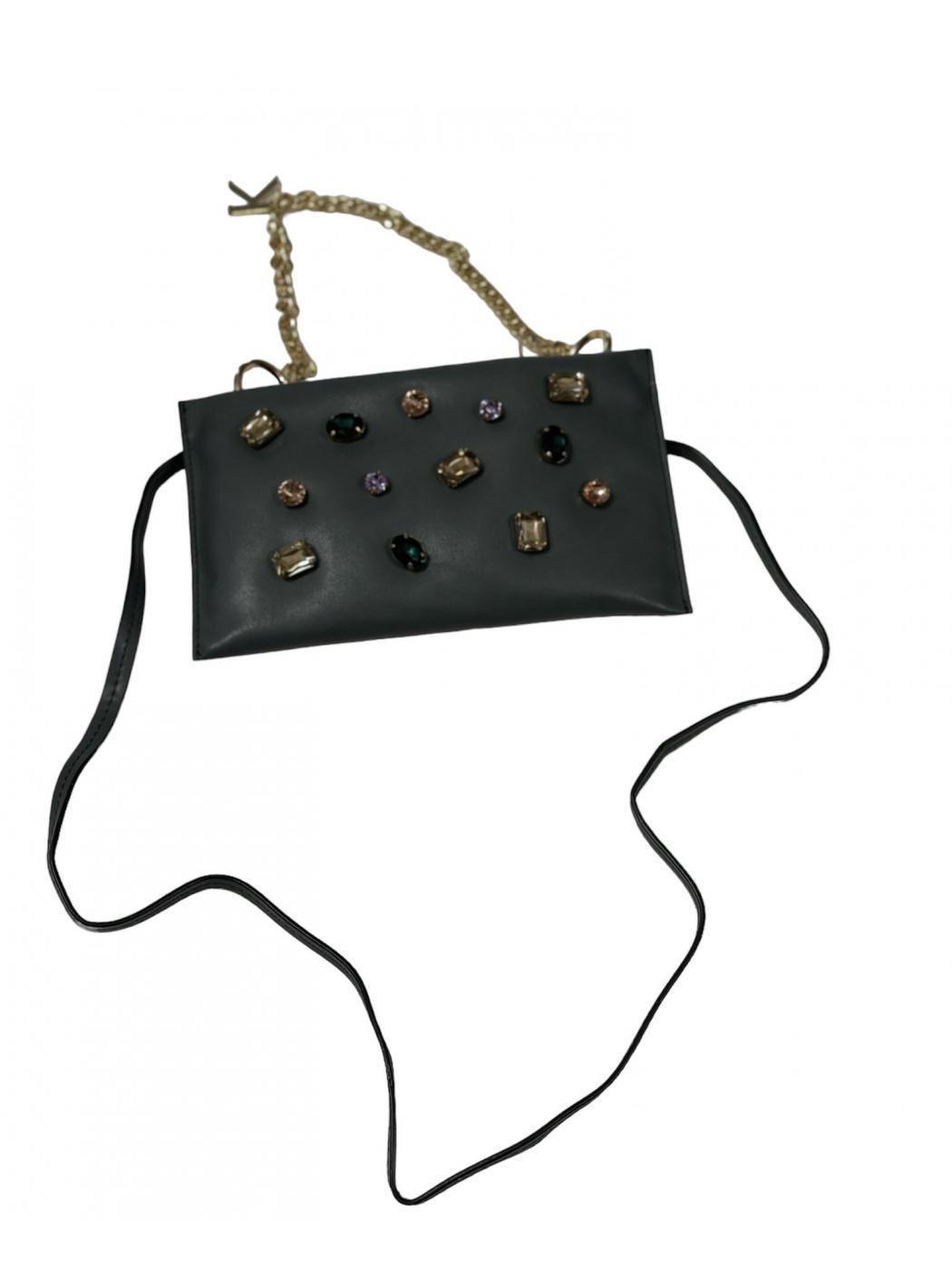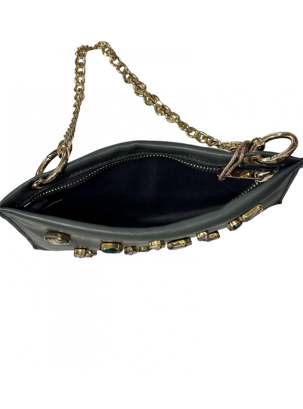 mini bag in eco-leather with zip closure with golden short chain and shoulder strap. In front of the rocks. Interior lined 100% polyester.