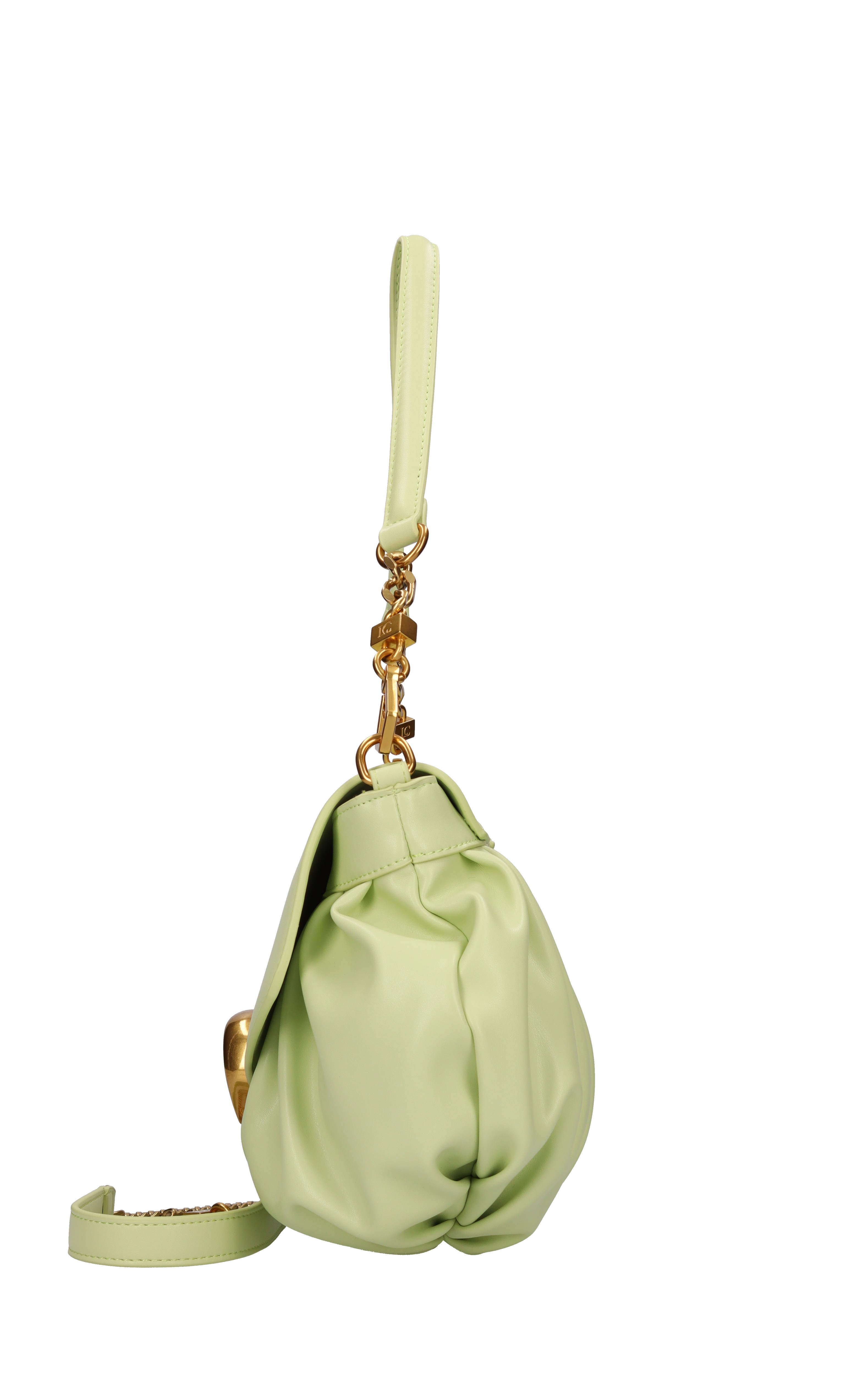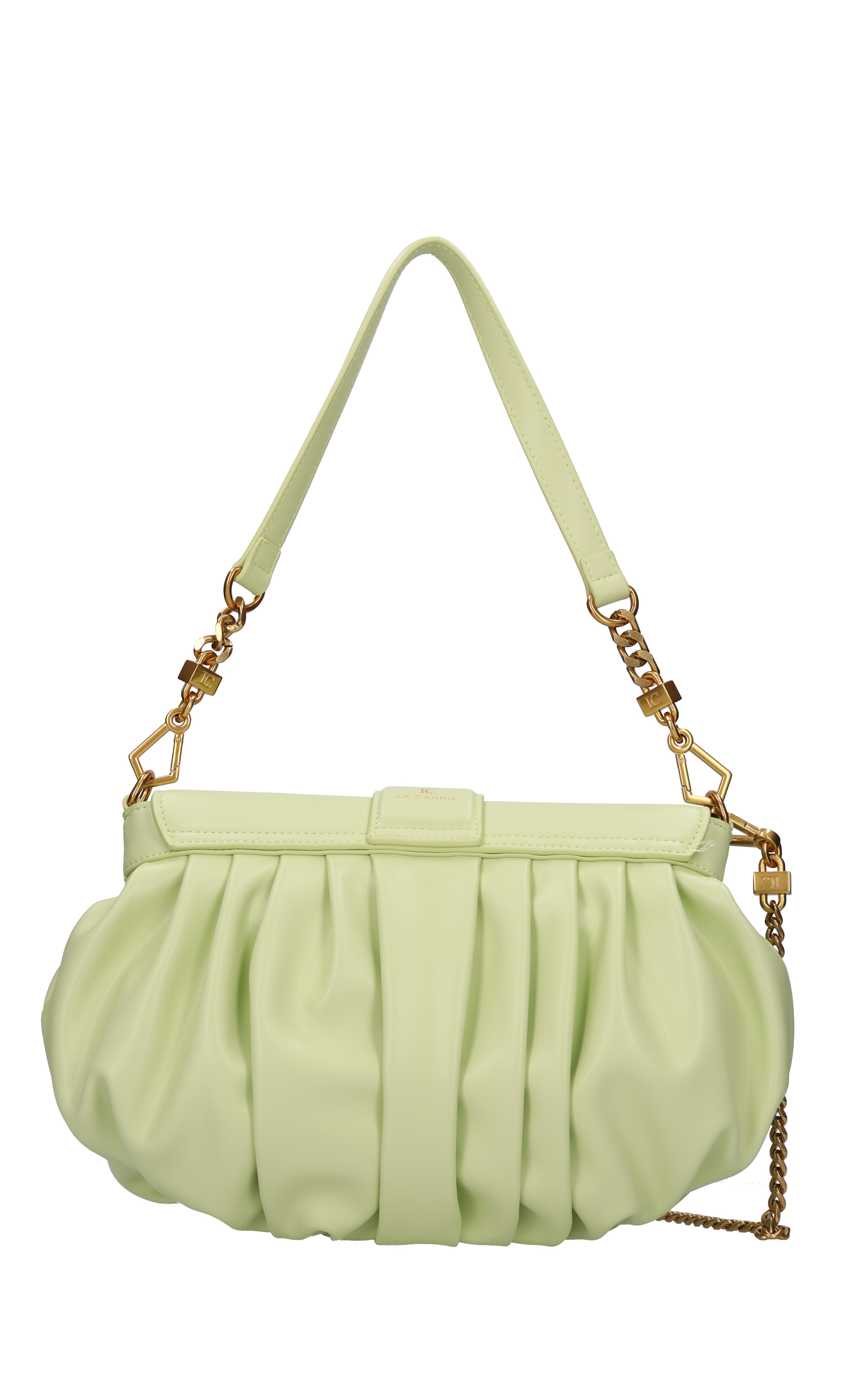 Soft pleated leather bag with moon-shaped closure on the flap and removable chain strap. 1 compartment and button closure.