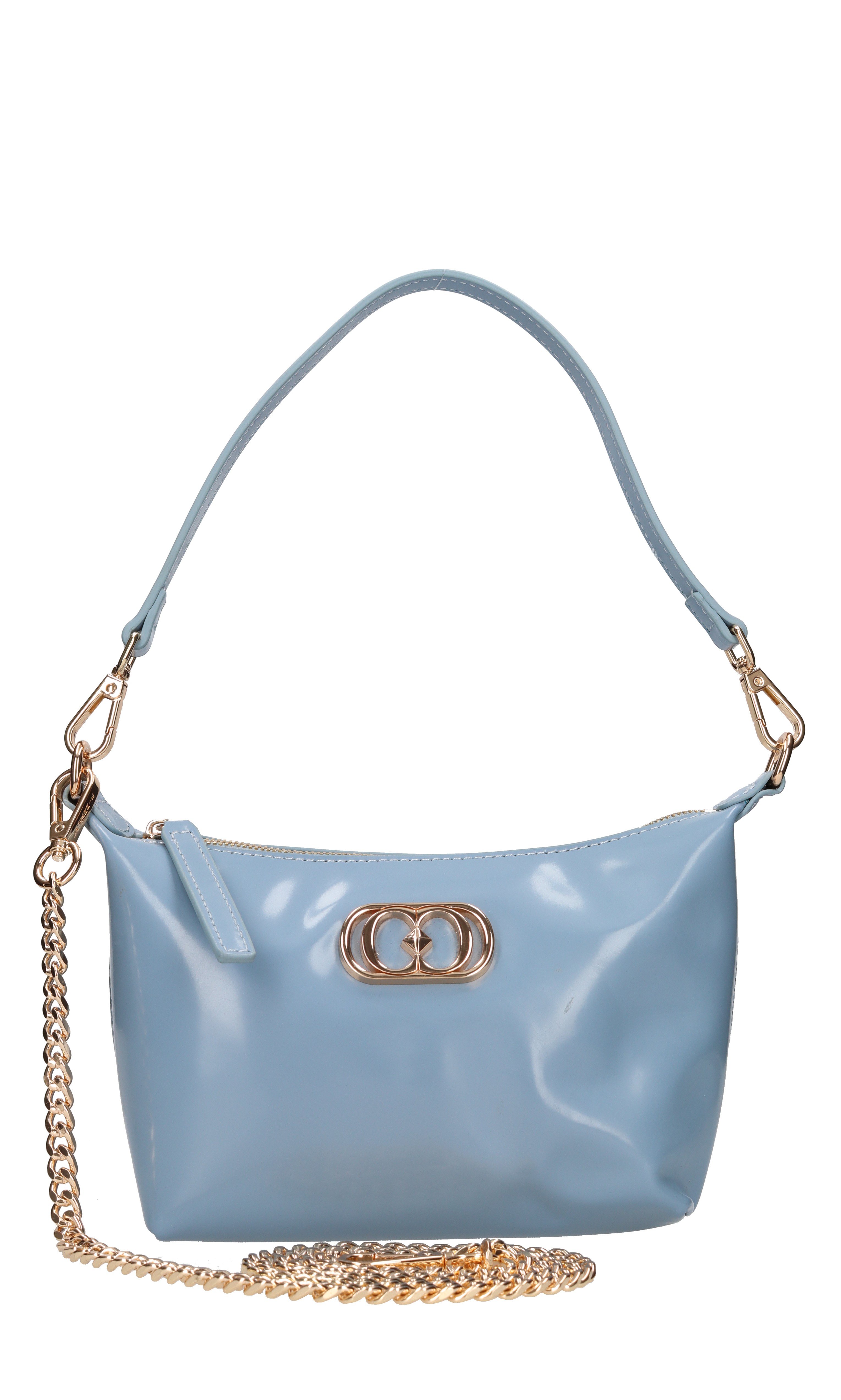 Shiny leather bag. 1 compartment with zip closure. Removable handle and removable chain shoulder strap. Imperceptible imperfections on the skin.
