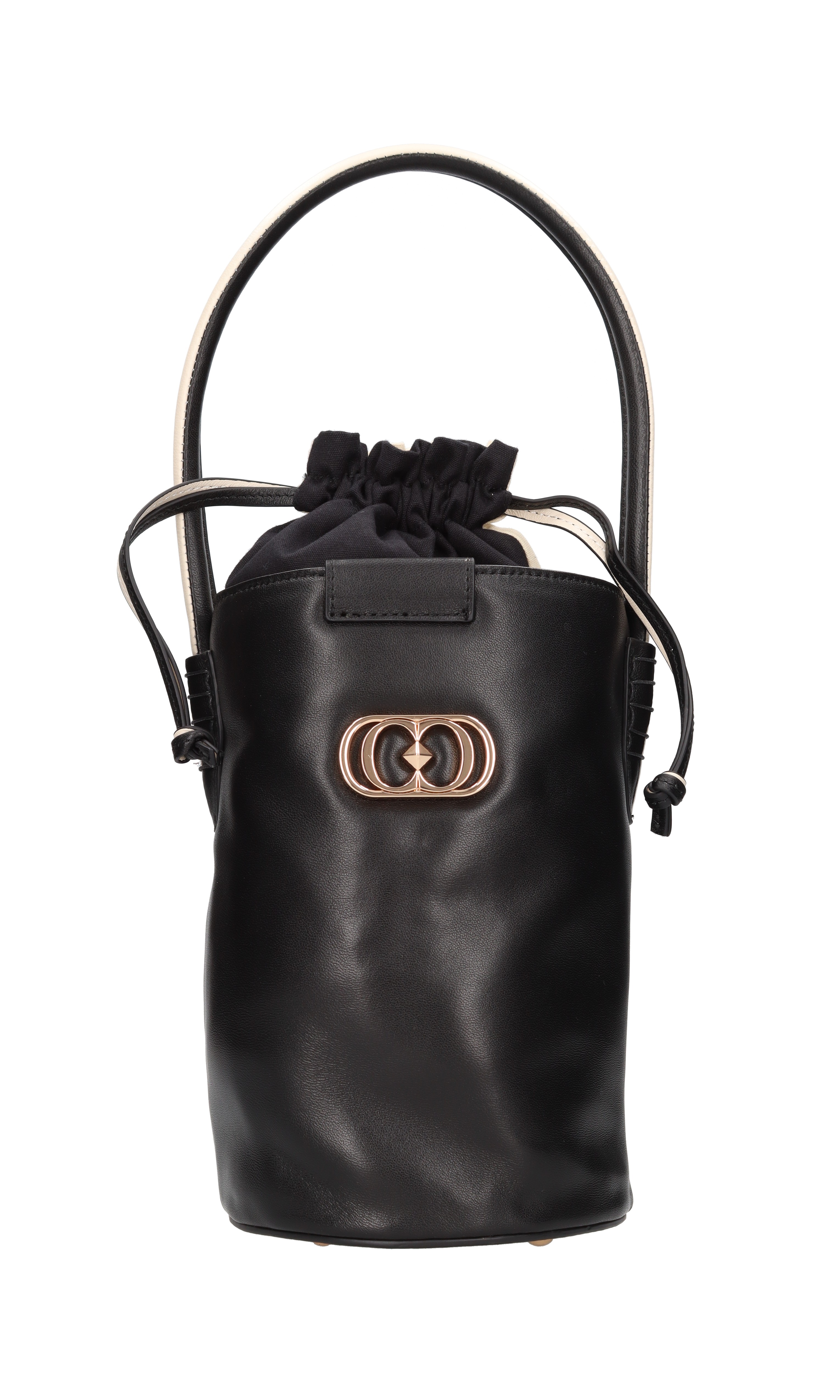 Leather and fabric bag. Color: Beige/Black. Drawstring closure. Internal pocket.