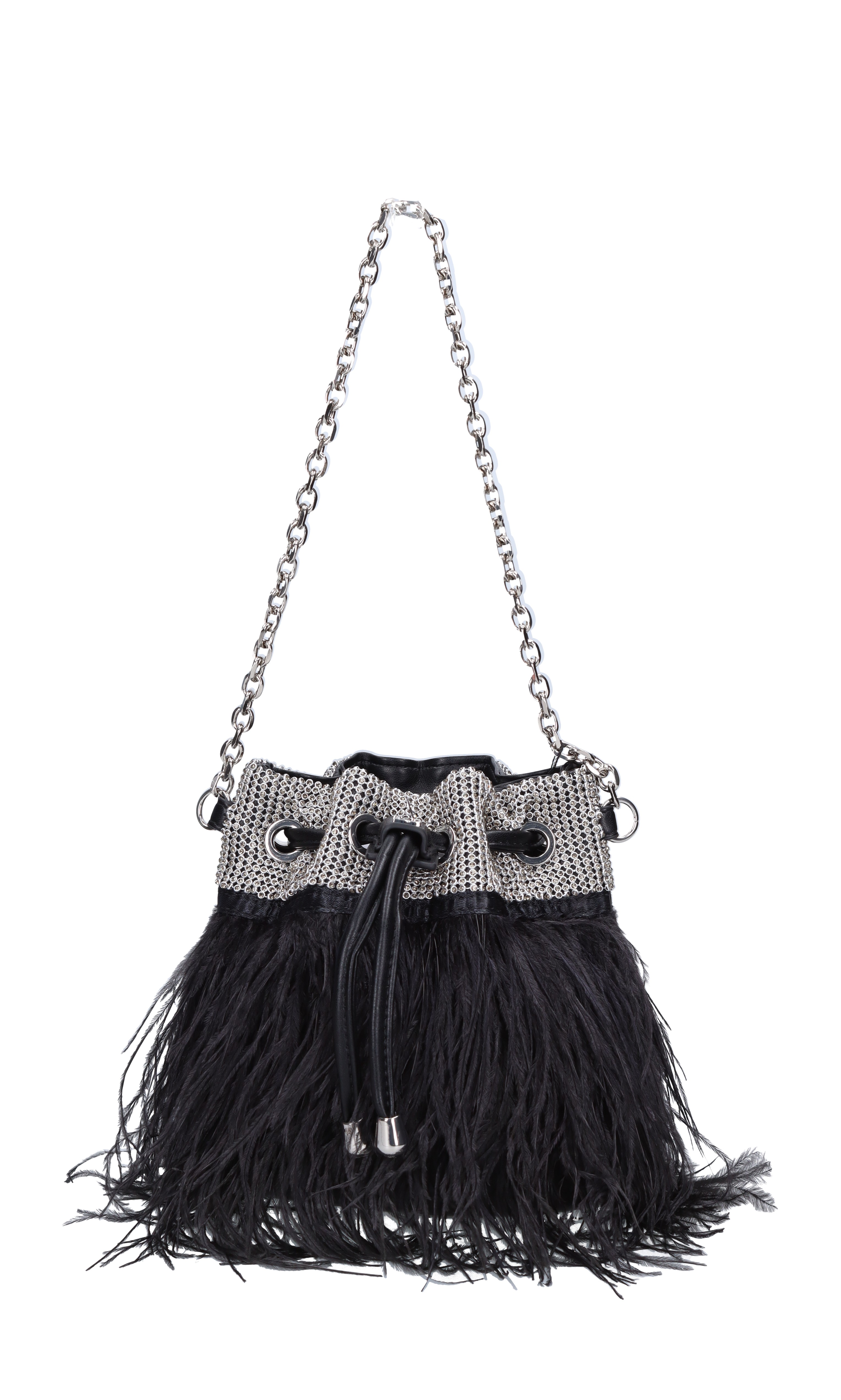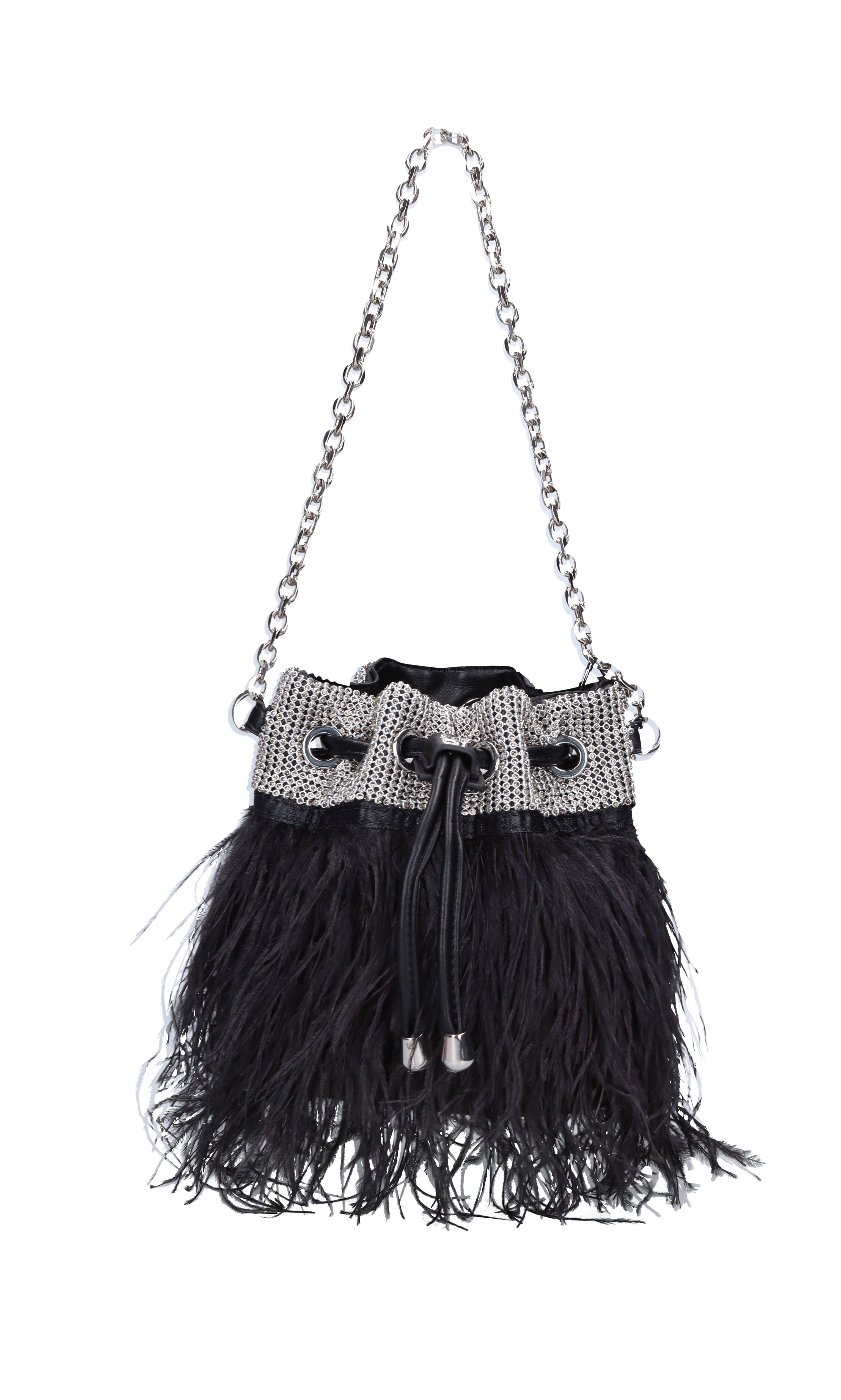 Multi-material bucket. Rhinestone and feather applications. Drawstring closure. Silver chain handle.