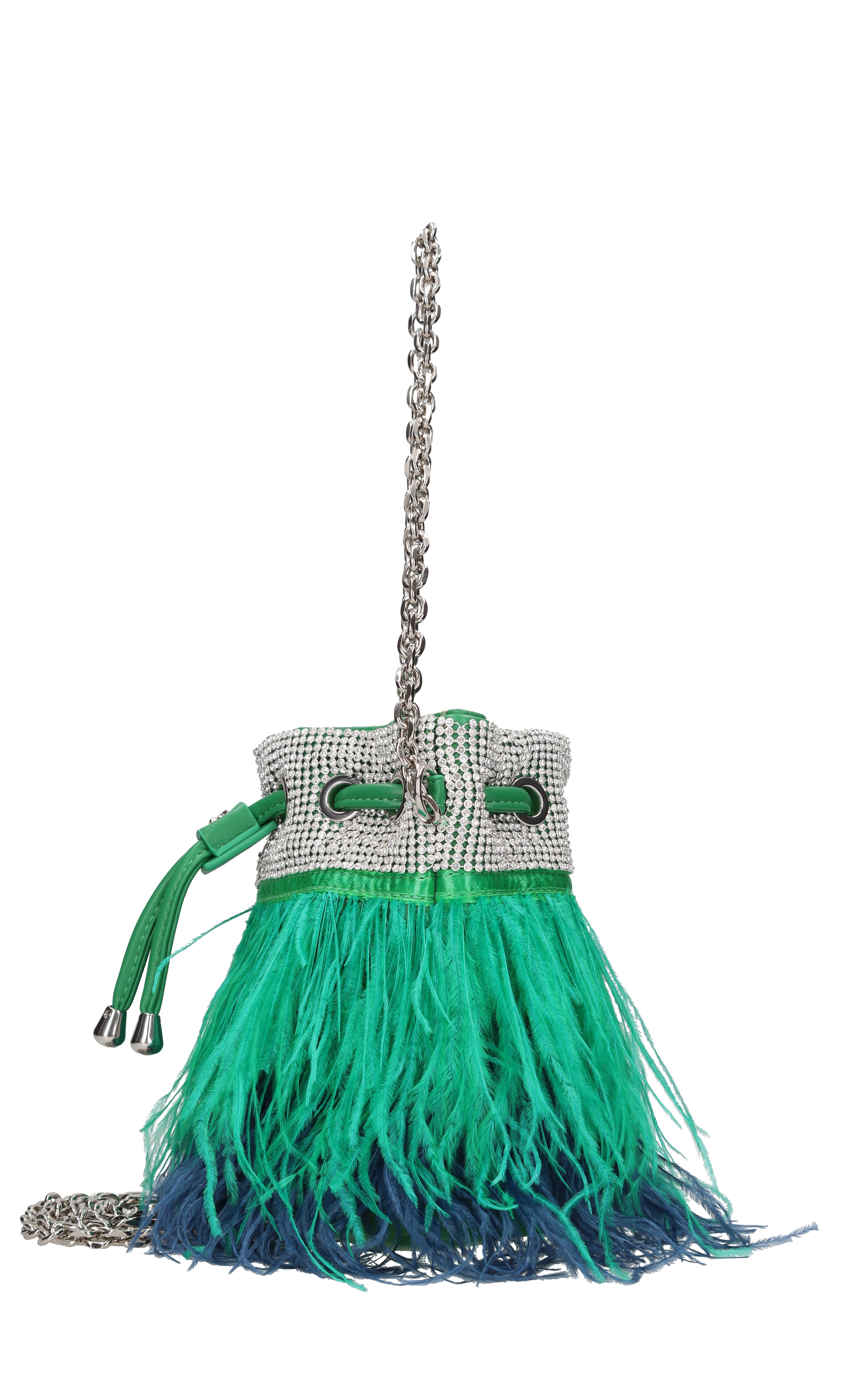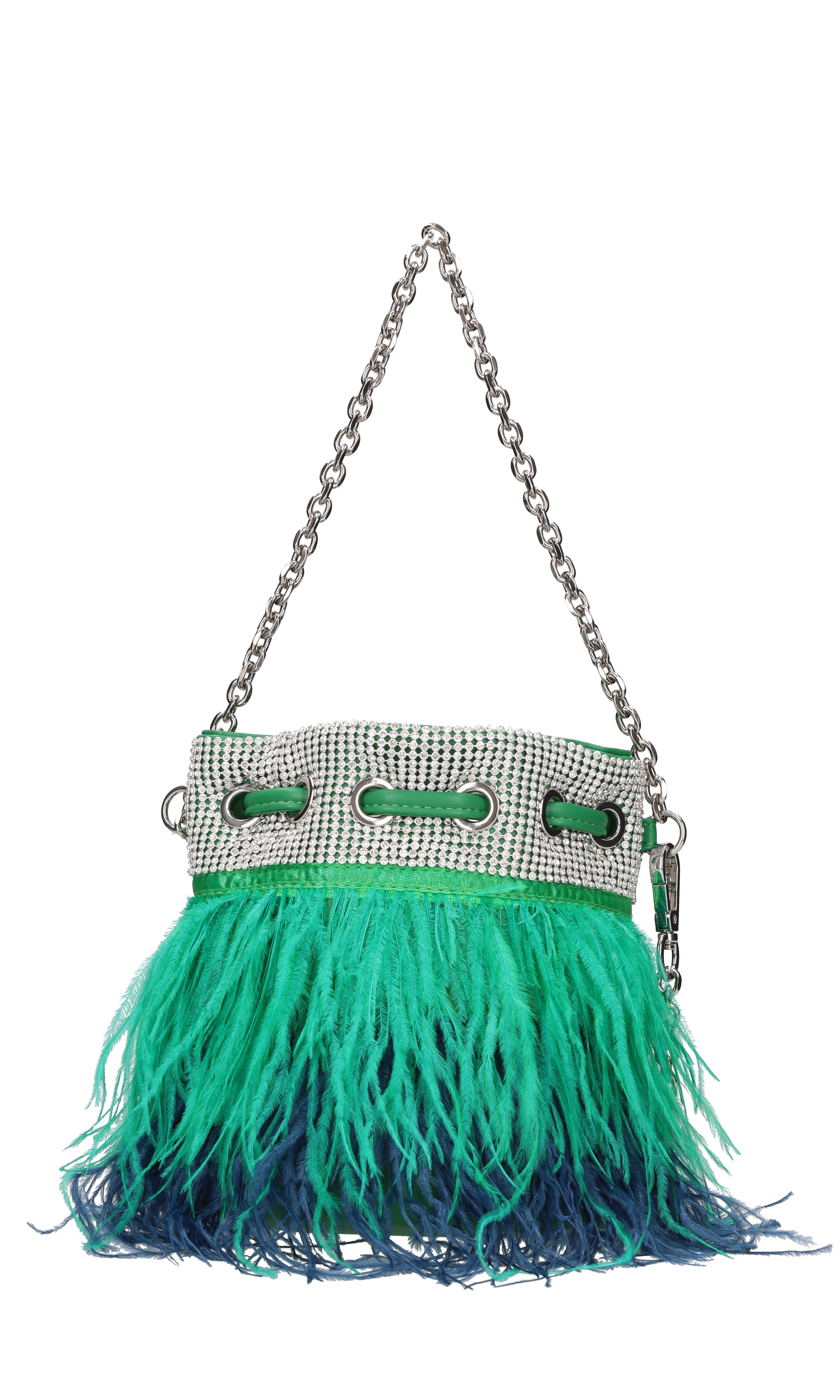 Leather bag. Rhinestone and feather applications. Drawstring closure. Removable metal shoulder strap.