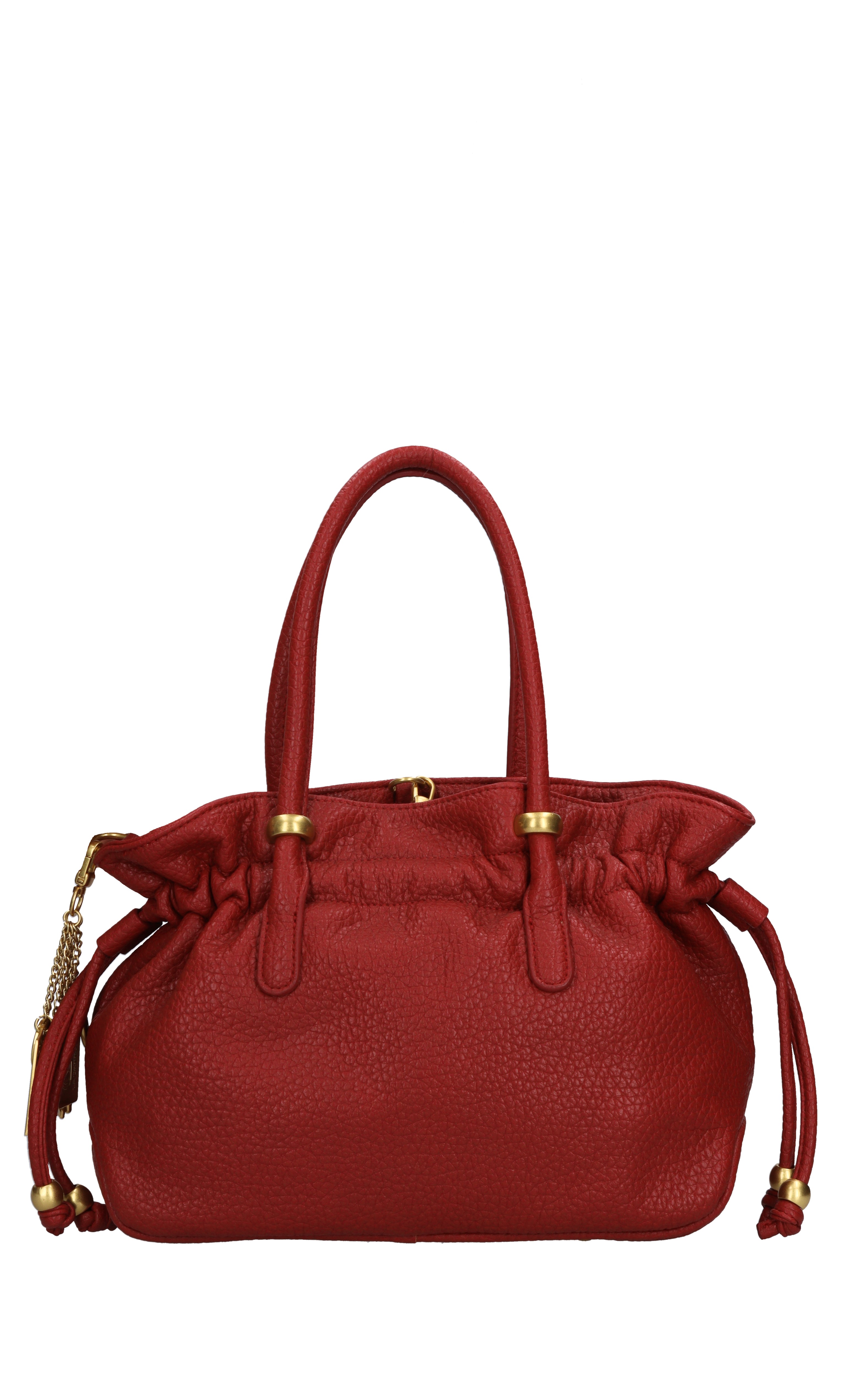 SCREAMING BELL faux leather bag. One compartment. Drawstring closure with lobster clasp. Removable golden chain and faux leather shoulder strap. Removable charm.