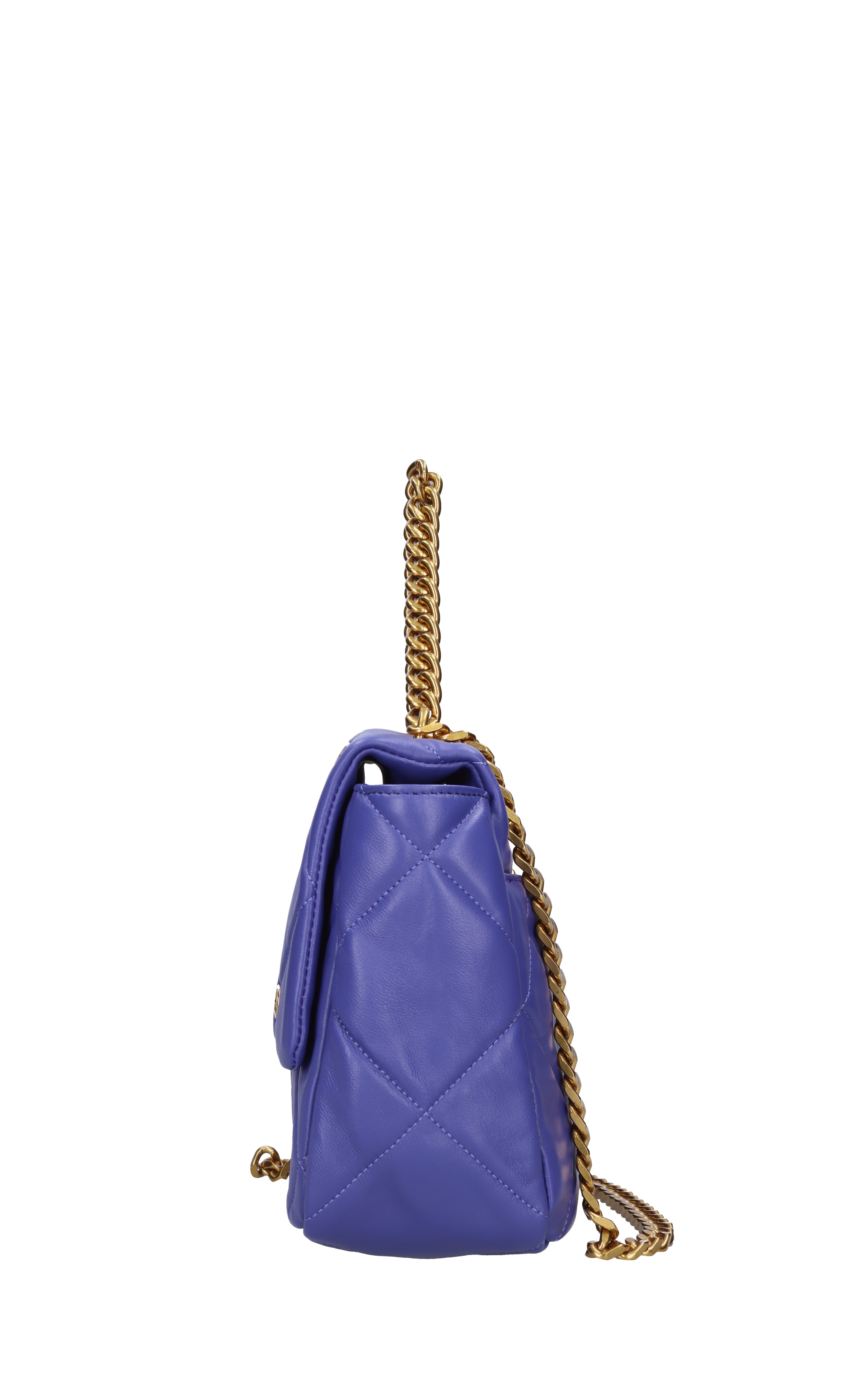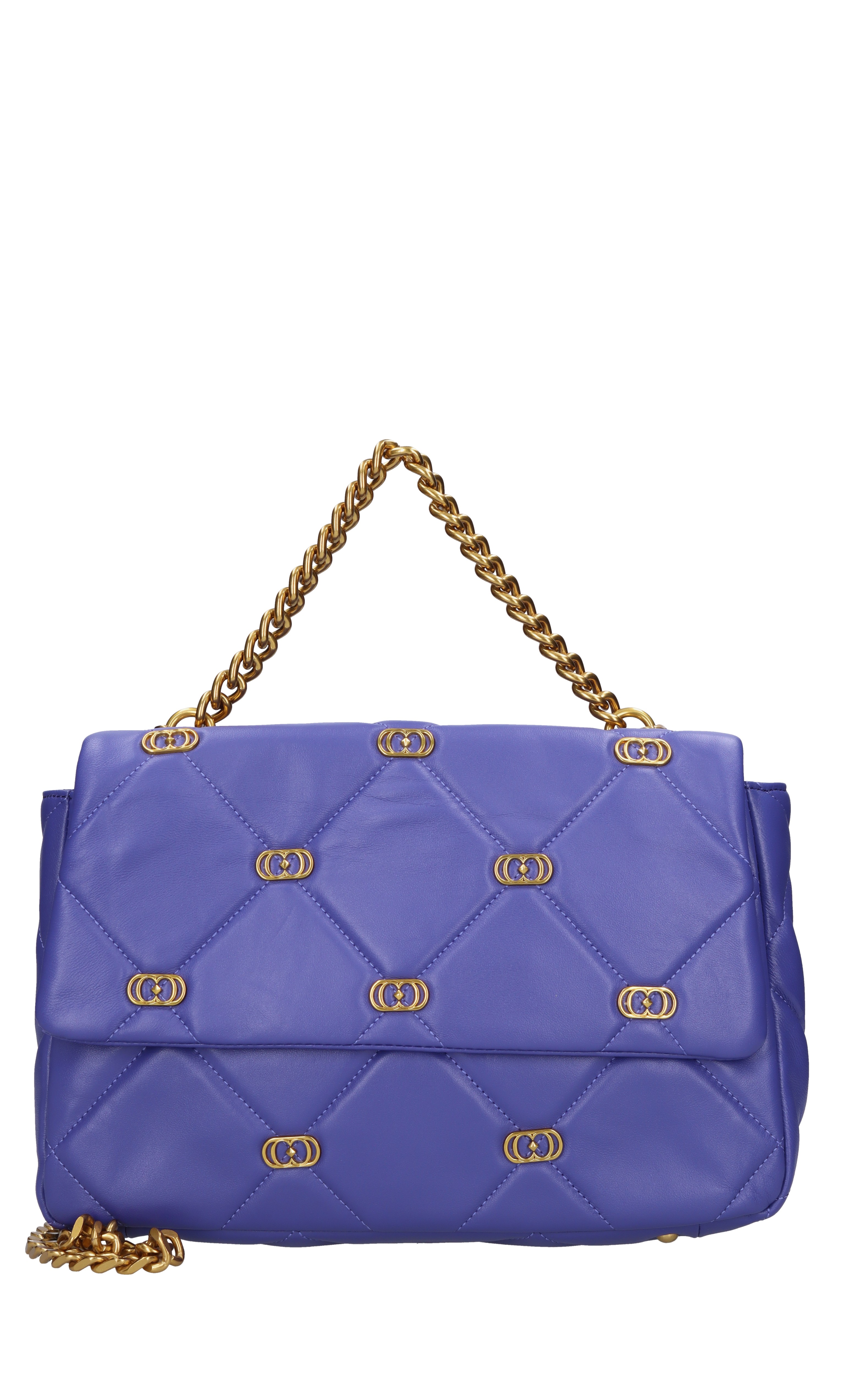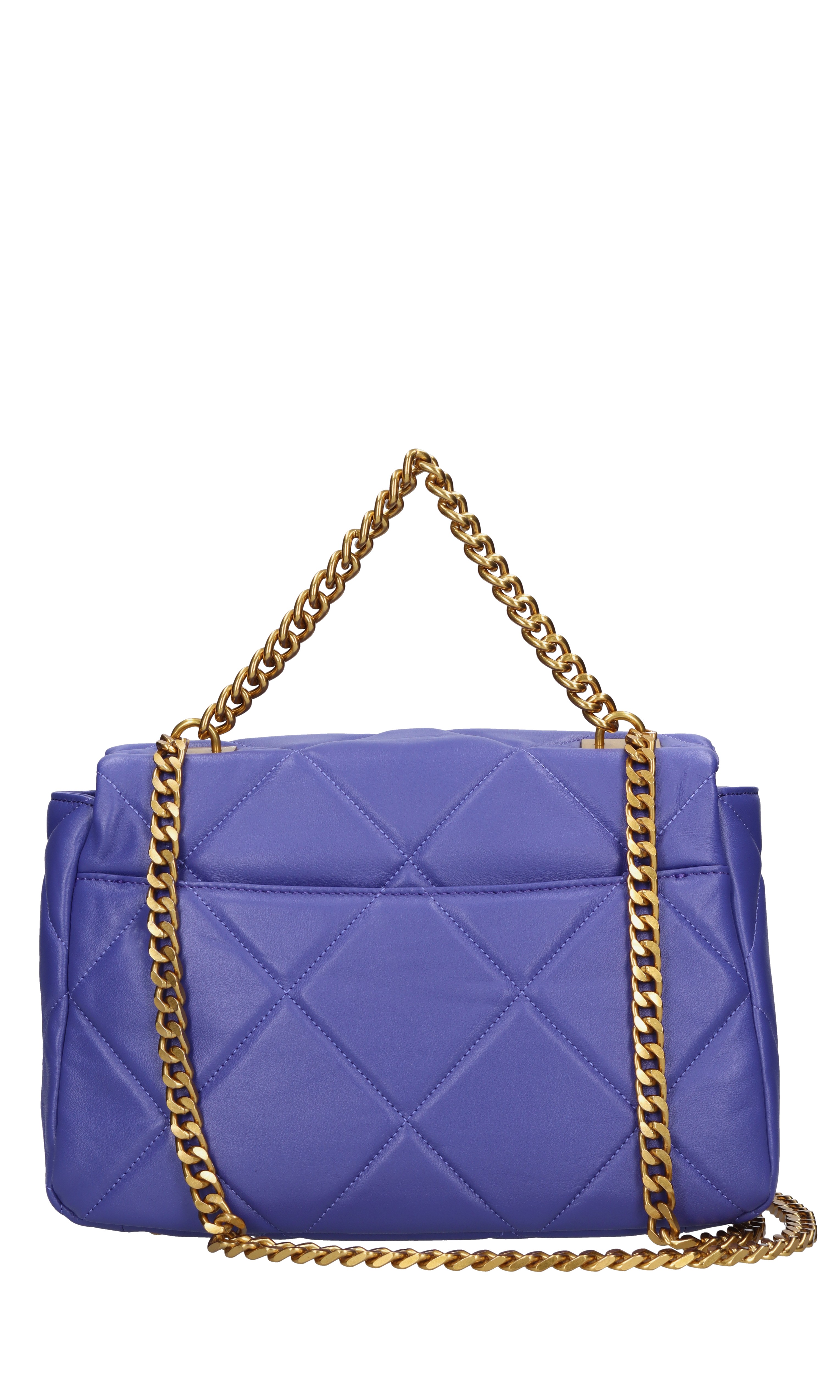 Leather bag. 1 Compartment. Flap closure with snap button. Bronze chain shoulder strap.
