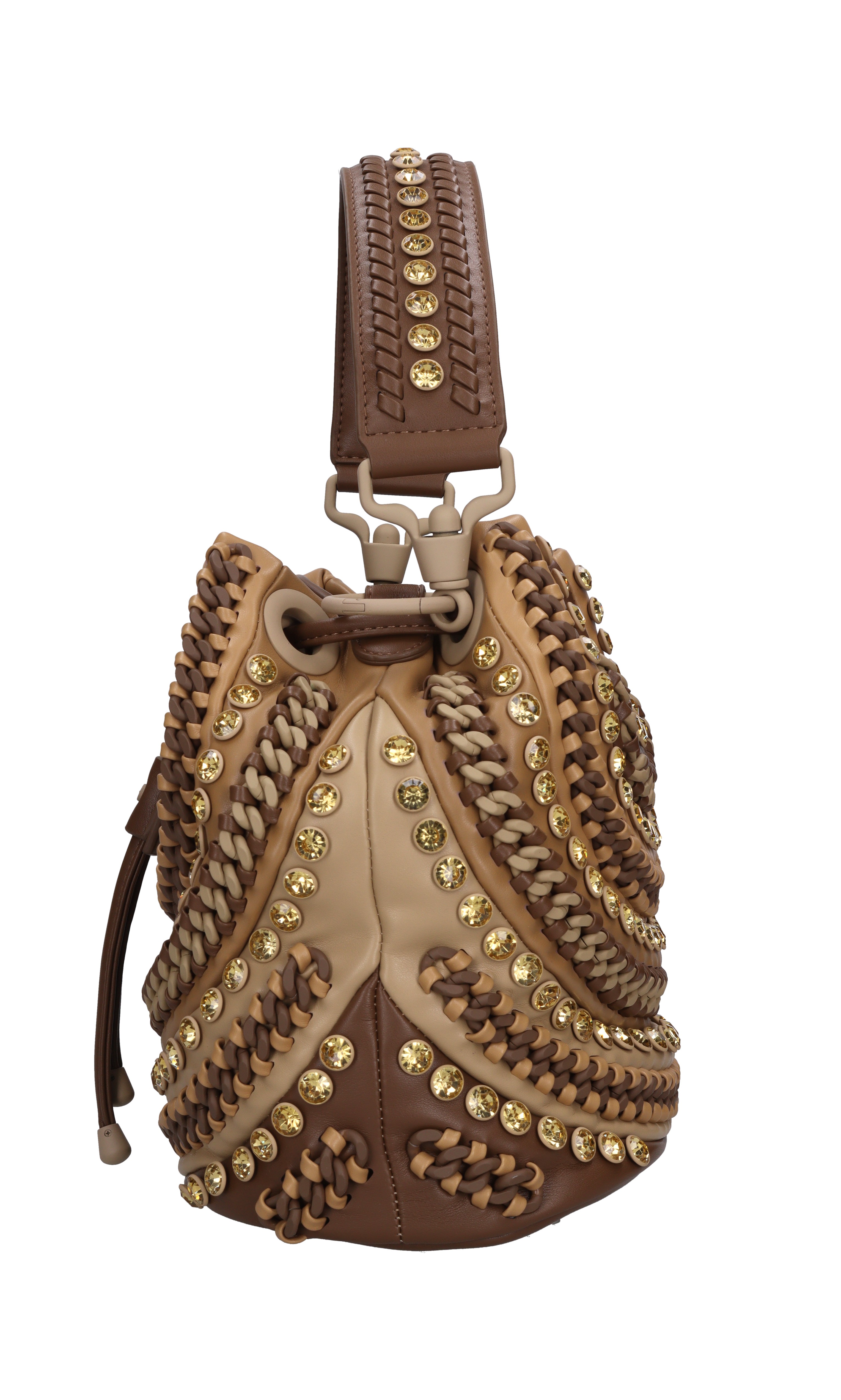 Andromeda faux leather bucket bag. 1 compartment. Drawstring and snap closure. Removable chain and faux leather shoulder strap.