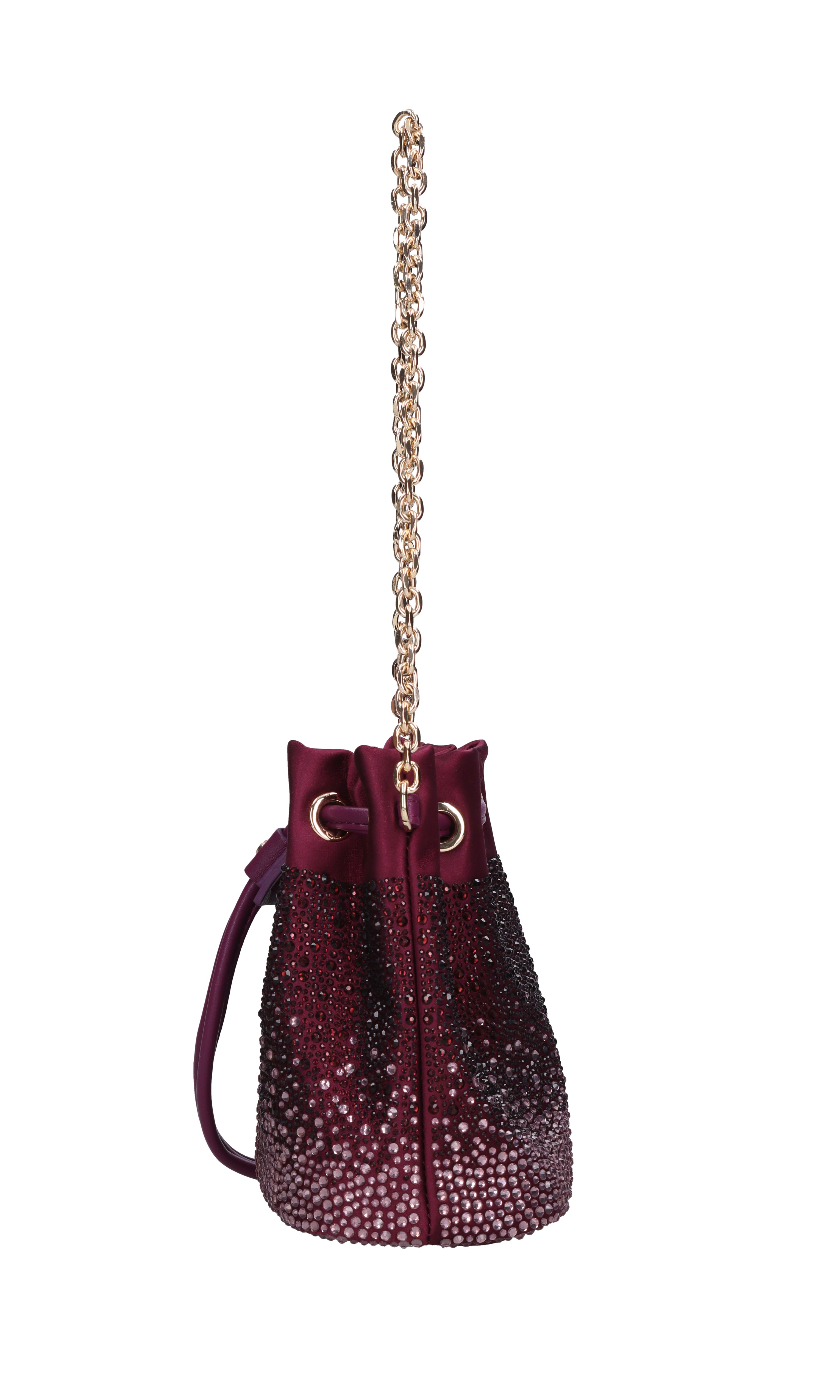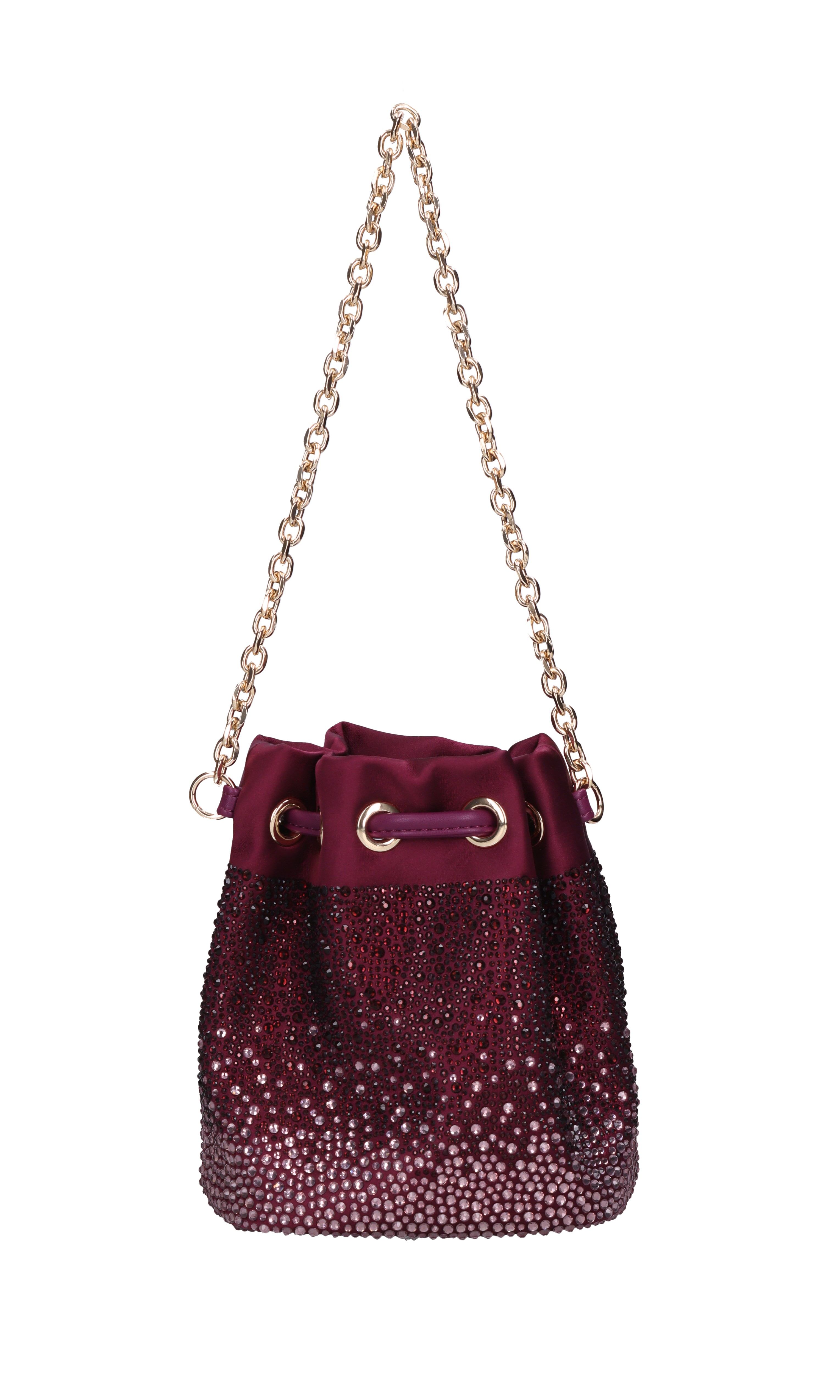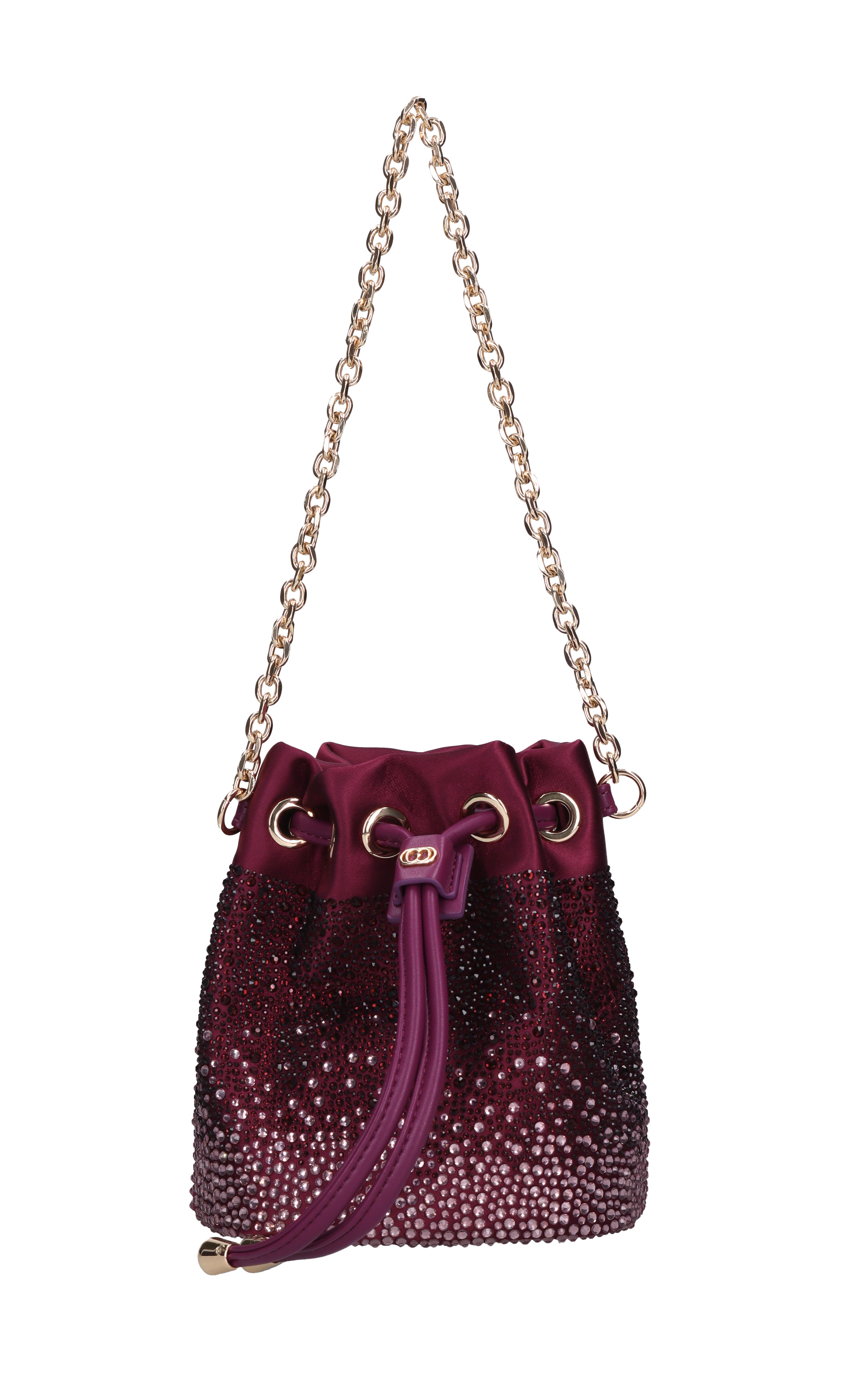 Night Edition bag in satin and rhinestones. 1 compartment. Drawstring closure. Removable golden chain shoulder strap.