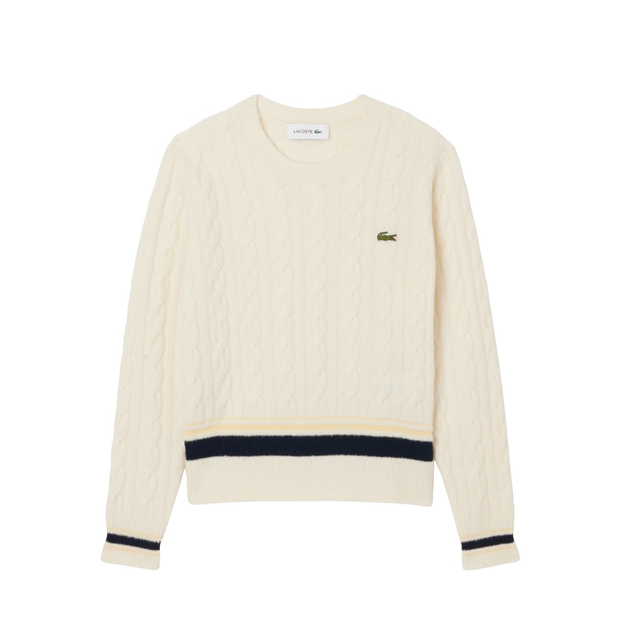 This sweater is the result of 90 years of experience in Lacoste knitting. An homage to the tennis tradition of Lacoste, with a braided design with narrow stripes. A generous and contemporary cut, finished with our signature crocodile to earn style points. Knit braids with wool from sources respectful of animal welfare Classic natural fit, with comfortable sleeves Choker Embroidered crocodile sewn on the chest