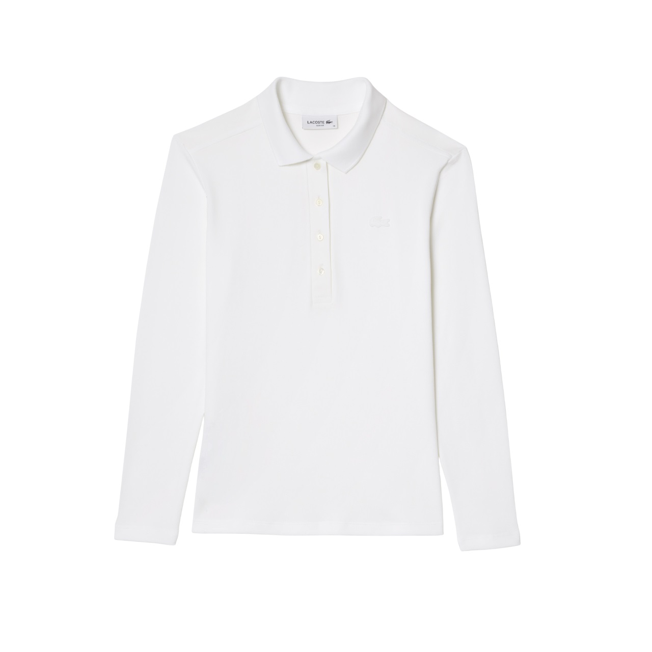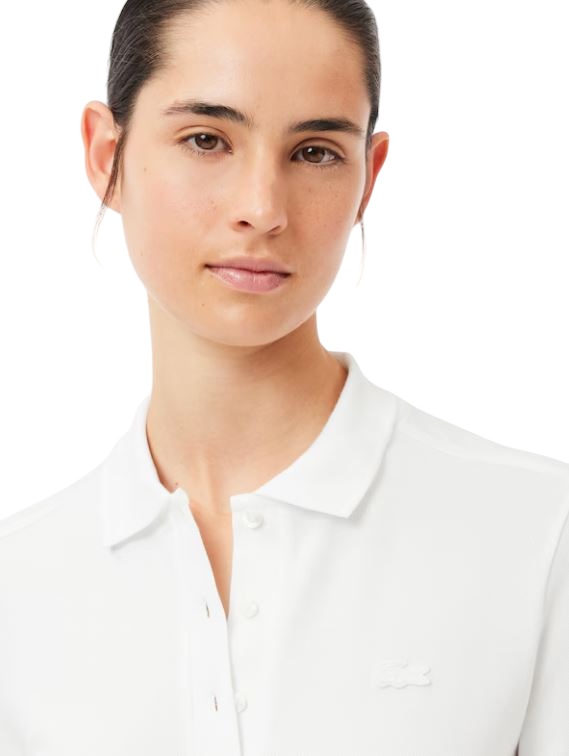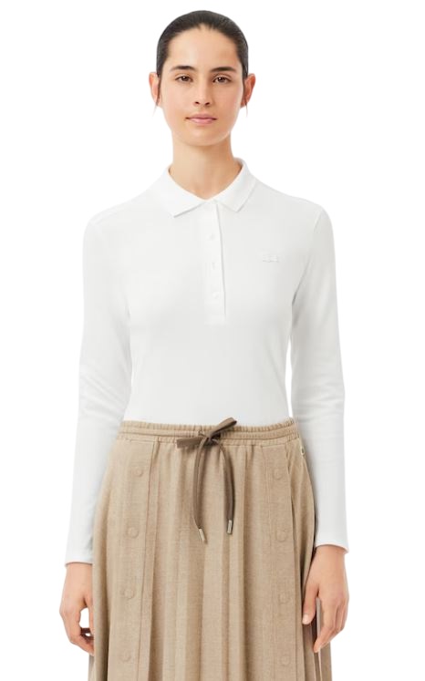 Classic long sleeves and genuine mother-of-pearl buttons enhance the feminine look of this cotton polo, perfect for the season. The slim fit adds charm to this timeless piece. Mini stretch cotton piqué Ribbed polo collar with four buttons Slim fit Genuine mother-of-pearl buttons Tone-on-tone crocodile logo embroidered on the chest Main fabric: Cotton (94%), Elastane (6%) / Collar: Cotton (100%) Model's measurements The model is 1m79 and wears a size 36