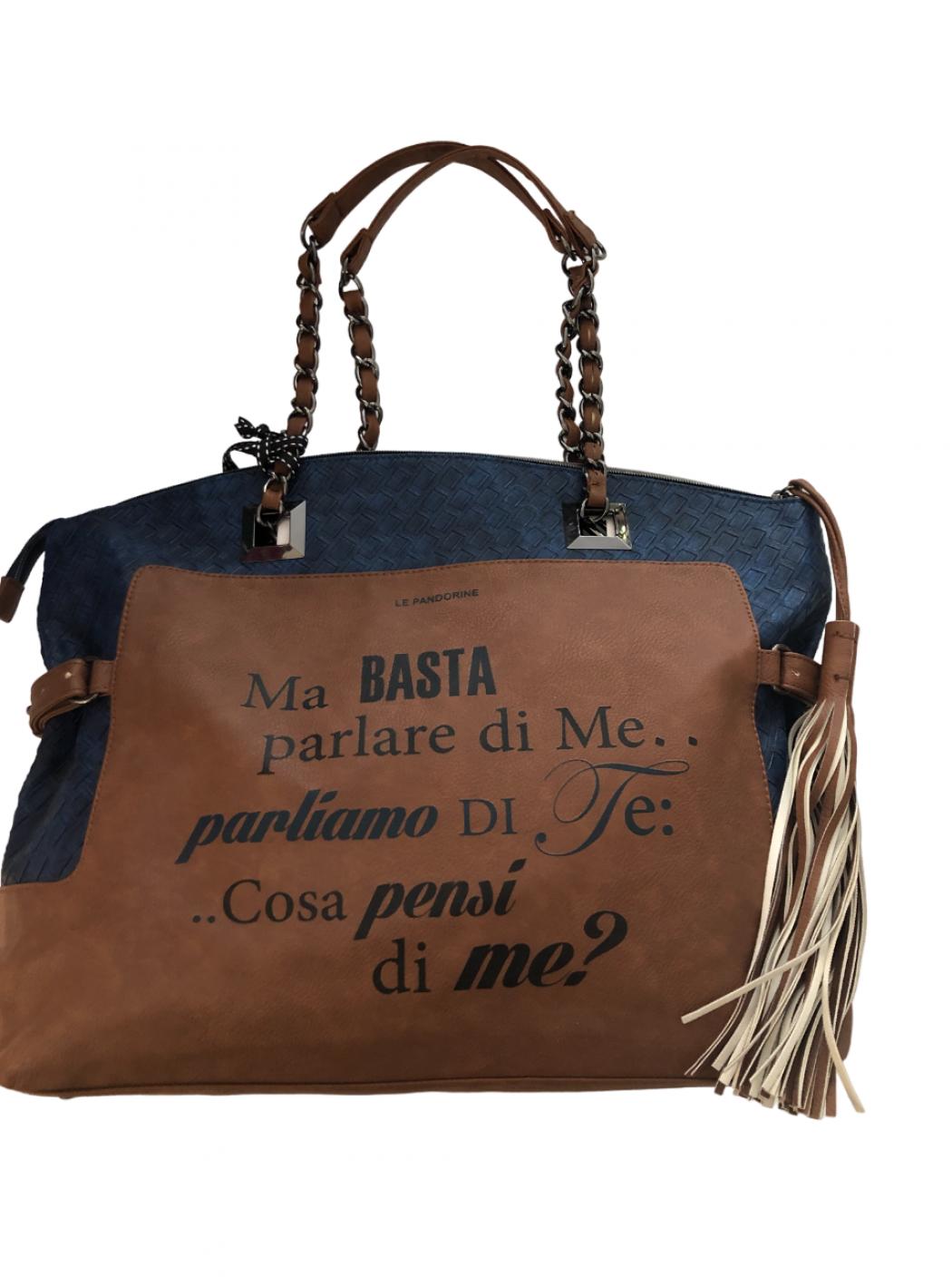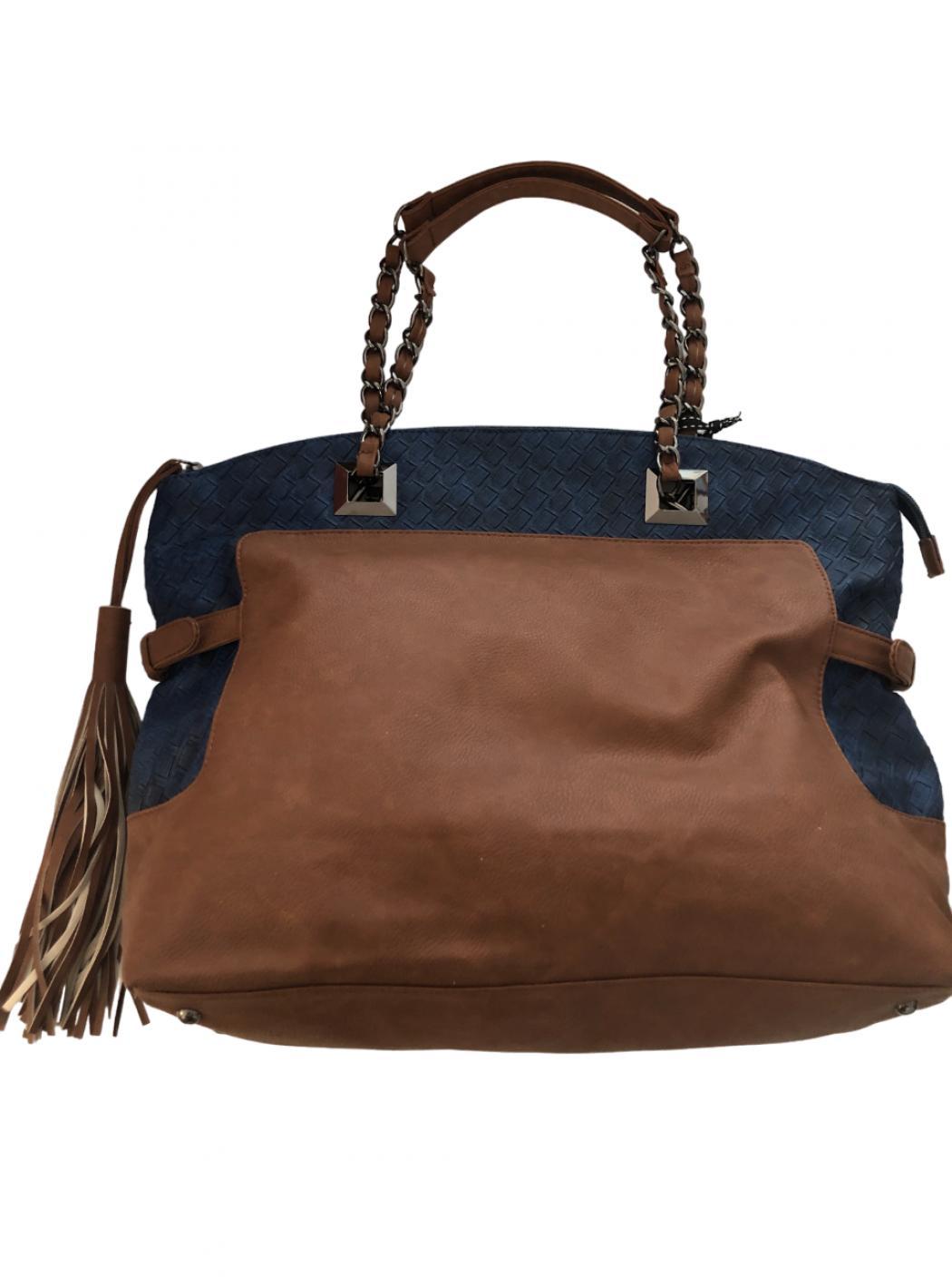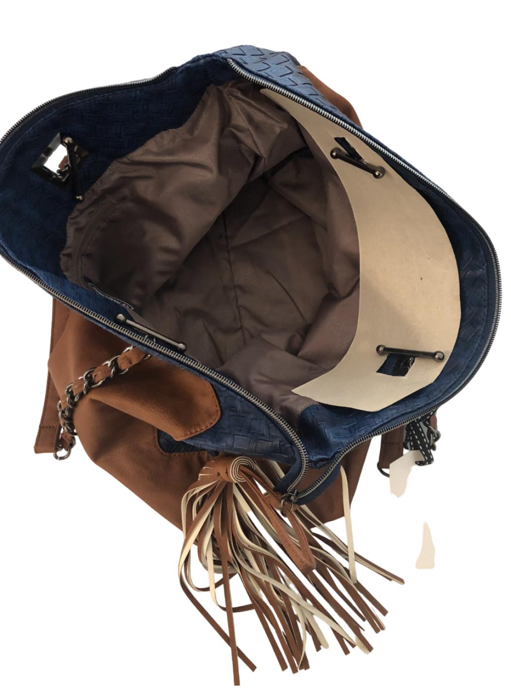 Vintage bag with blue color insert. Handles in eco-leather and chain. Zip closure with fringe pon pon.The dimensions allow you to carry personal items to be placed inside in order. Complete your look with this bag and give a trendy chic style to your outfits.