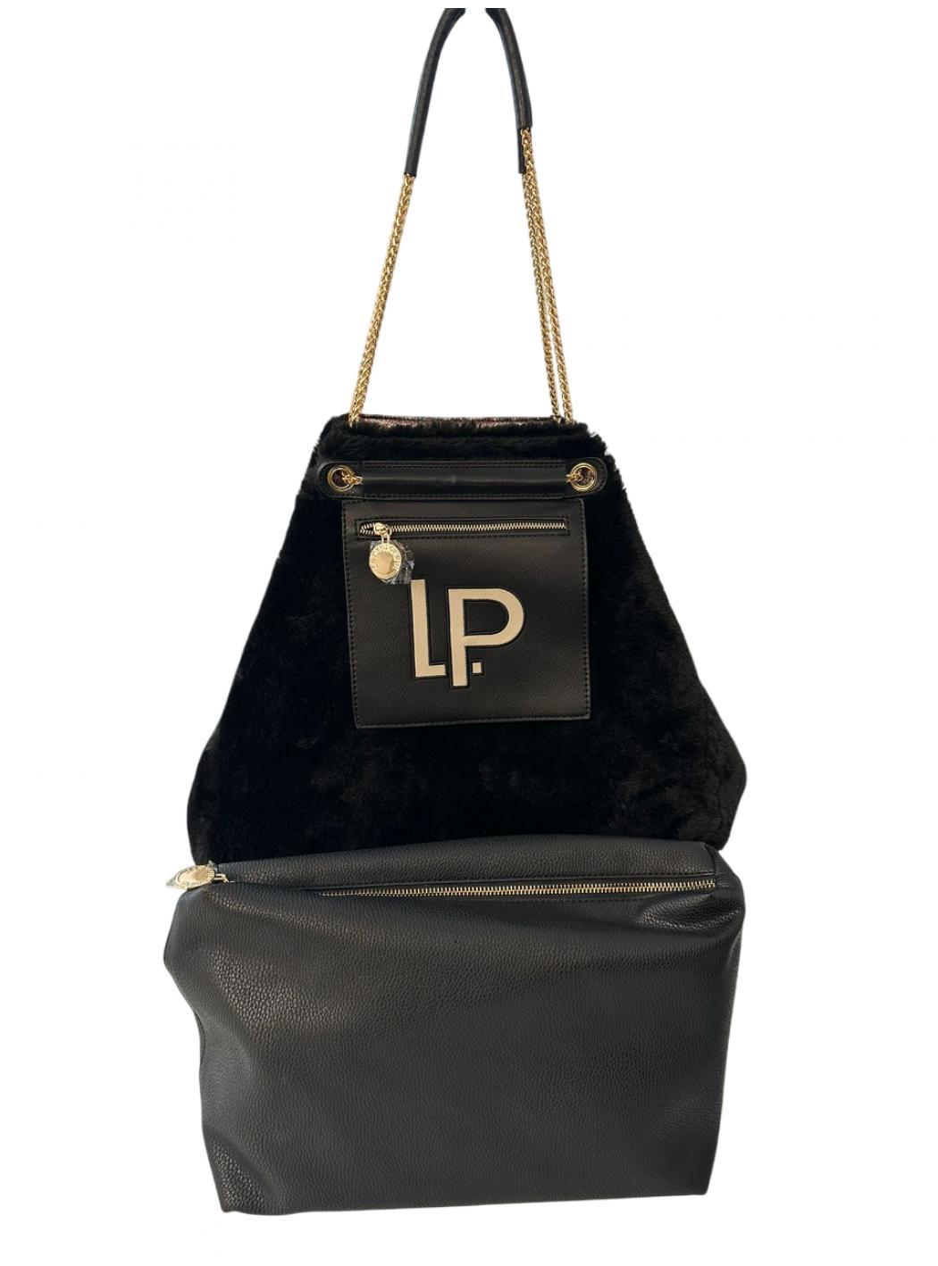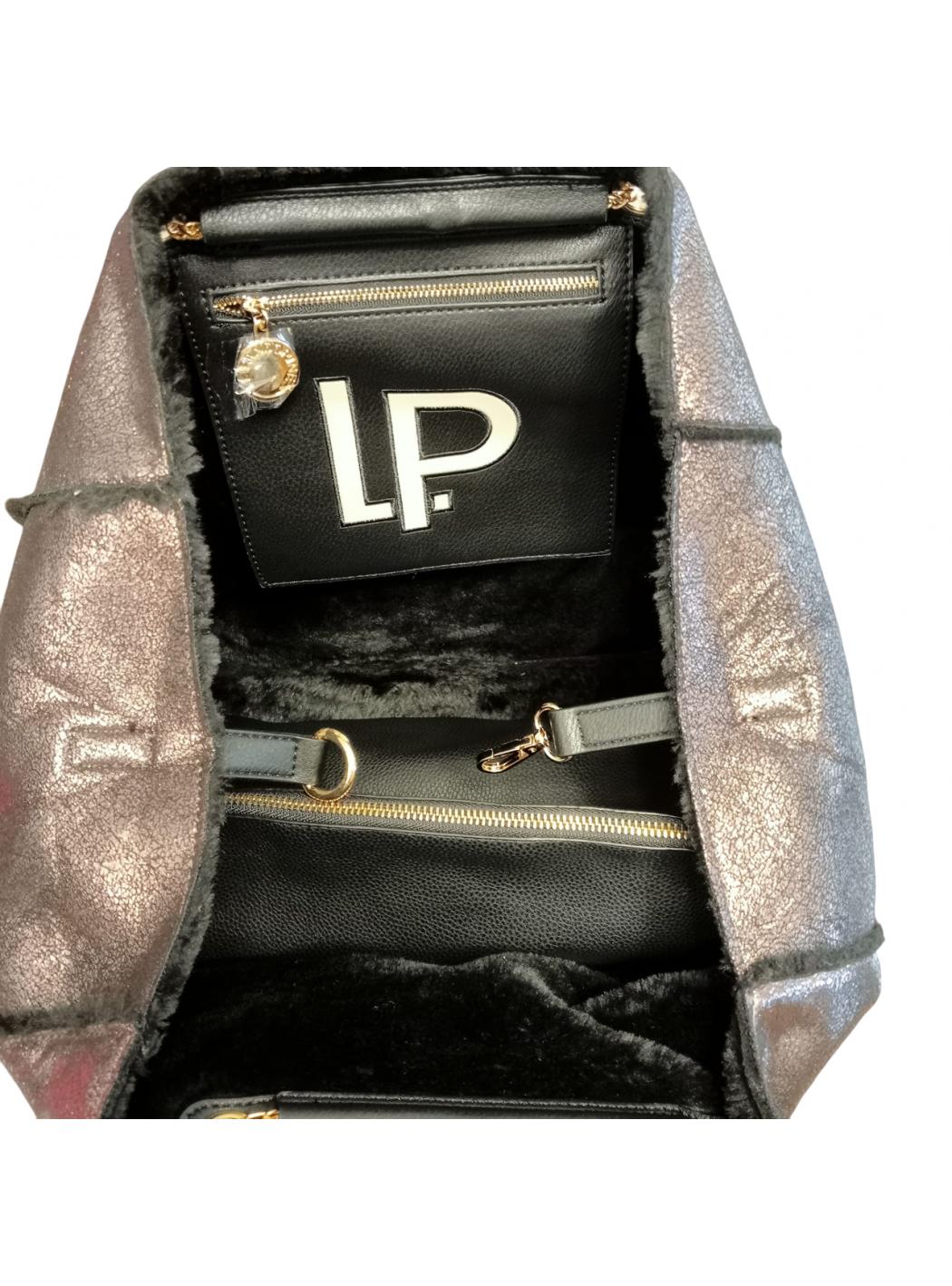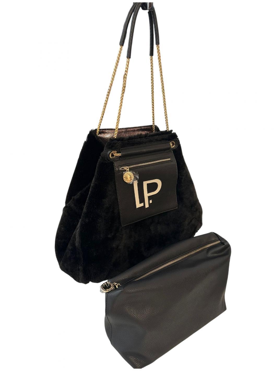 Shoulder bag Pandorine over size reversible with removable clutch. Bronze eco-leather and black synthetic fur.