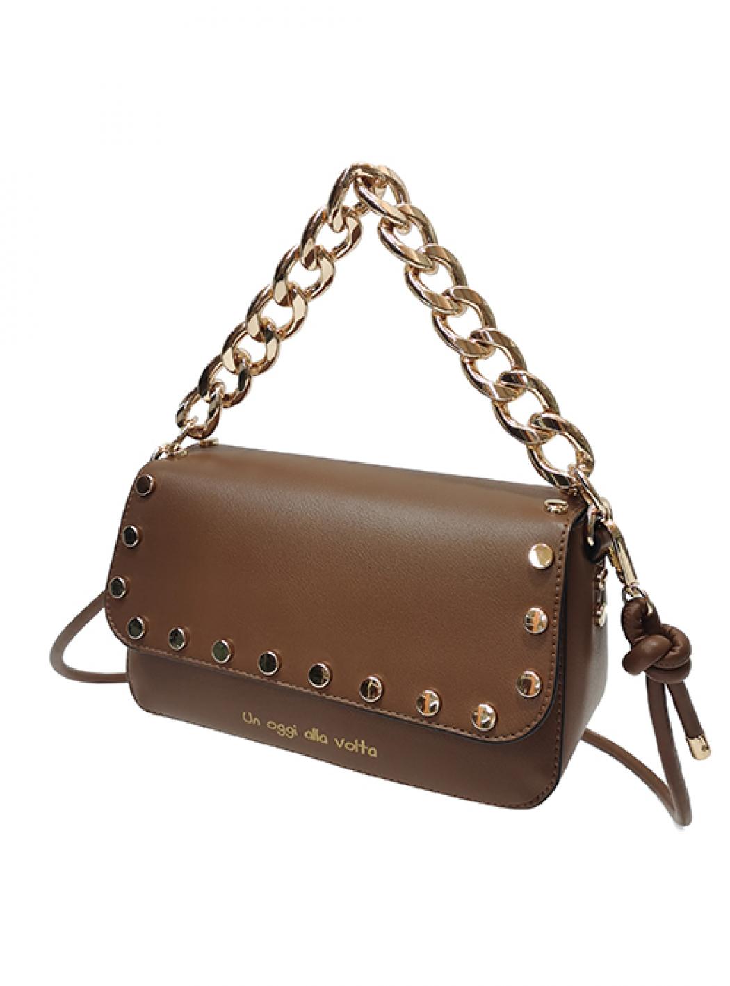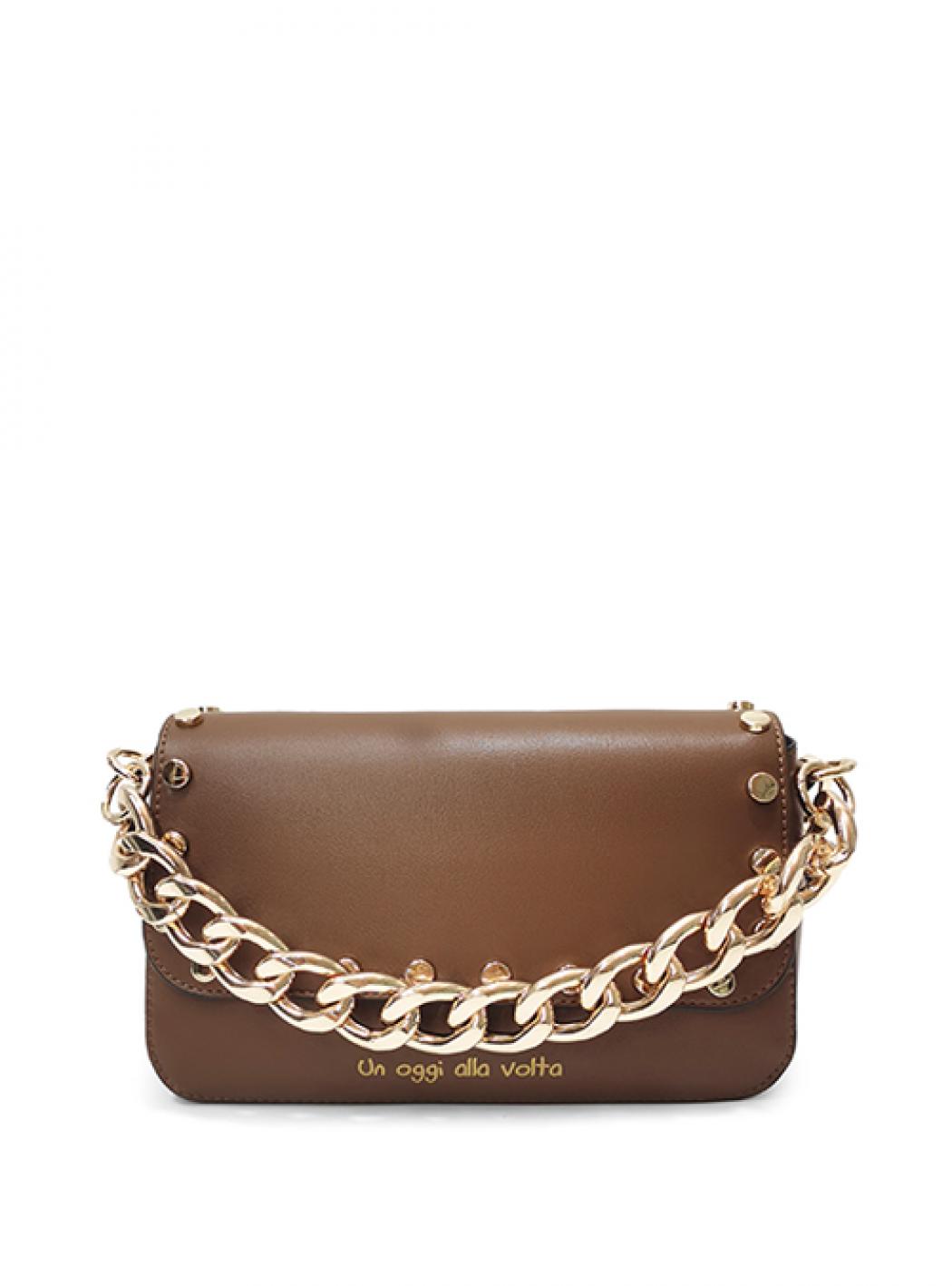 Pochette with flap embellished with studs and closure with automatic. Golden chain handle with snap hook and non-adjustable shoulder strap. Claim and logo printed on the front. Measurements: 23 x 10 x 17 cm.