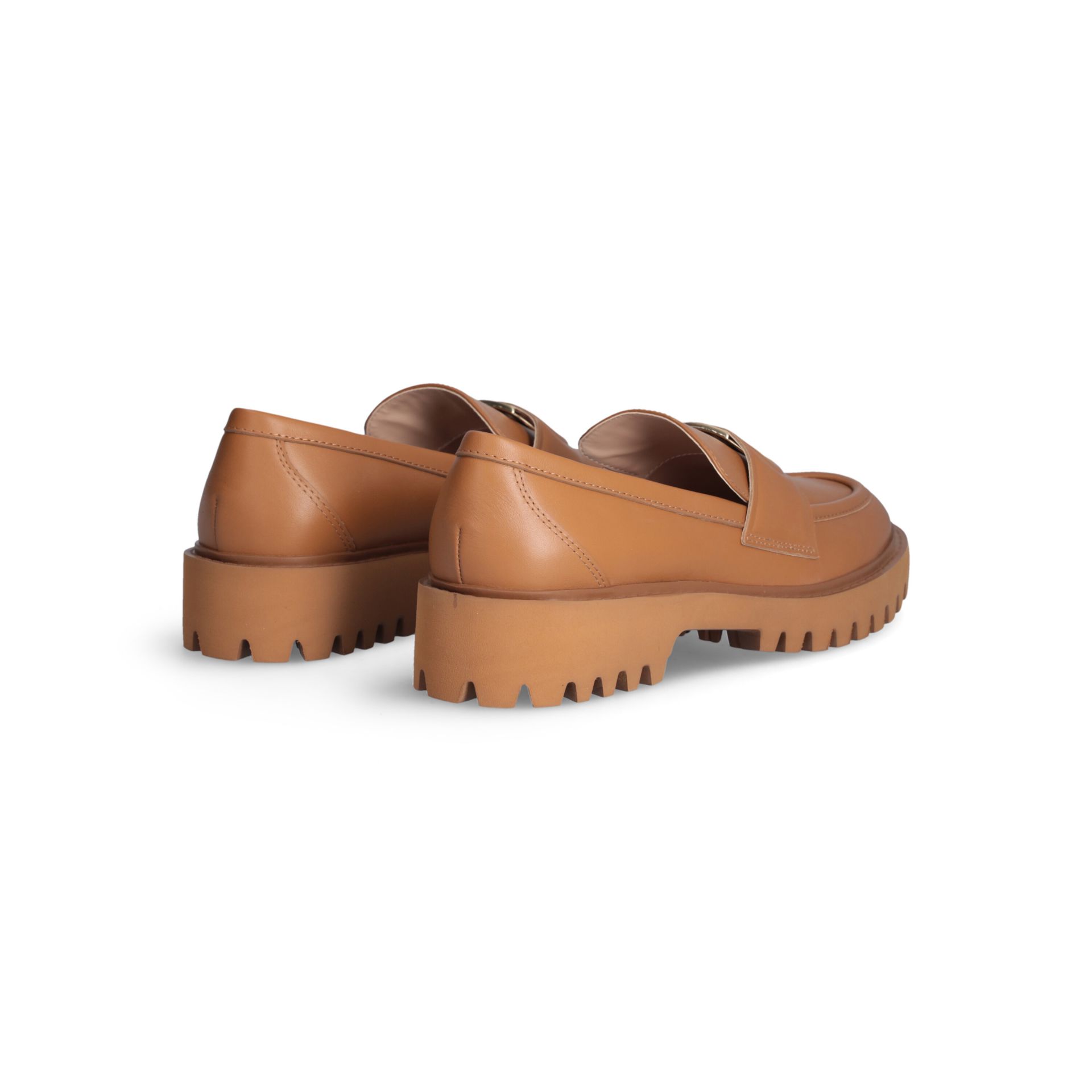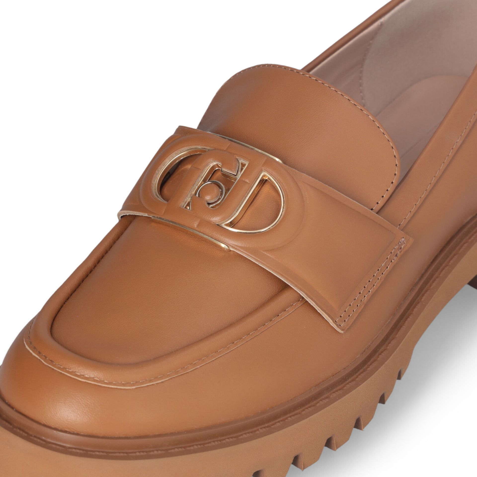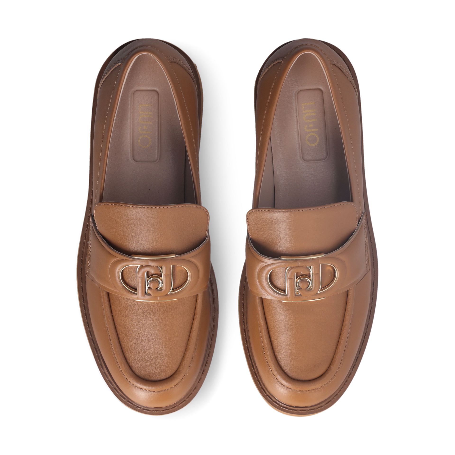 Women's Moccasins Liu Jo model Cora 12, article code sa5047P010201111, made of brown hazelnut leather with bold and contemporary design. The minimal upper is enriched by an elegant clamp with maxi logo, for a distinctive touch that enhances every outfit.