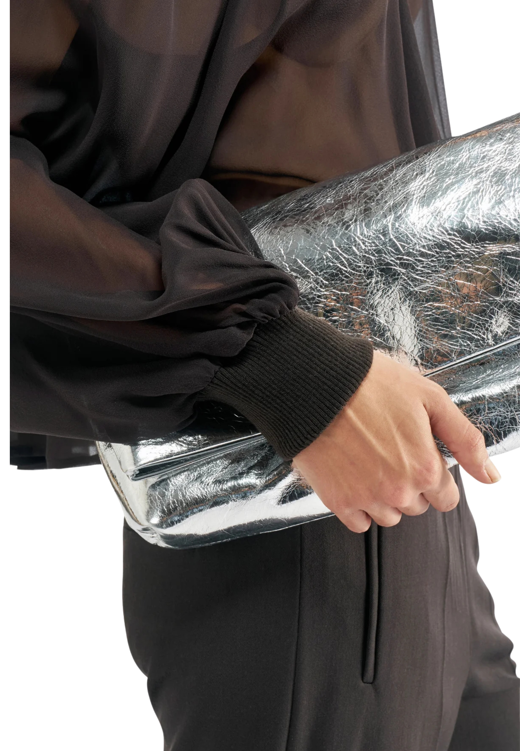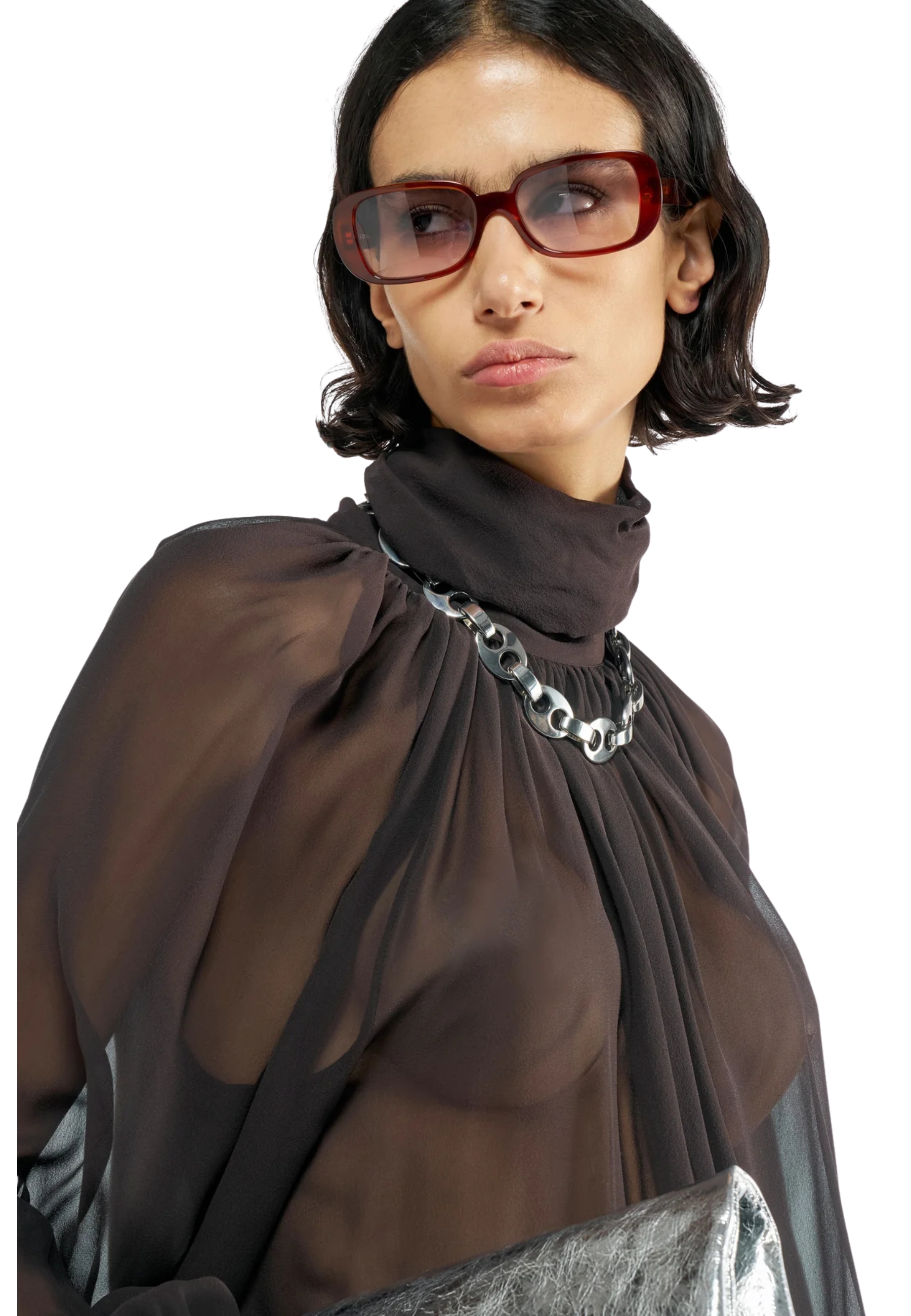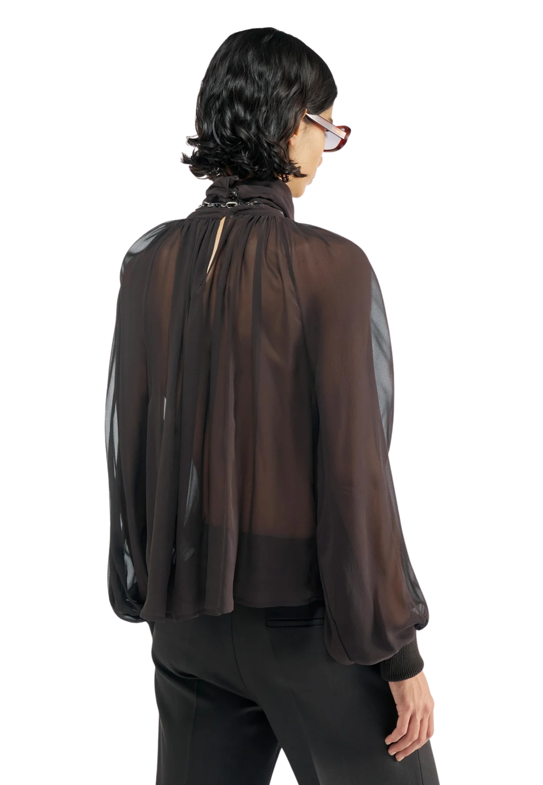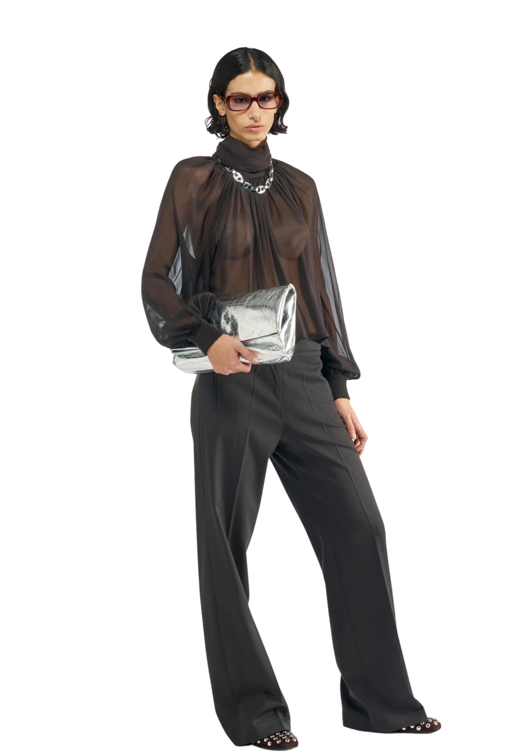blouse in silk georgettes with high neck draped, long sleeve and elasticized cuffs in knit. soft fit.