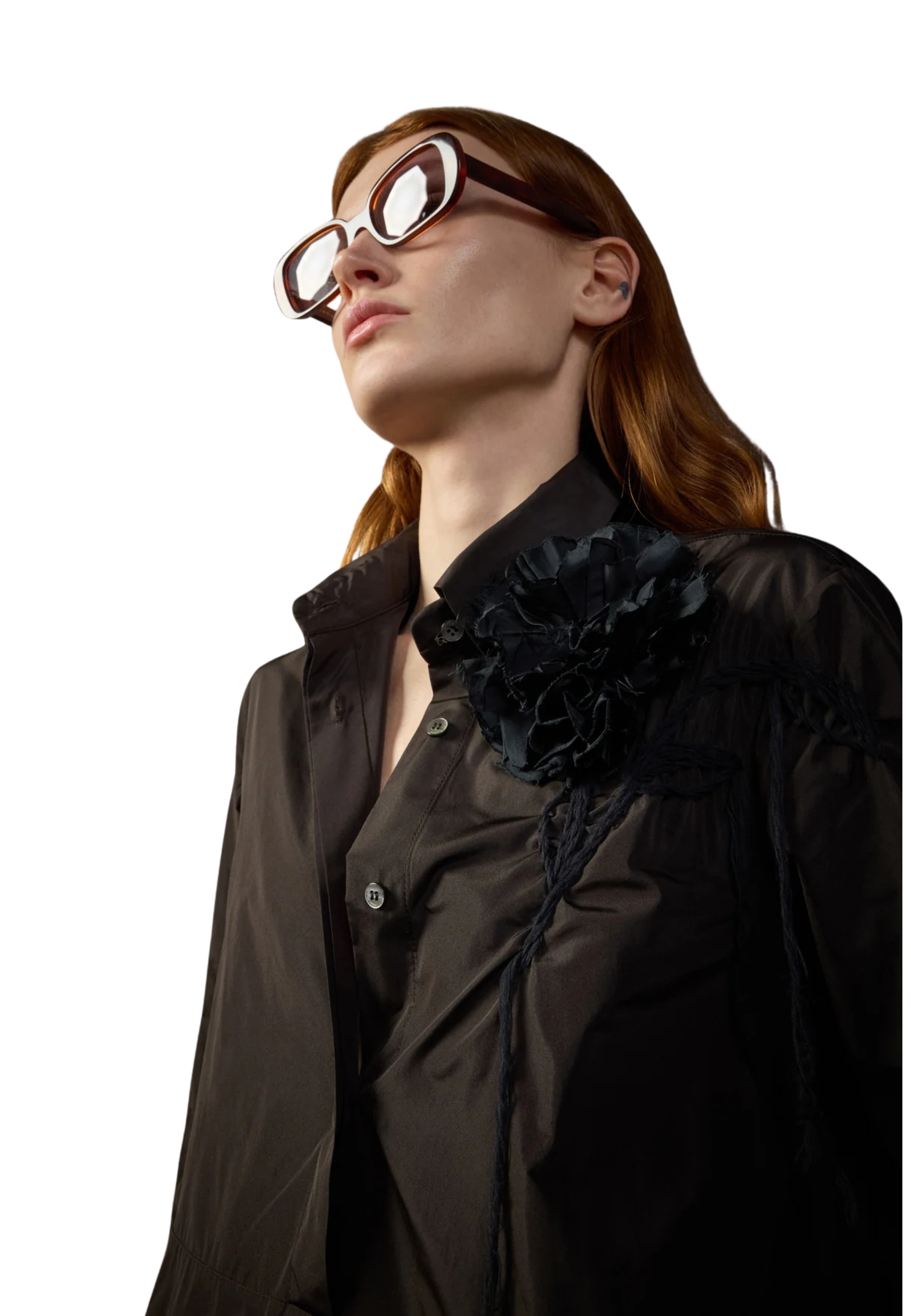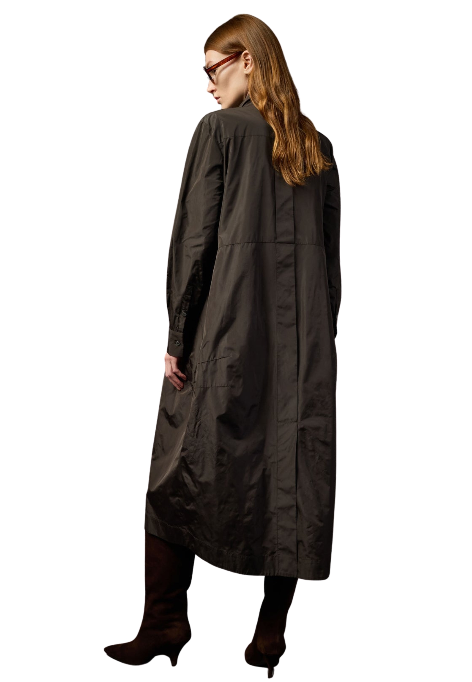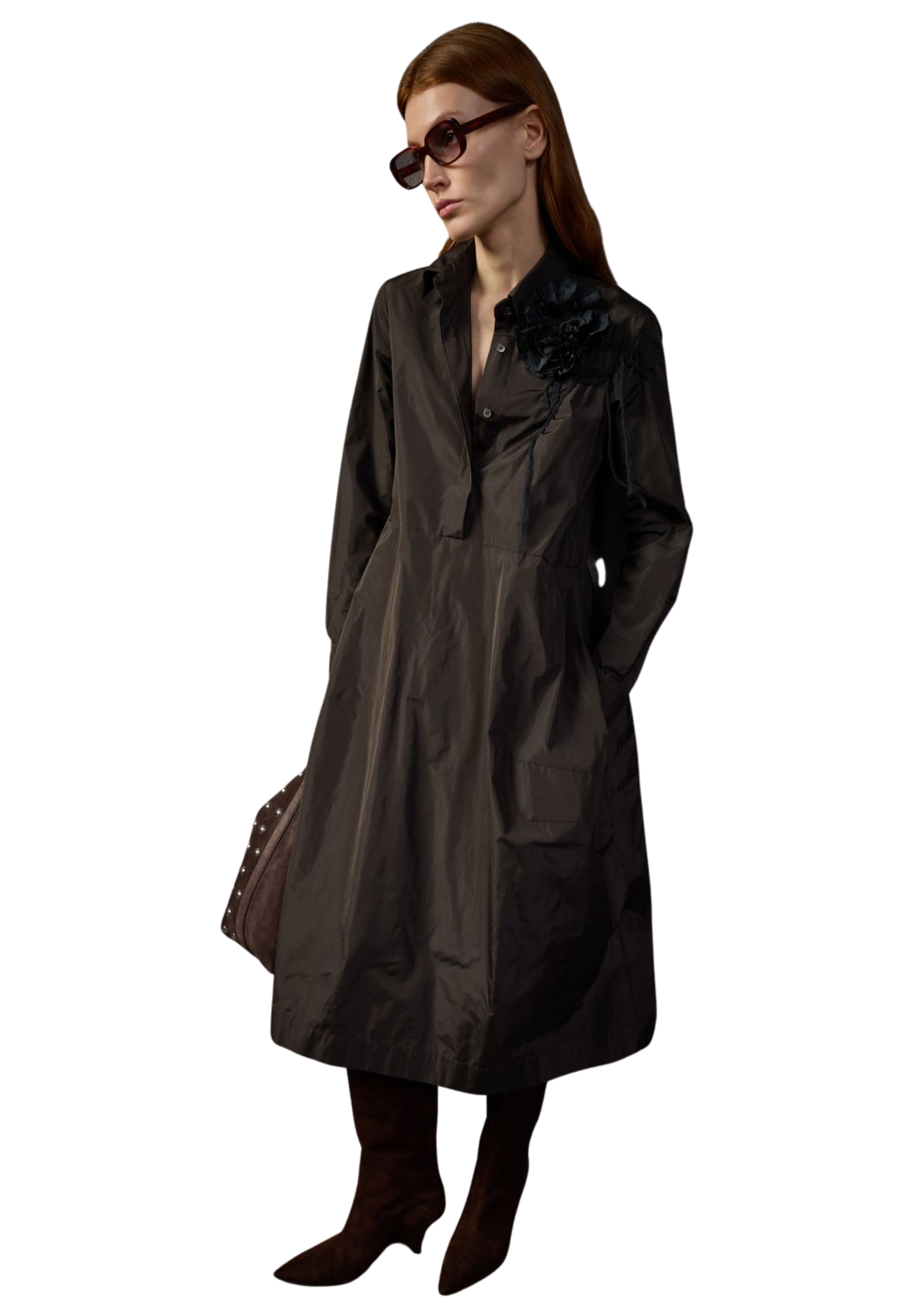 The midi dress with long sleeves, made of a light and slightly glossy fabric, probably taffeta. It has a flushed line and a clean cut, with V-neck and a partial closure with buttons. A floral tone decorative detail is applied on the left shoulder, adding a sophisticated touch. The look is completed by knee boots in dark brown suede and oversize sunglasses, for an elegant and discreet effect.