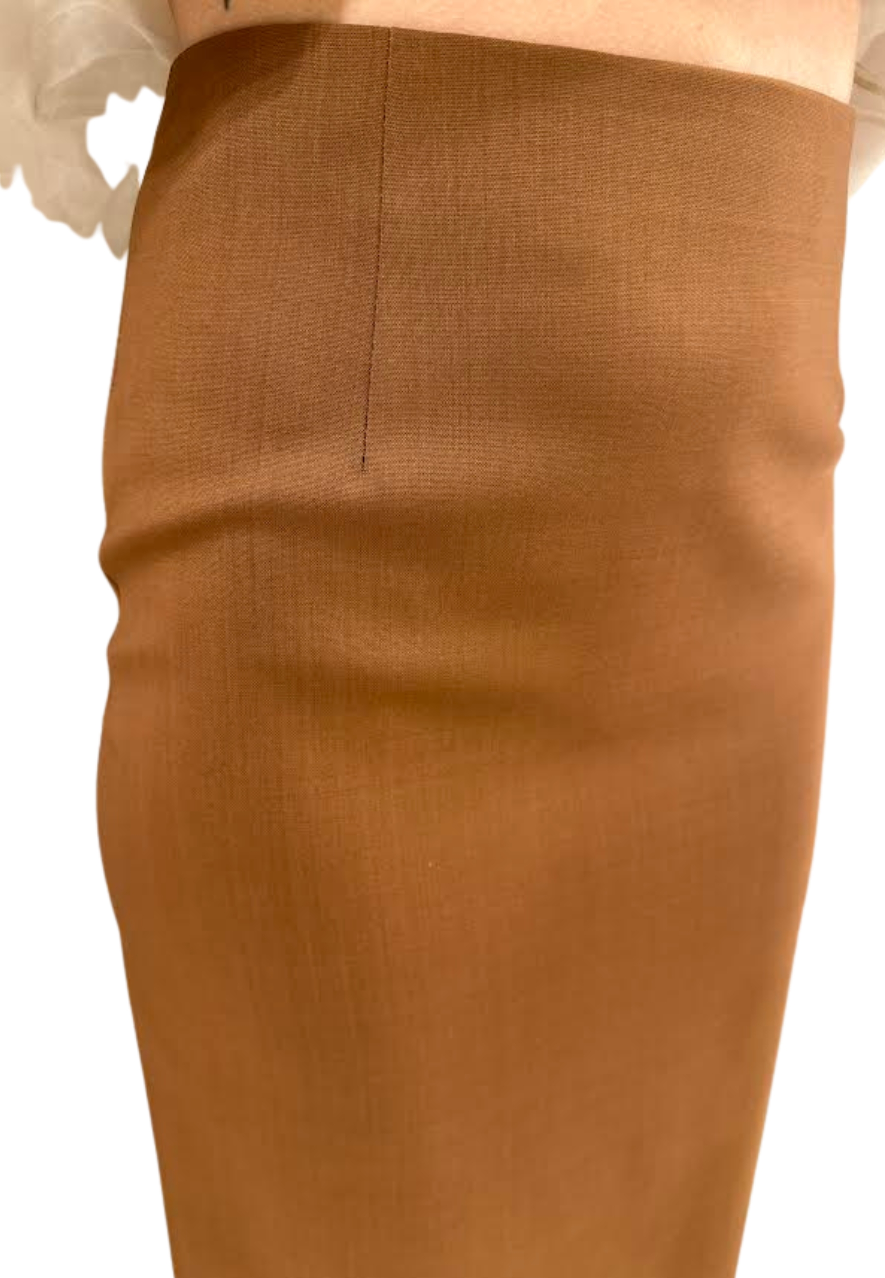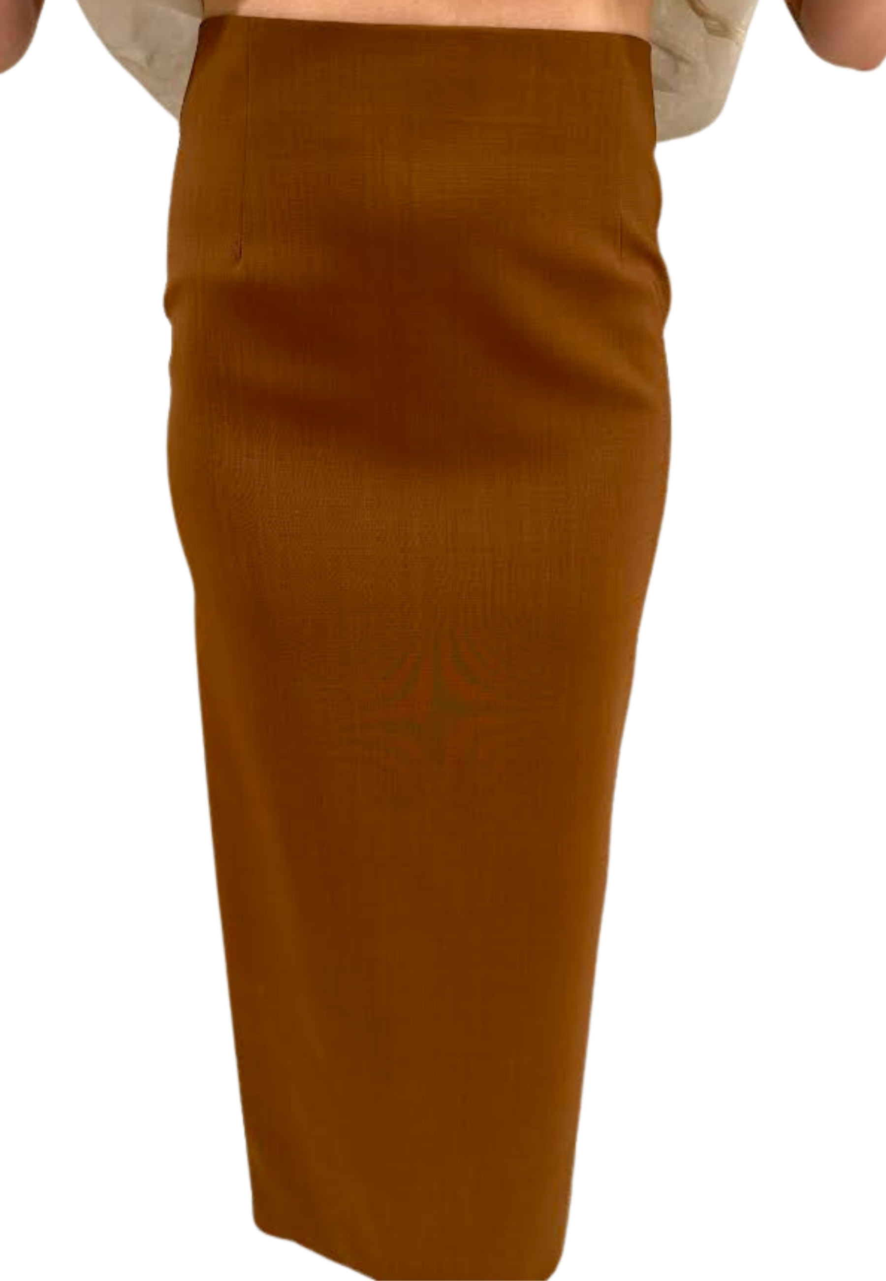 High waist longuette skirt, caramel color, adherent and long until the ankles. Simple line on the front, deep slit and zip on the back. Elegant and feminine.