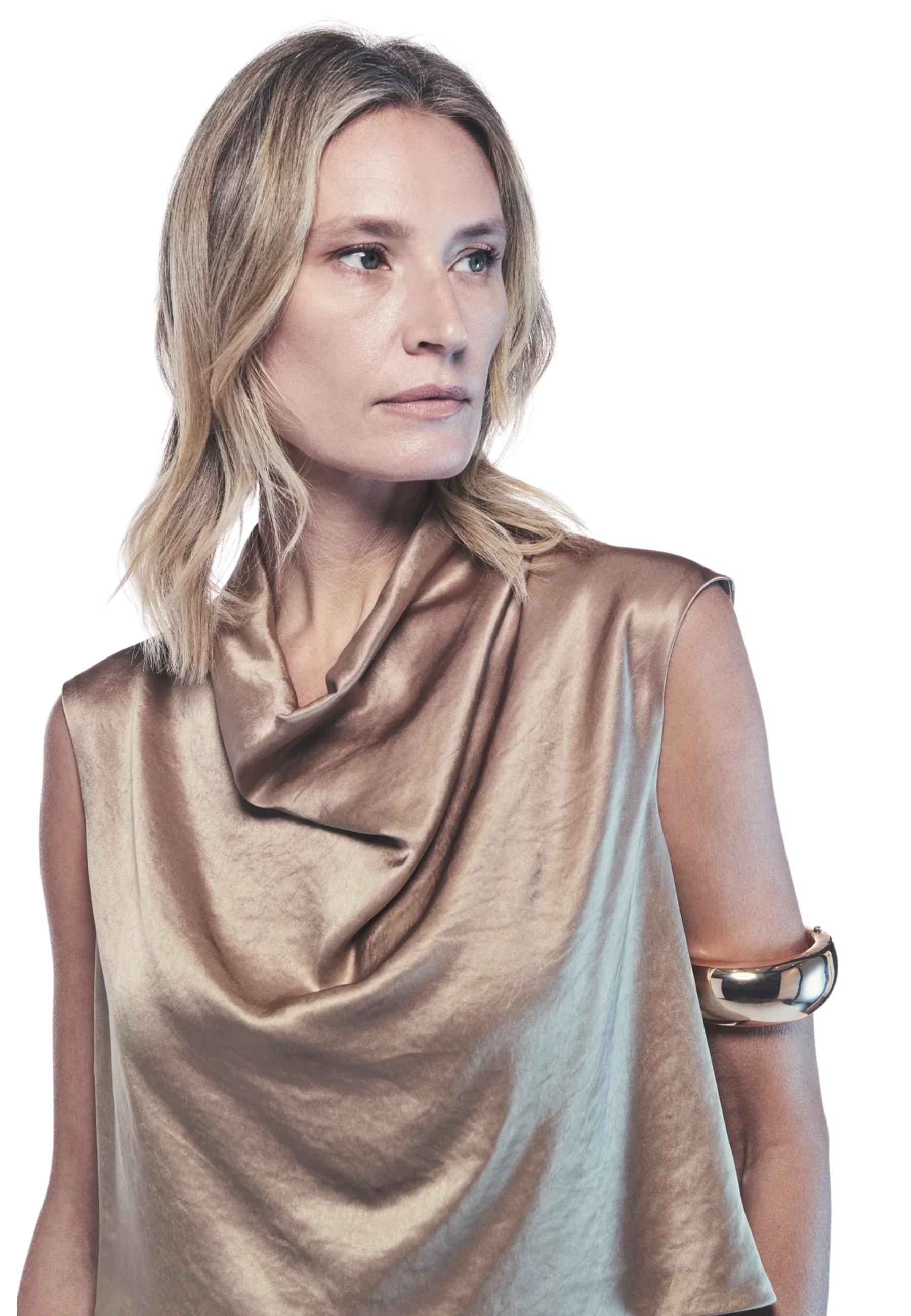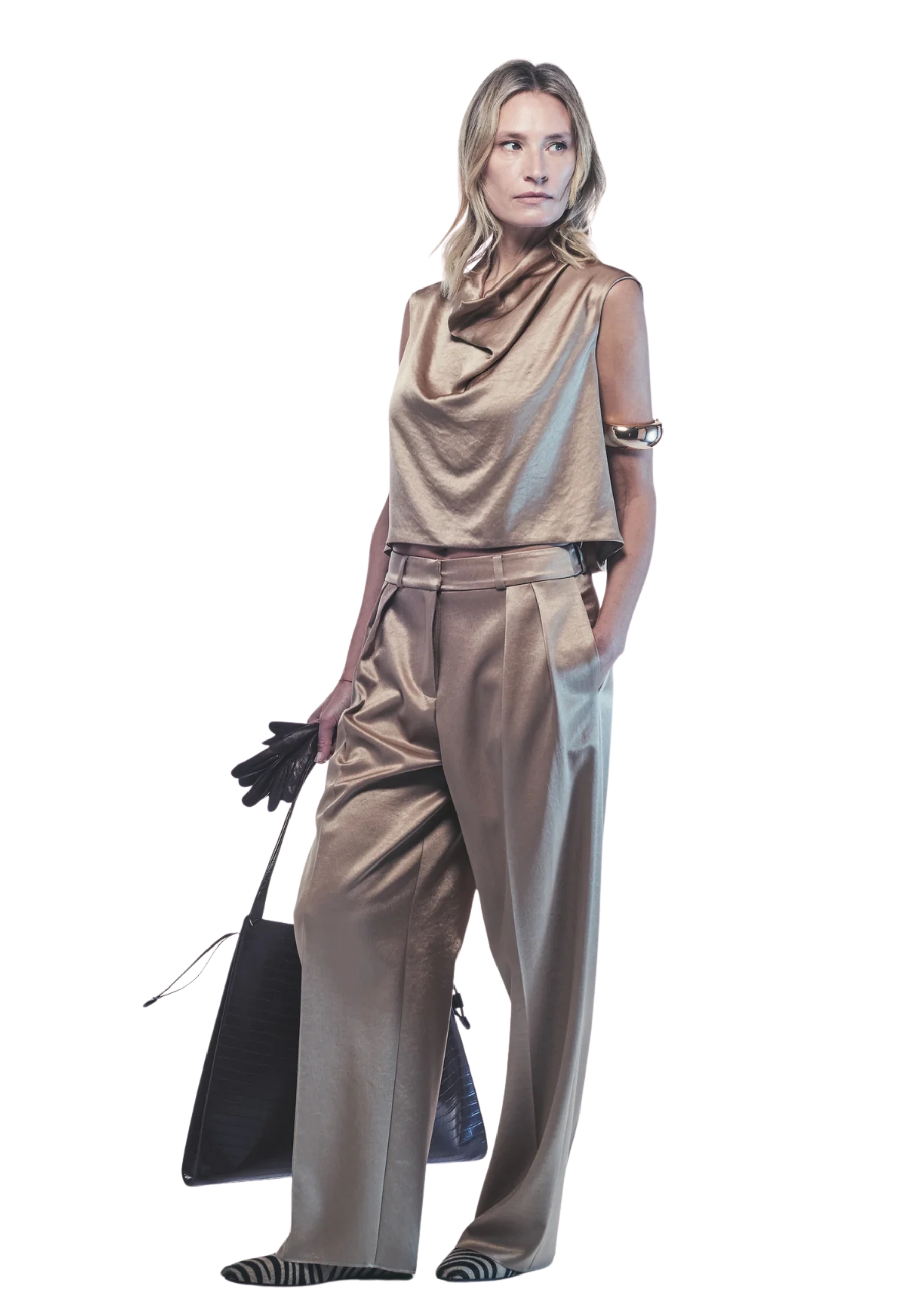 blouse in satin, characterized by a draped neckline that gives movement and elegance. minimalist line And comfortable fit for a versatile and sophisticated garment.