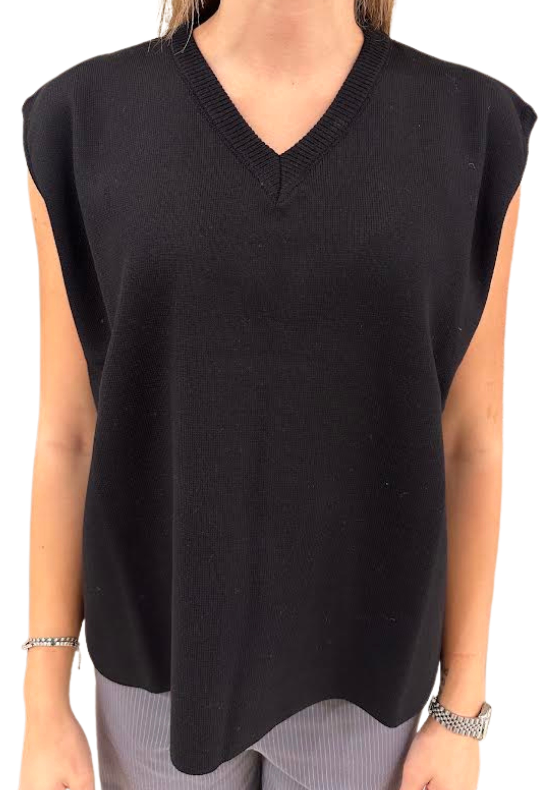 The vest it is left, in black knit, with V neckline and wide fit. It has an essential and versatile style, suitable for casual or elegant look.