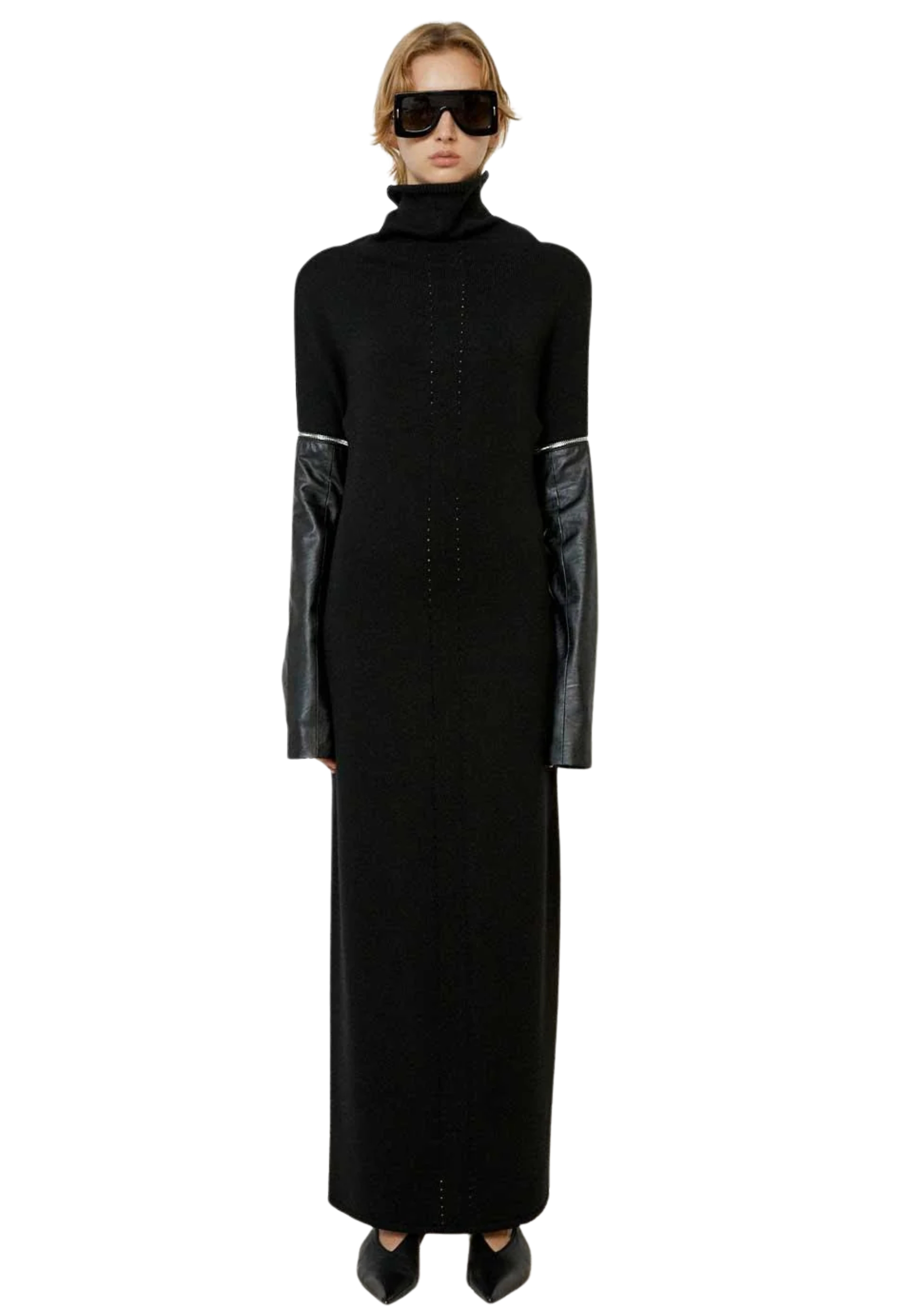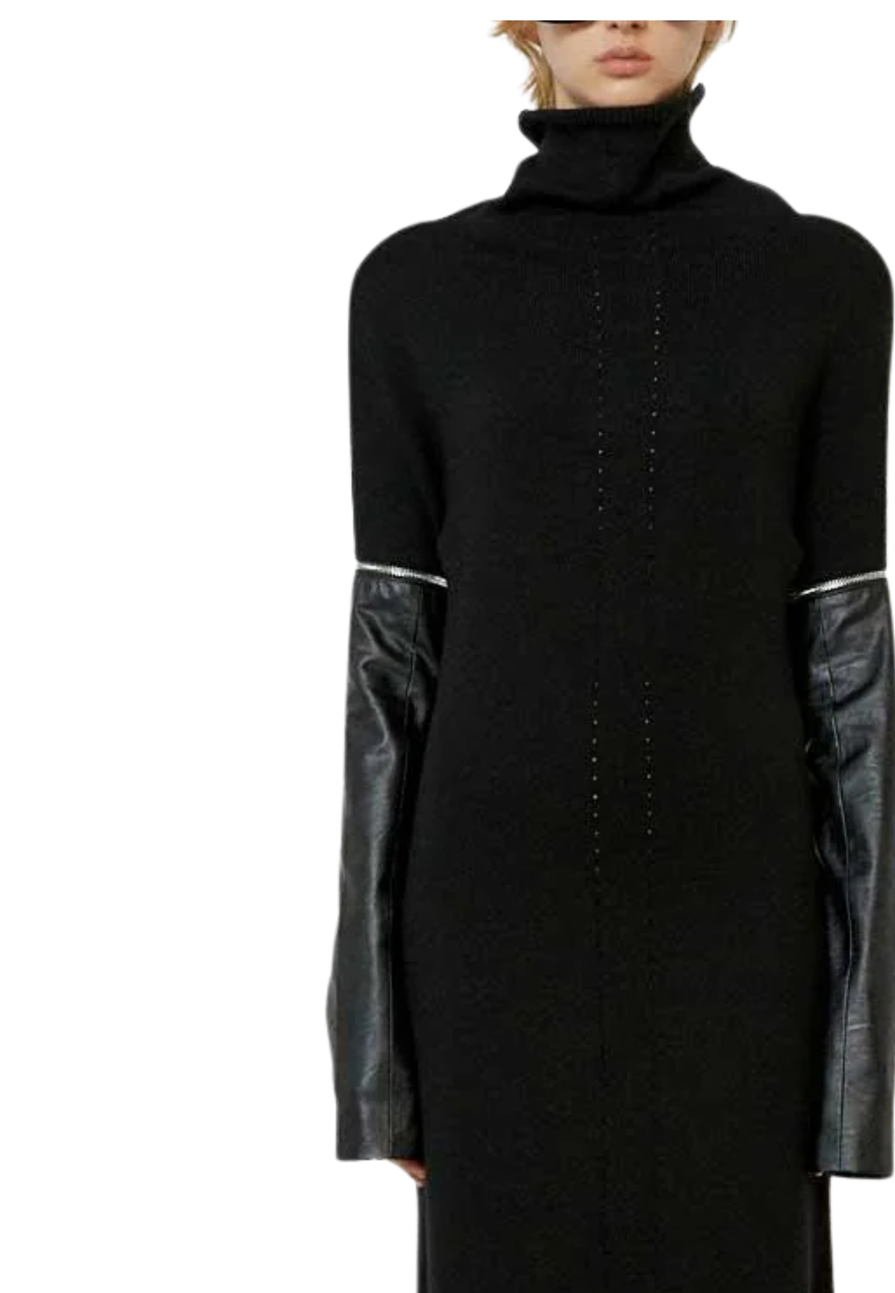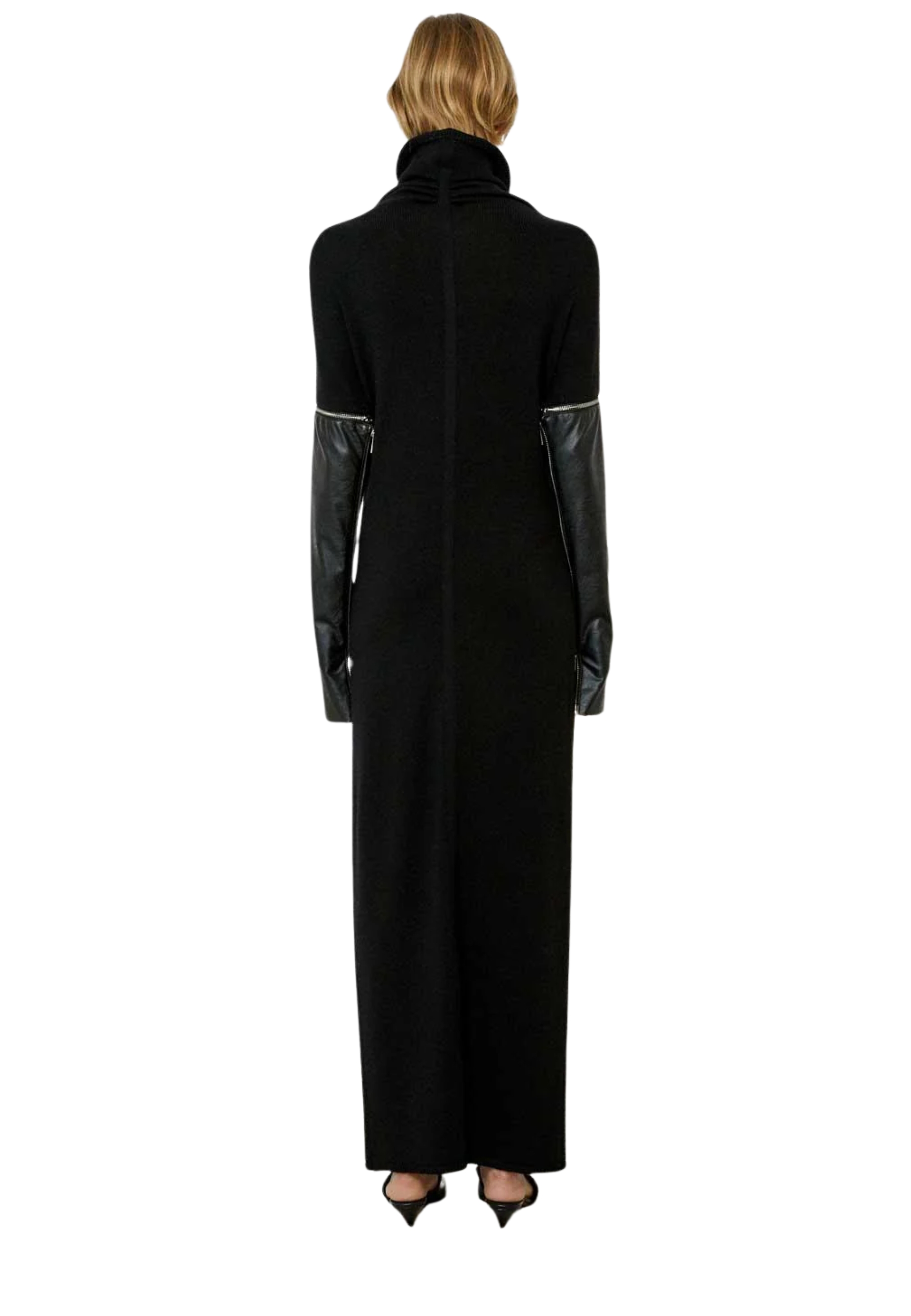 long dress in pure wool with turtleneck,maniche in eco-leather with metal zip And spread in the center behind.