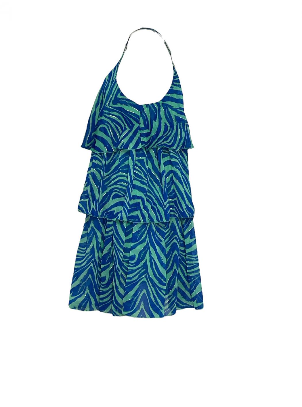 Mini dress with palm print, overlapping of volant on the American neckline, thin shoulder straps.