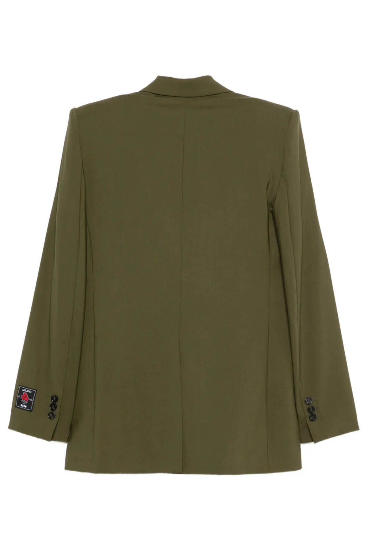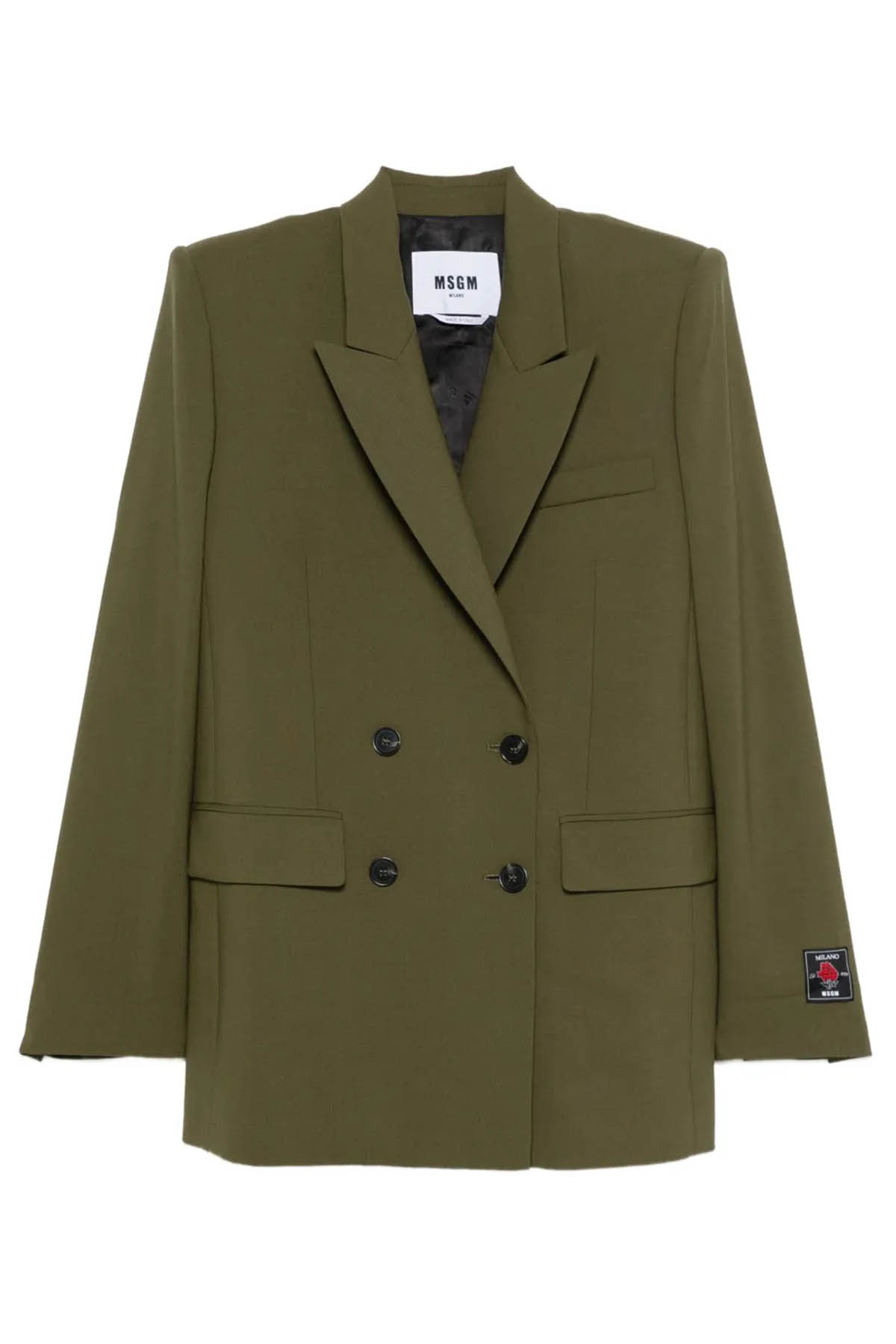 Double-breasted jacket made of cool wool with peak lapels and structured shoulders, flap pockets, a breast pocket, a front button closure, a center back vent, and an MSGM label detail at the cuffs. Composition 96% WV / 4% EA