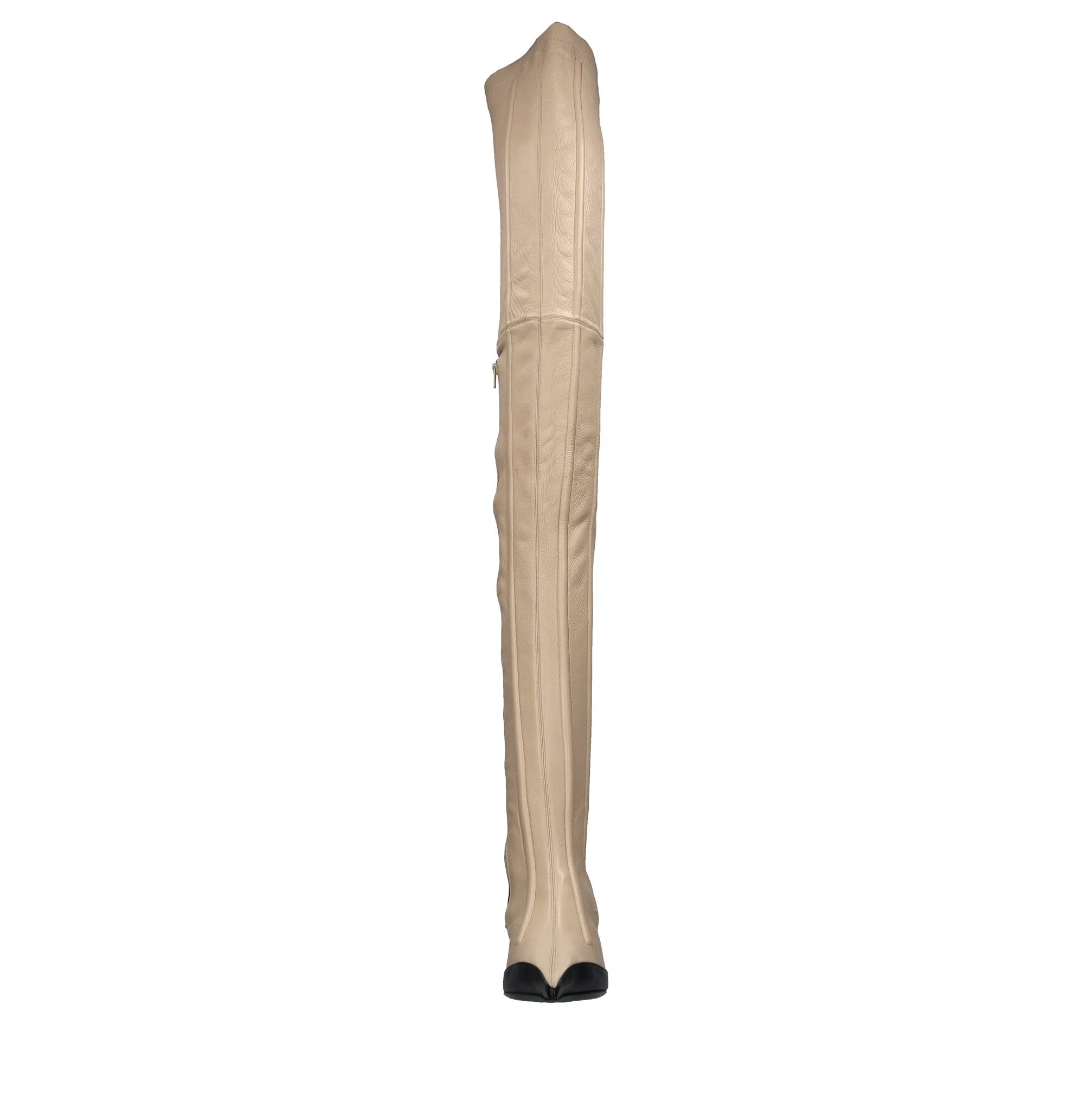 Leather and faux leather cuissard boots. Stretch. Fabric and leather inner upper. Rubber and leather outer sole. Sample. Small imperfections on the leather. 77 cm shaft. Internal side zip. Shipped in a plain box.