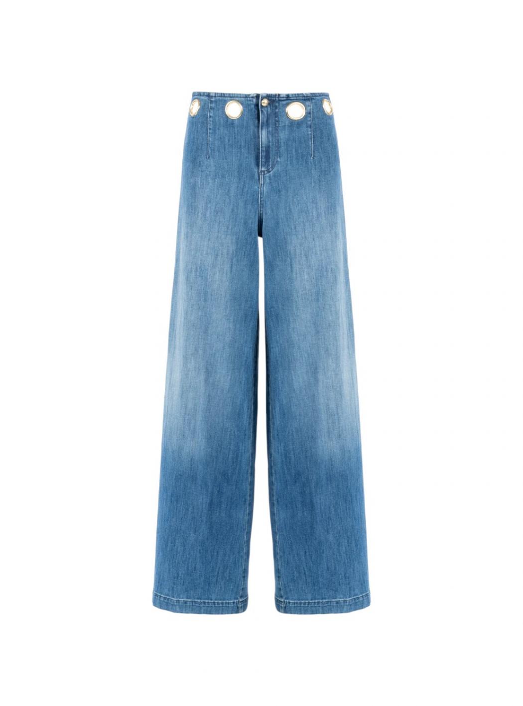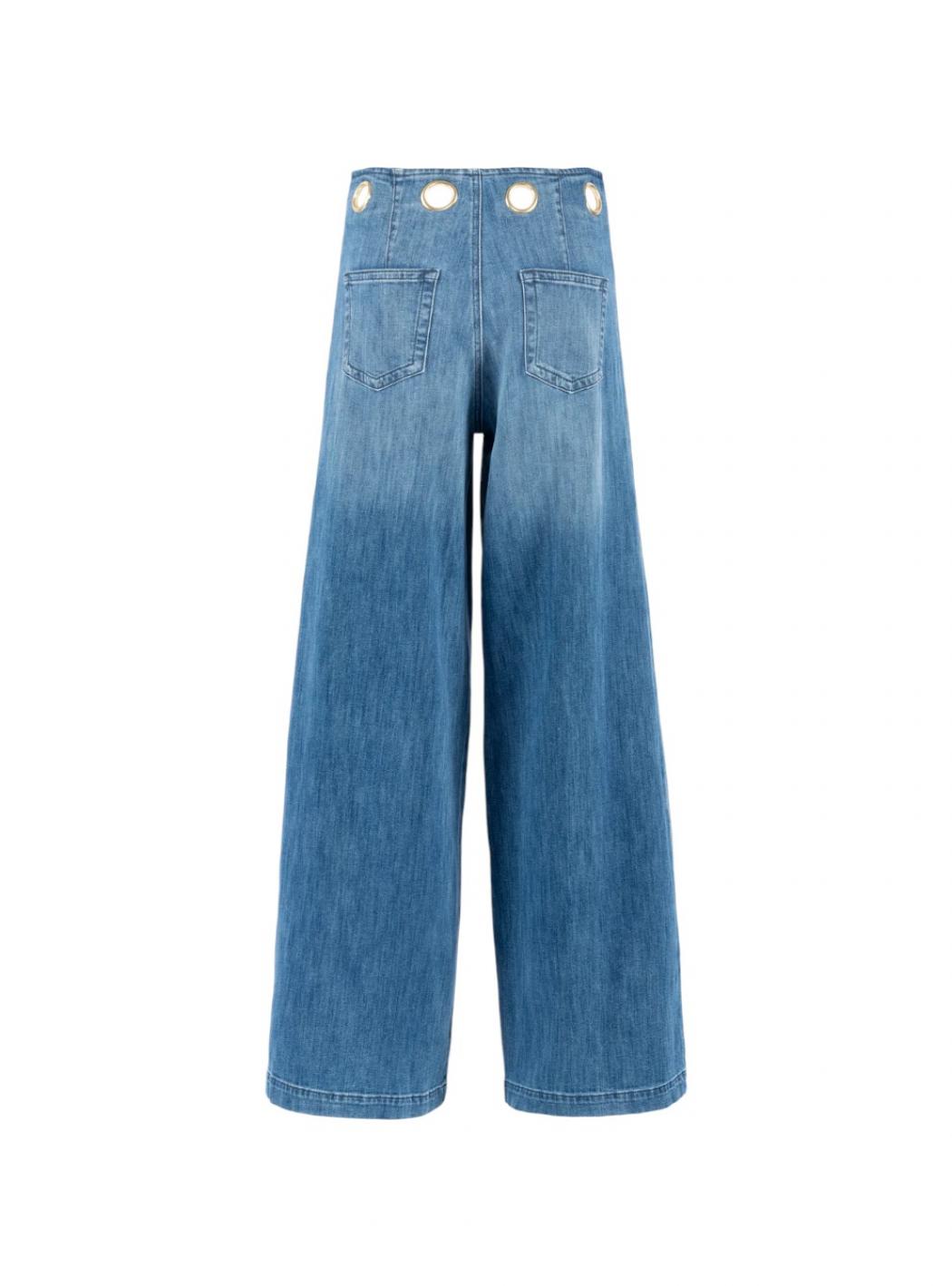 Denim wide leg in comfort fabric, characterized by elegant golden sails in life that add a touch of class. The wide fit ensures comfort and style, perfect for a casual but refined look. A versatile garment that combines practicality and trends.-98% COTONE-2% and