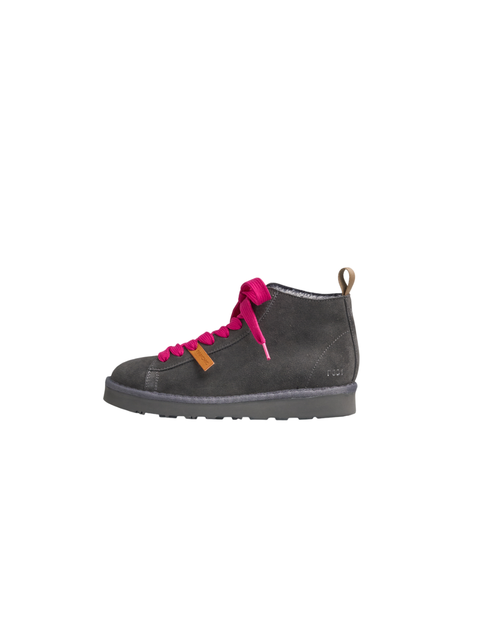 Women's P001 ankle boots with anthracite gray suede upper, fuchsia open-weave laces, and faux fur lining. The P001, with its clean lines, represents the perfect balance between design and comfort. Lightweight 2.6 cm EVA sole with embossed Panchic logo; Eight-hole lace-up closure without eyelets; Fur-effect fabric lining; Removable faux fur insole; Comfortable internal elastic bands for ease of movement and to secure the tongue; Replacement laces: matching the color of the sole; Materials: 100% leather.