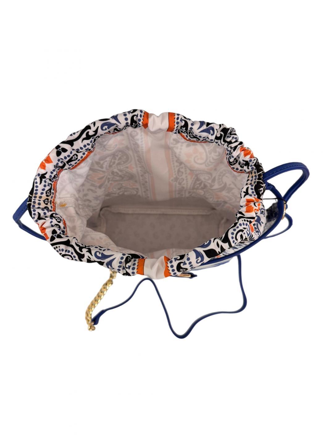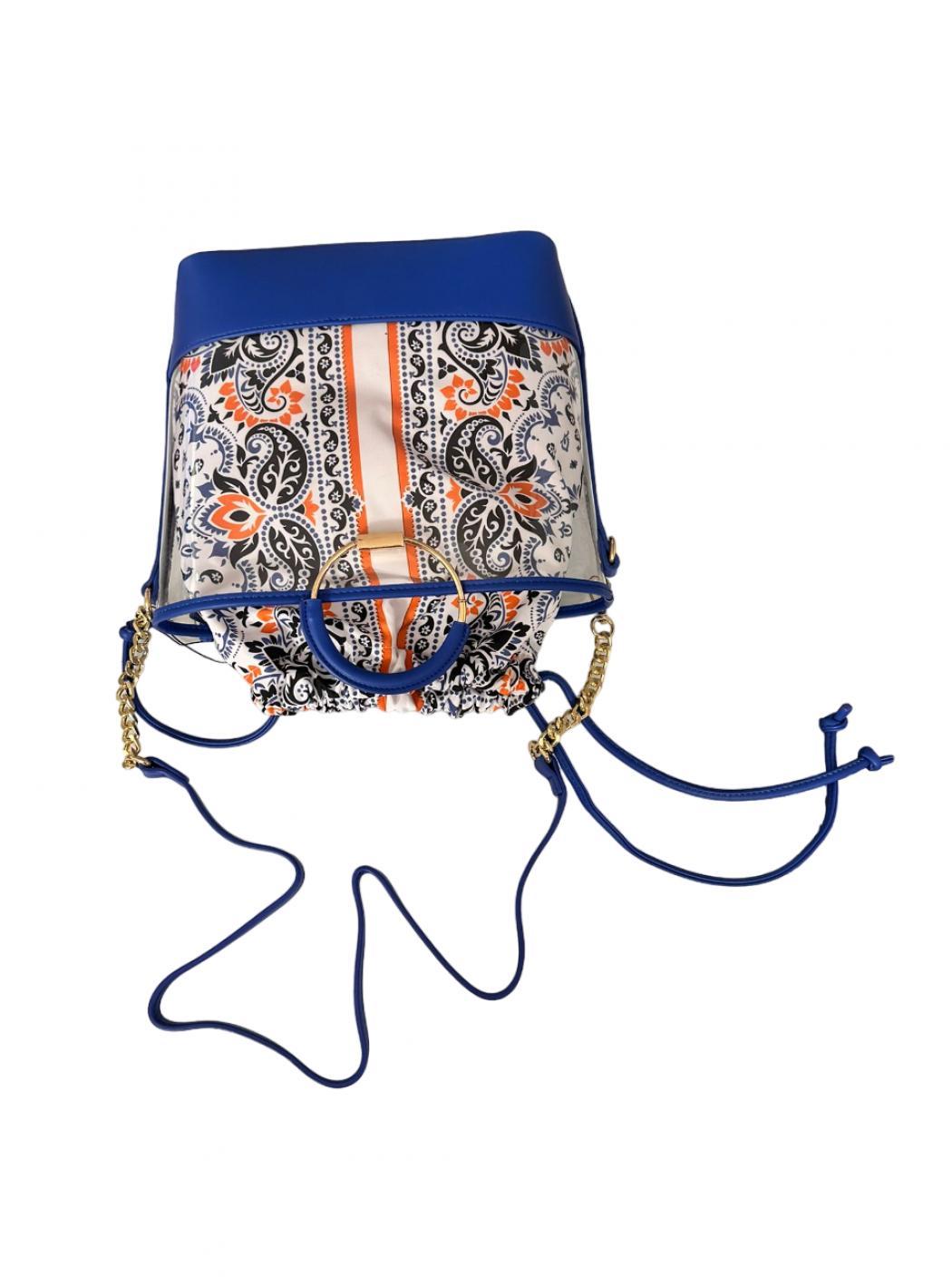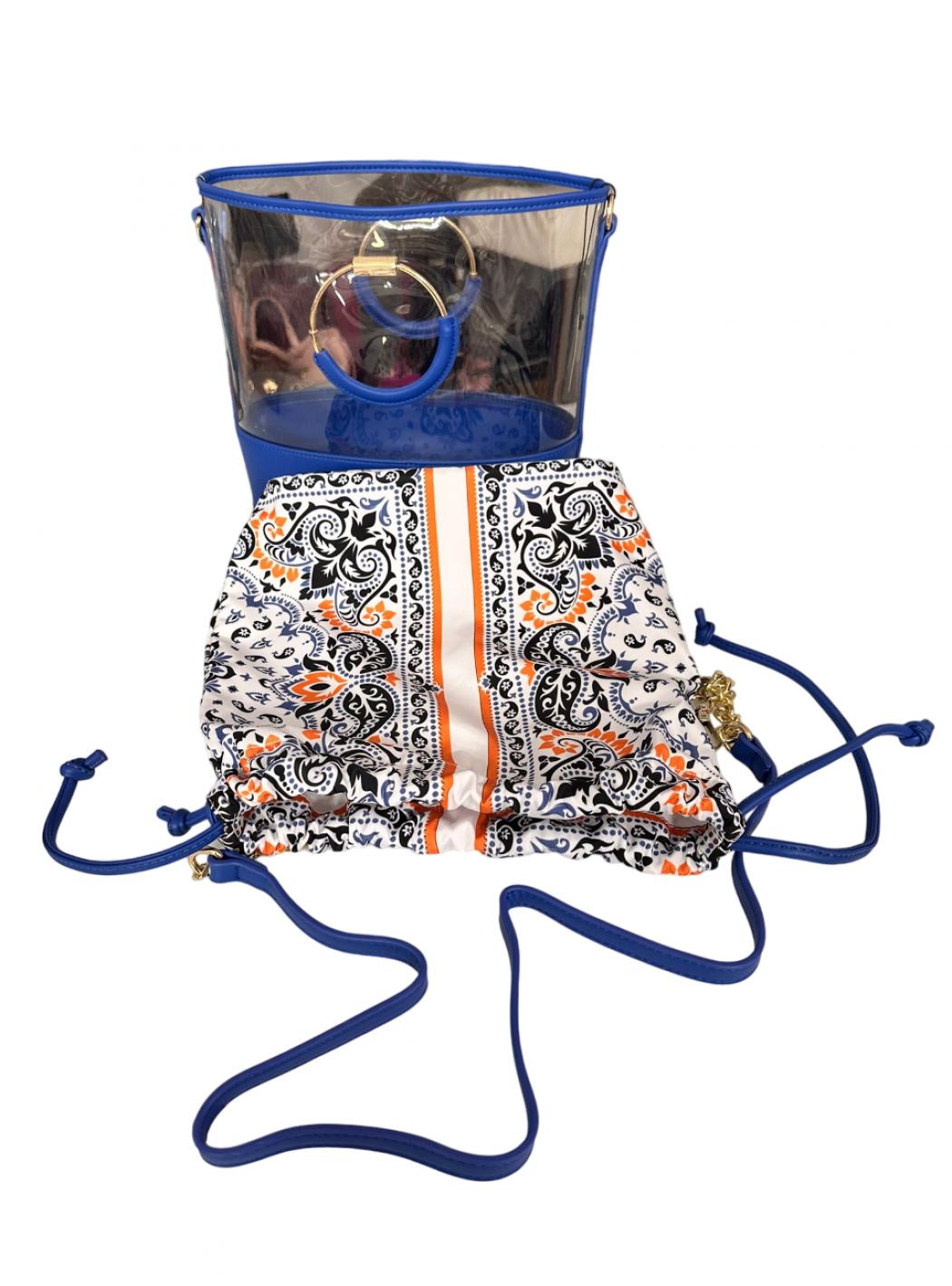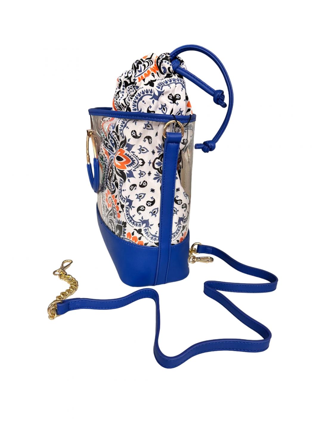 Clear bucket bag with rigid bottom in electric blue eco-leather. Golden rigid frames and in electric blue eco-leather and shoulder strap with chain and always electric blue eco-leather. Bag removable pattern in washable fabric.