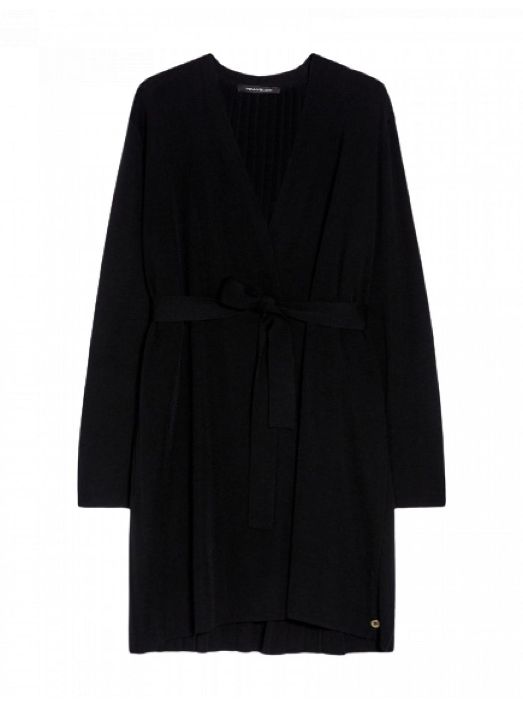 Cardigan in wool blend with plissé effect on the back. It has straight lines, soft and elongated. It is without buttons and comes close to the body with the matching belt, to be bored in a classic way or leaving the back free.