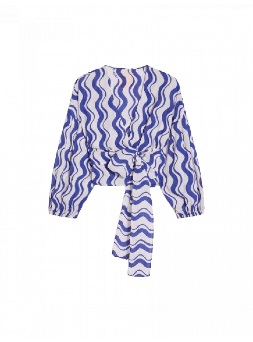 Blusa in cotton muslin. Part of the capsule Casa Soleil, made with the artist Agathe Marty, is printed in marine waves. It has a cross-cut with knots to knot and length to life. V neck, shoulders and balloon sleeves. With the matching skirt or in mix & match, air carrier also in the city.