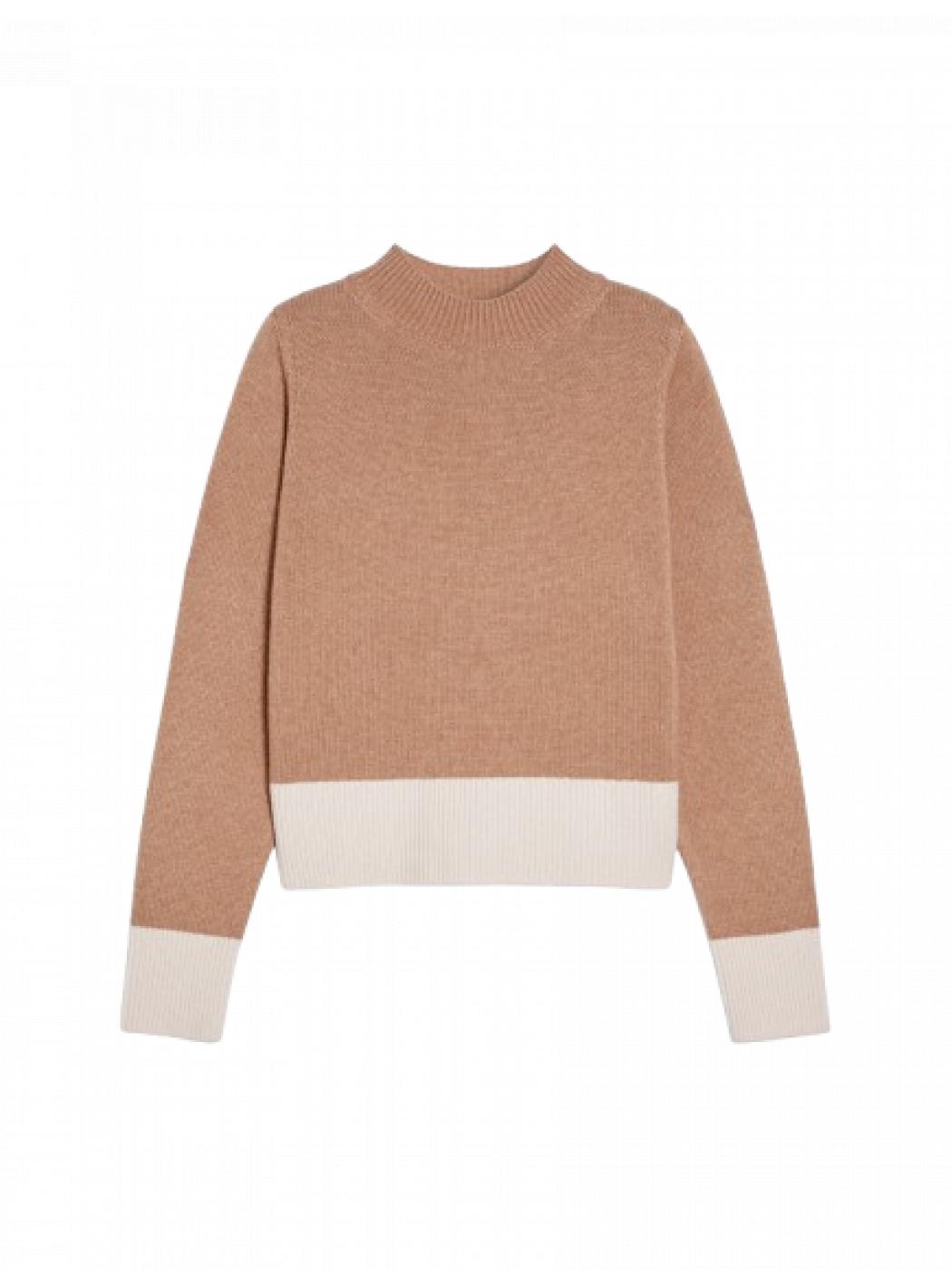 Wool blend sweater. It has a soft cut with slightly bated sleeves. Upholstered collar and high ribbed edges, length that touches the sides. To be worn both in mix & match, with trousers or skirt in the same yarn.