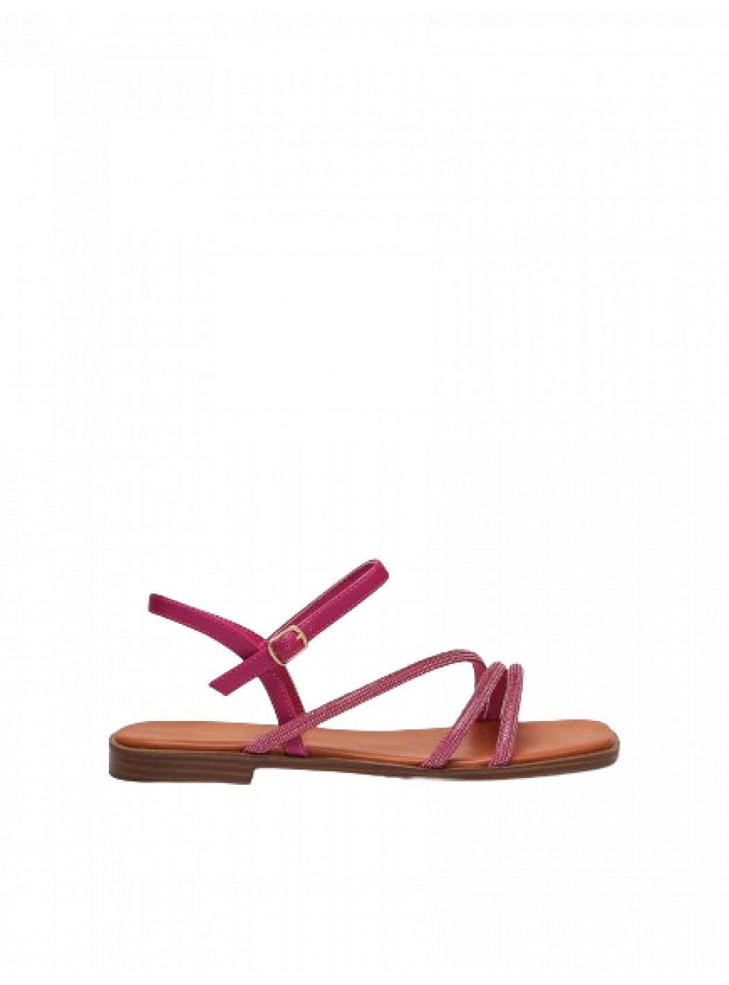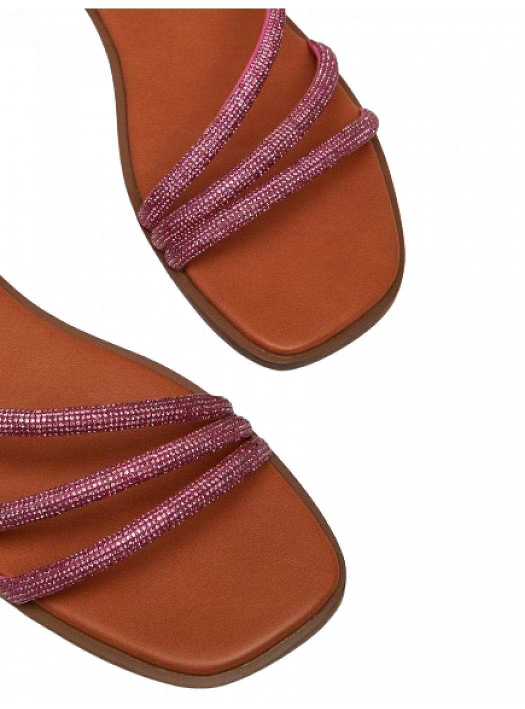 Flat sandals with stripes covered with micro strass and ankle strap. Comfort insole, raised heel and rubber sole. Comfortable and glam, they will be perfect both with the party look, both with jeans and T-shirts.
