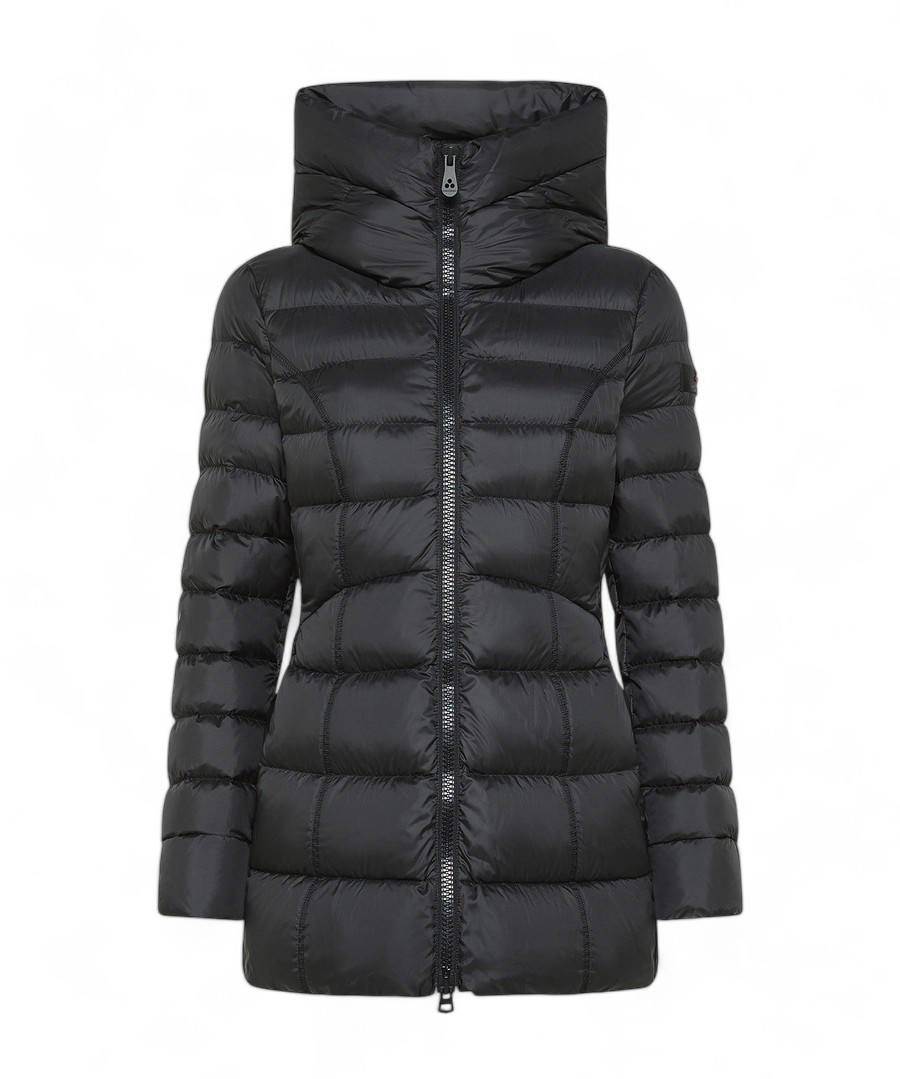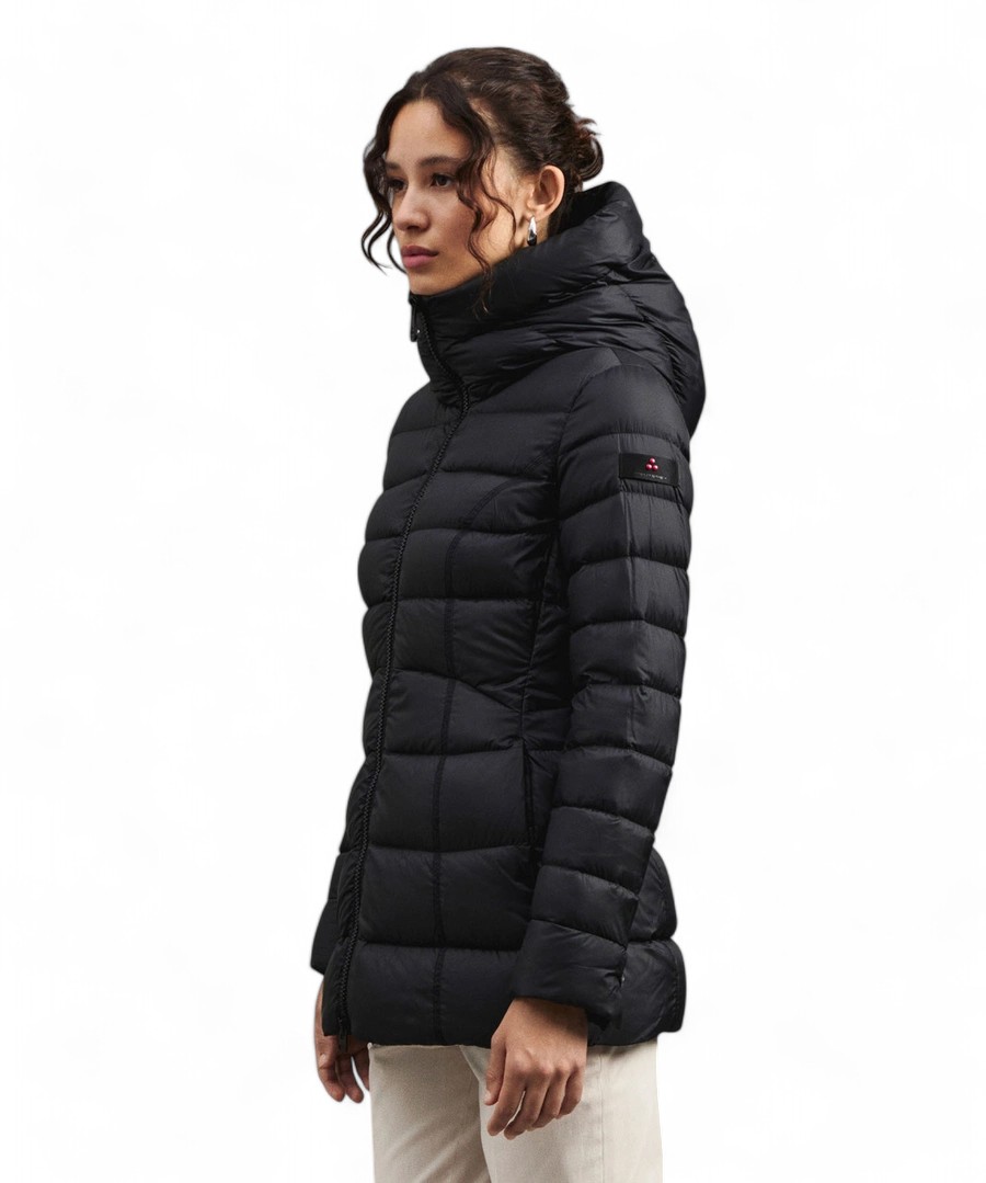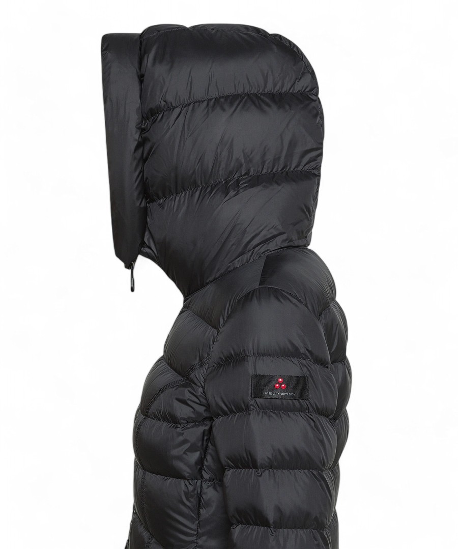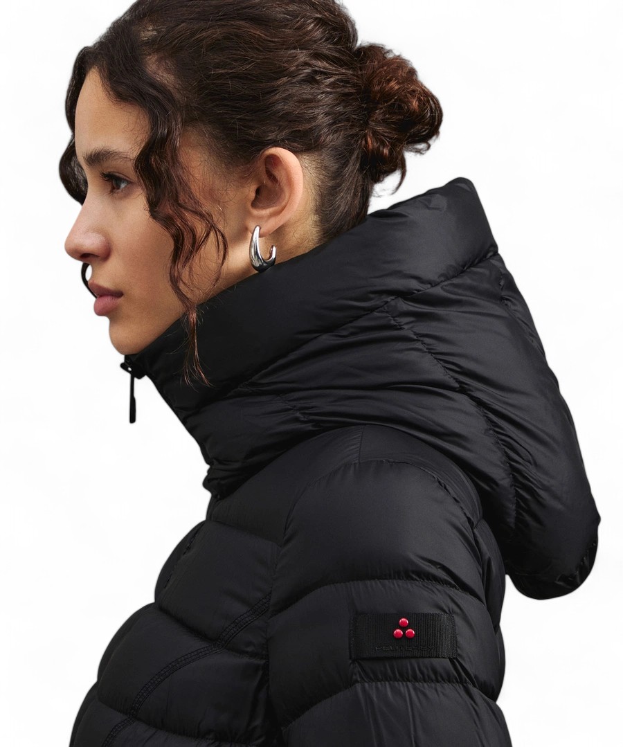 Superlight jacket made of 100% recycled polyester after consumption, soft hand and super compact structure, matt finish. Fixed hood, high crater neck, full central zip with double slider, extremely feminine cut and dry fit, underlined by the presence of more or less wide stitches that enhance the silhouette and a stitch that emphasizes the waist. Perfect for many combinations, this garment is designed for those who adopt an active and versatile lifestyle. Certified natural feather padding, fabric made water-repellent by a free pfc treatment, without the use of harmful chemicals for the environment.