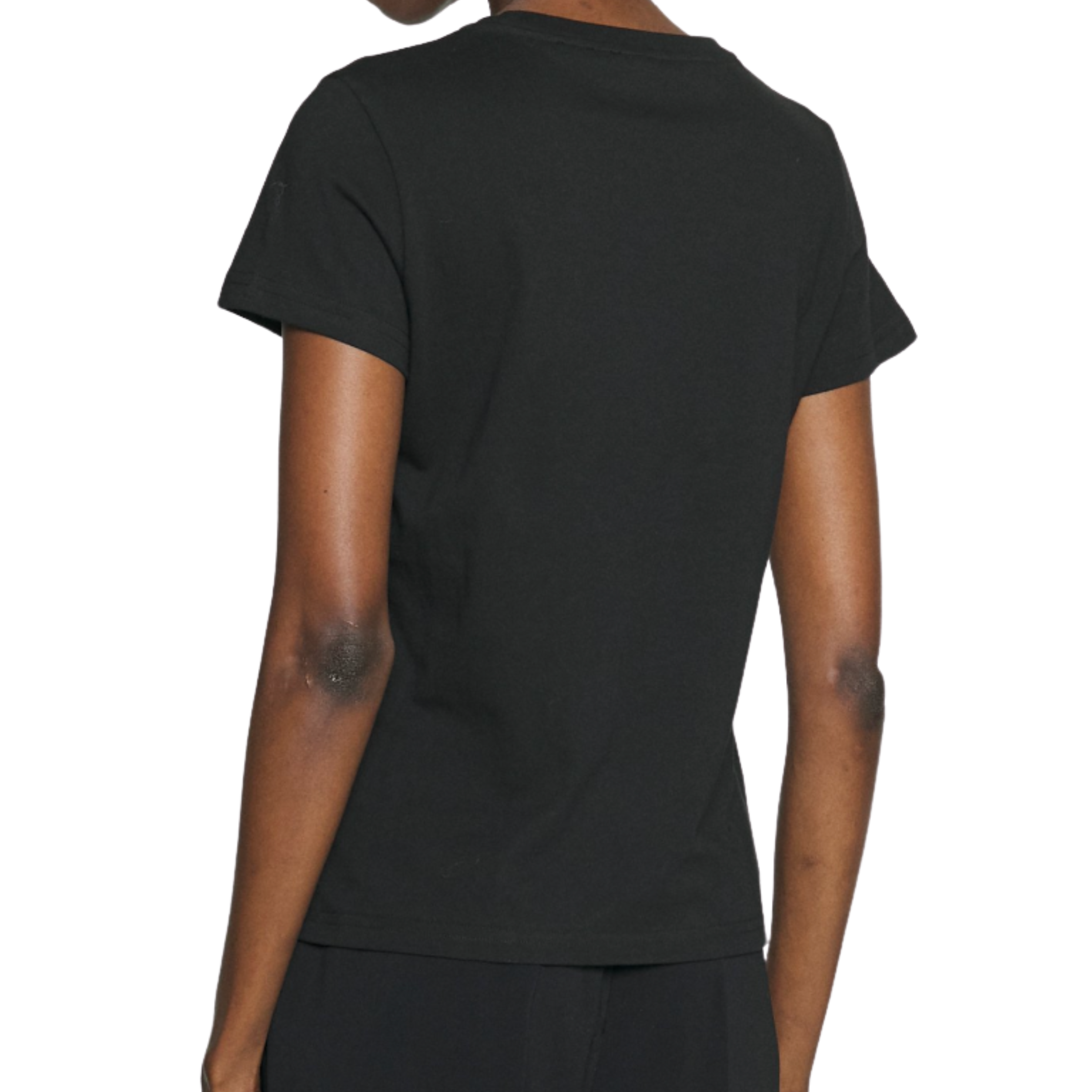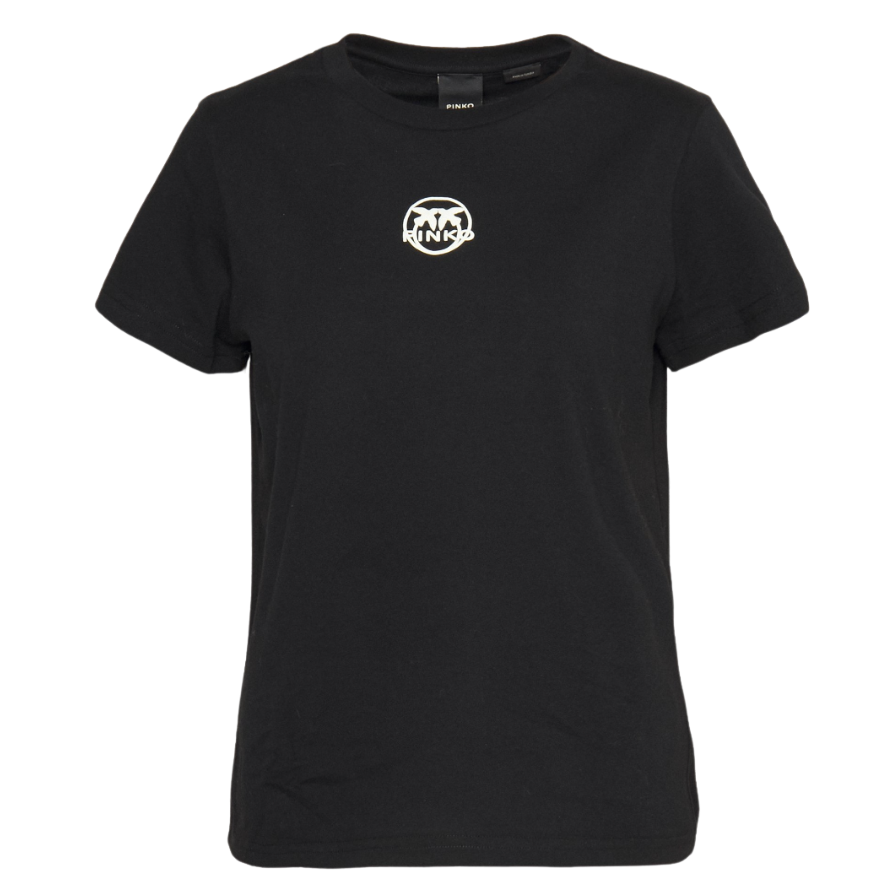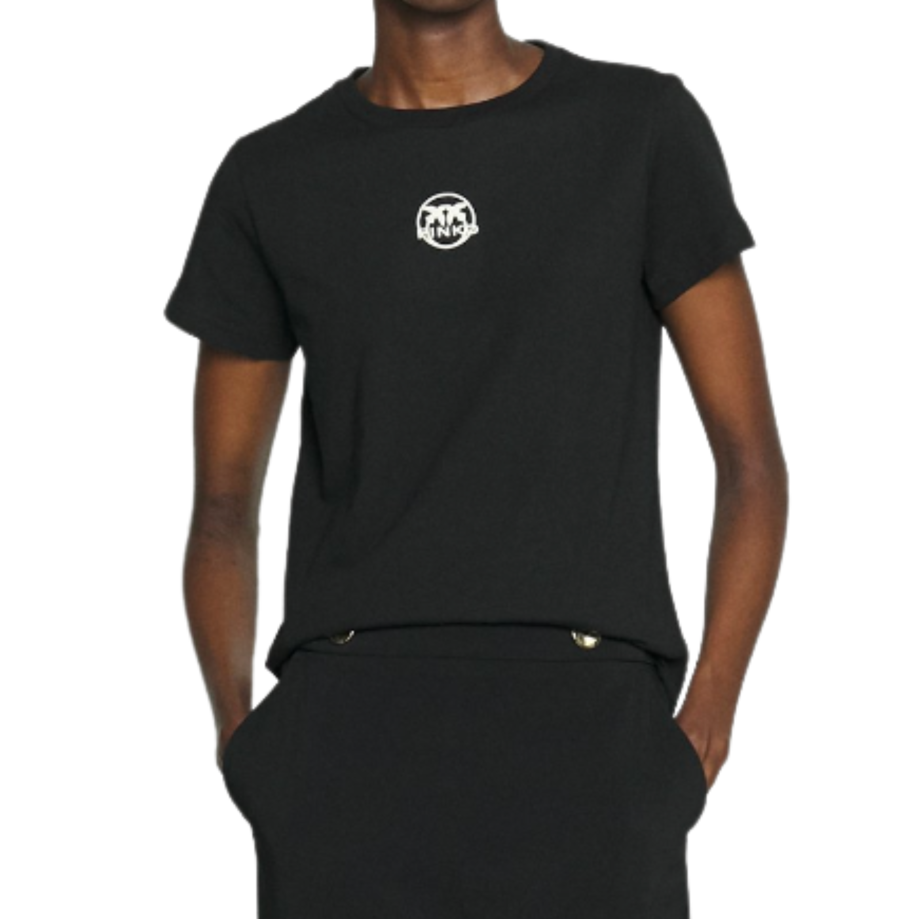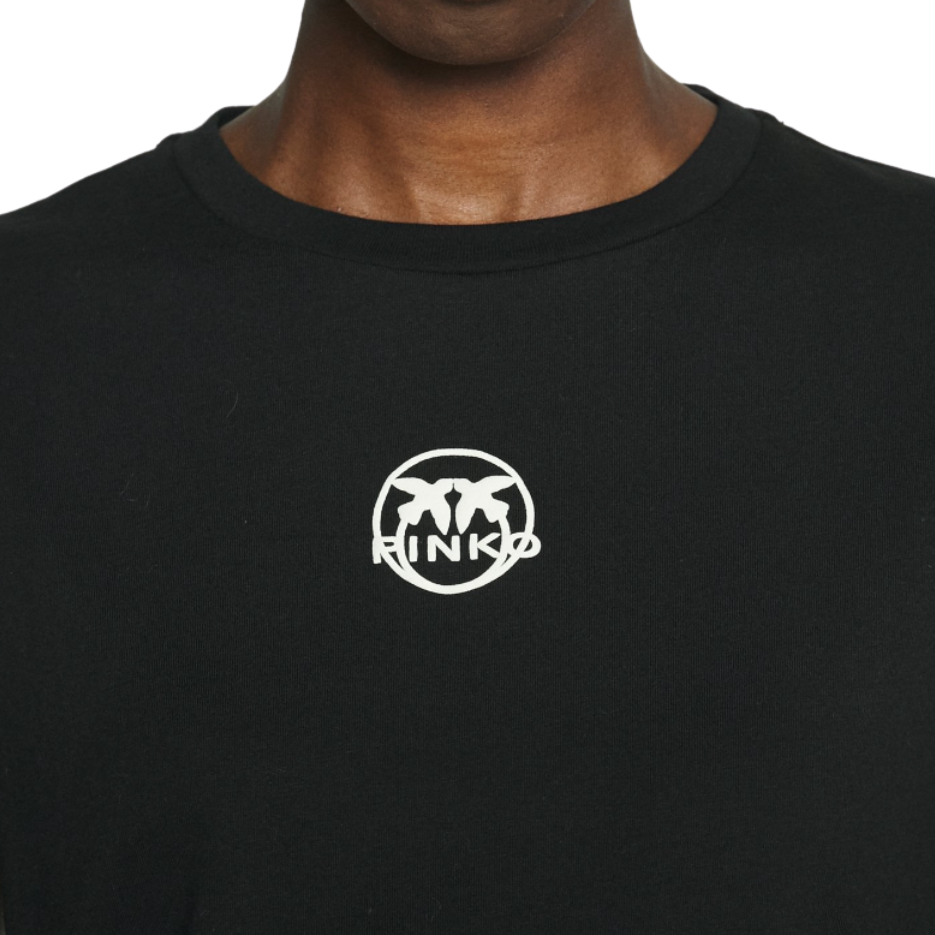 Black woman's t-shirt signed Pinko, with logo of the brand printed on the front. An essential and timeless garment, ideal for those looking for a simple but recognizable style. Made of 100% cotton jersey, this T-shirt guarantees comfort and breathability, perfect for everyday use.