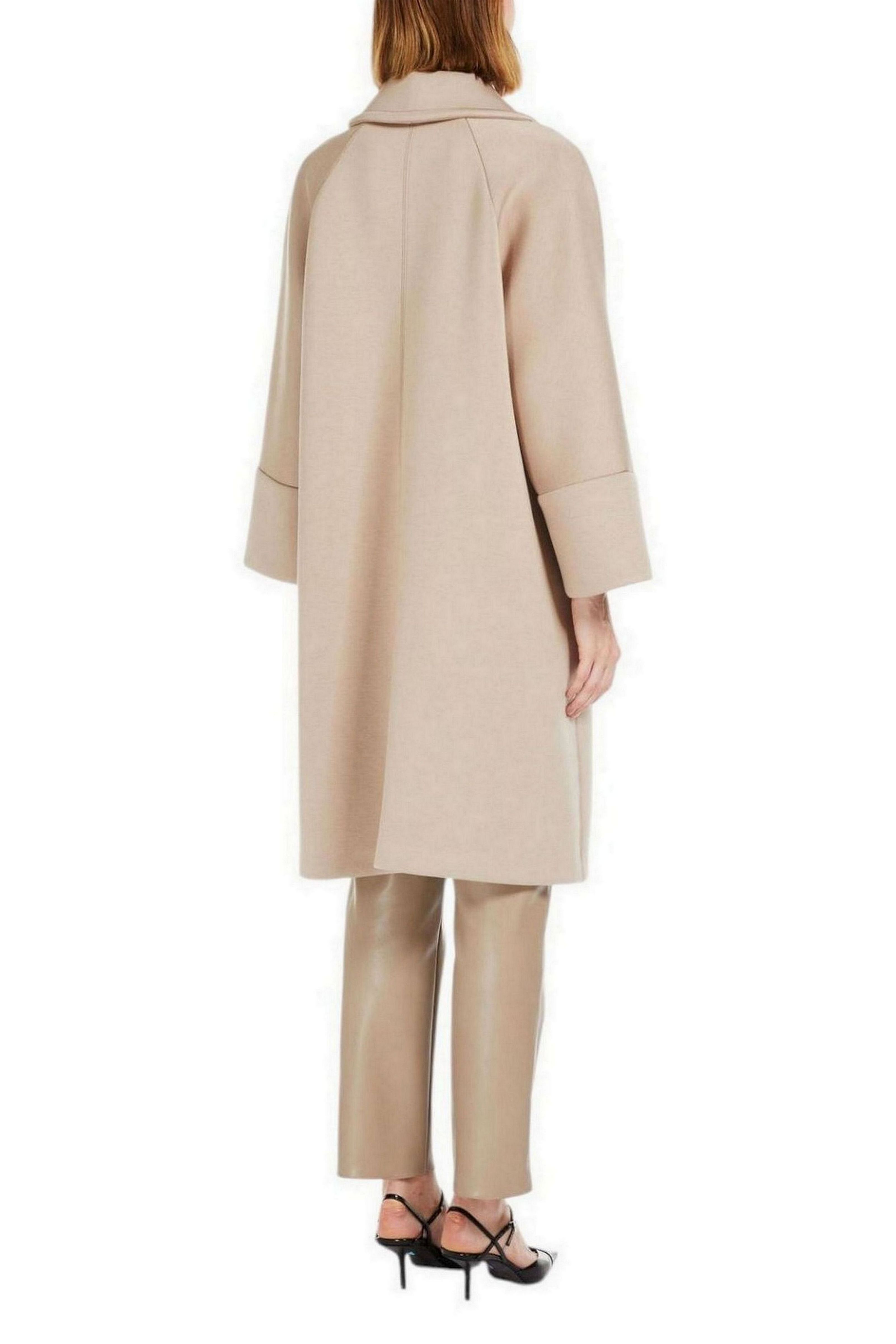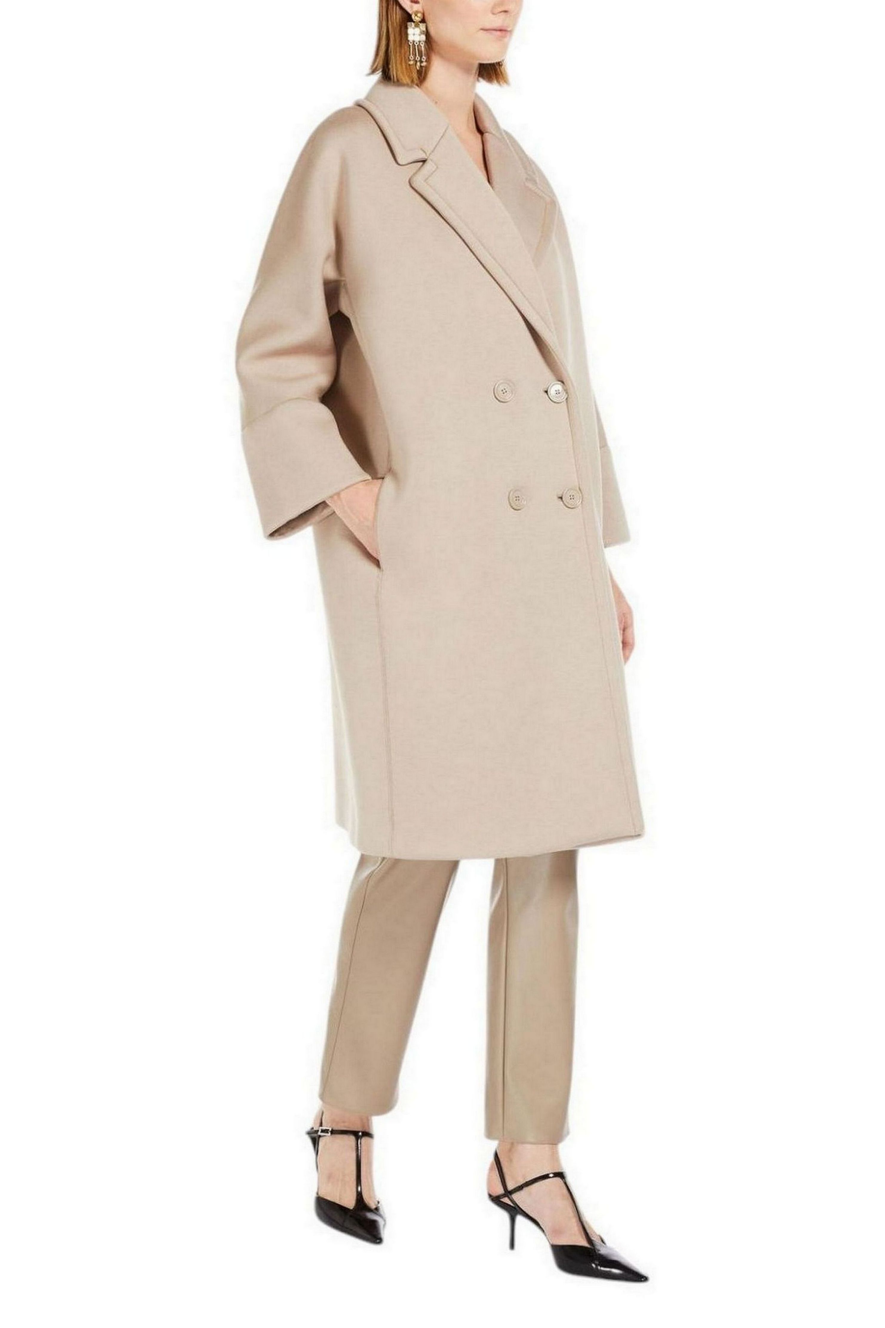 MaxMara S midi double-breasted coat made from soft bonded viscose jersey. Straight cut with a lapel collar, inset hip pockets and long kimono sleeves with raglan cut on the back. Front button fastening. Knitted fabric: 96% Viscose, 4% Elastane