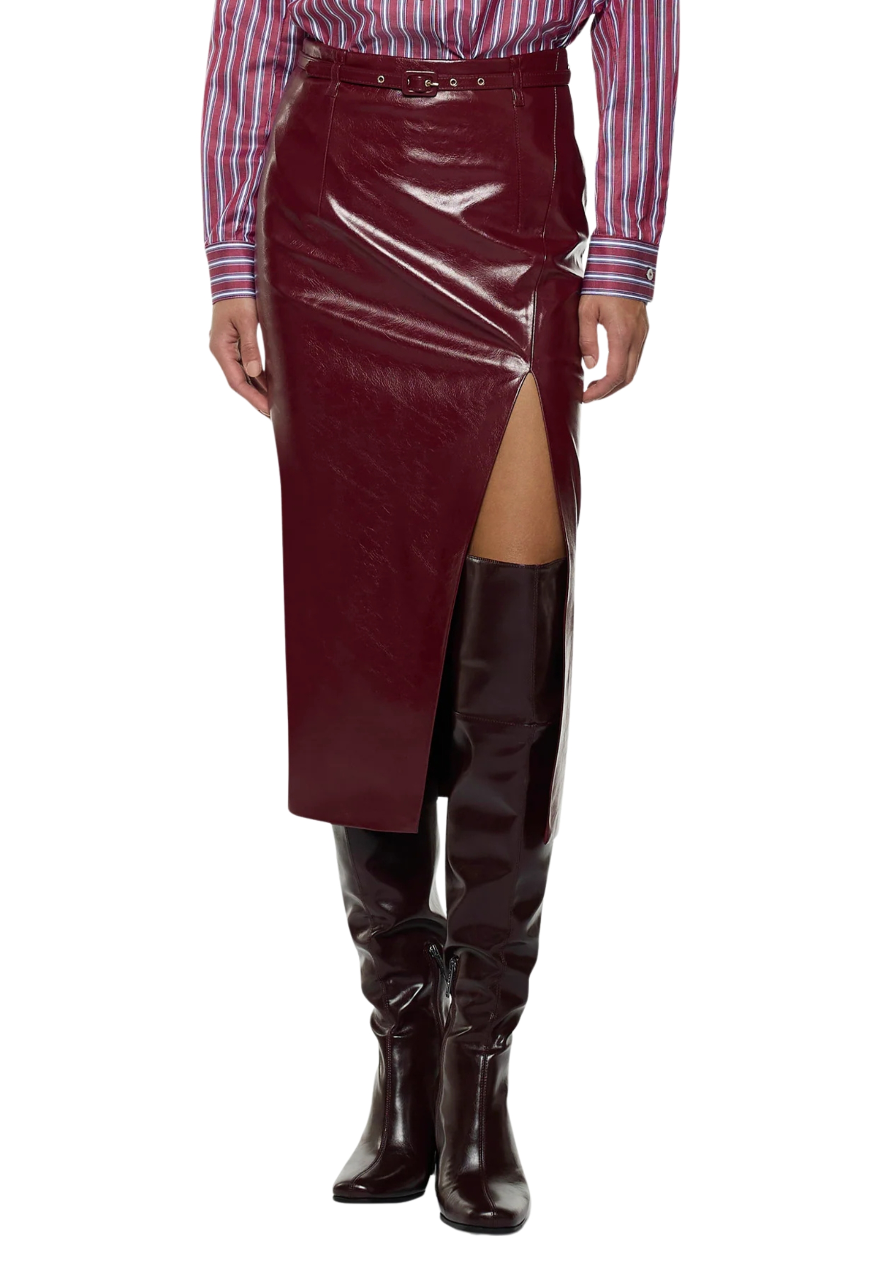 Pencil skirt in glossy eco-leather with deep oblique slit in front. Covered waist belt. Zip closure on the side.