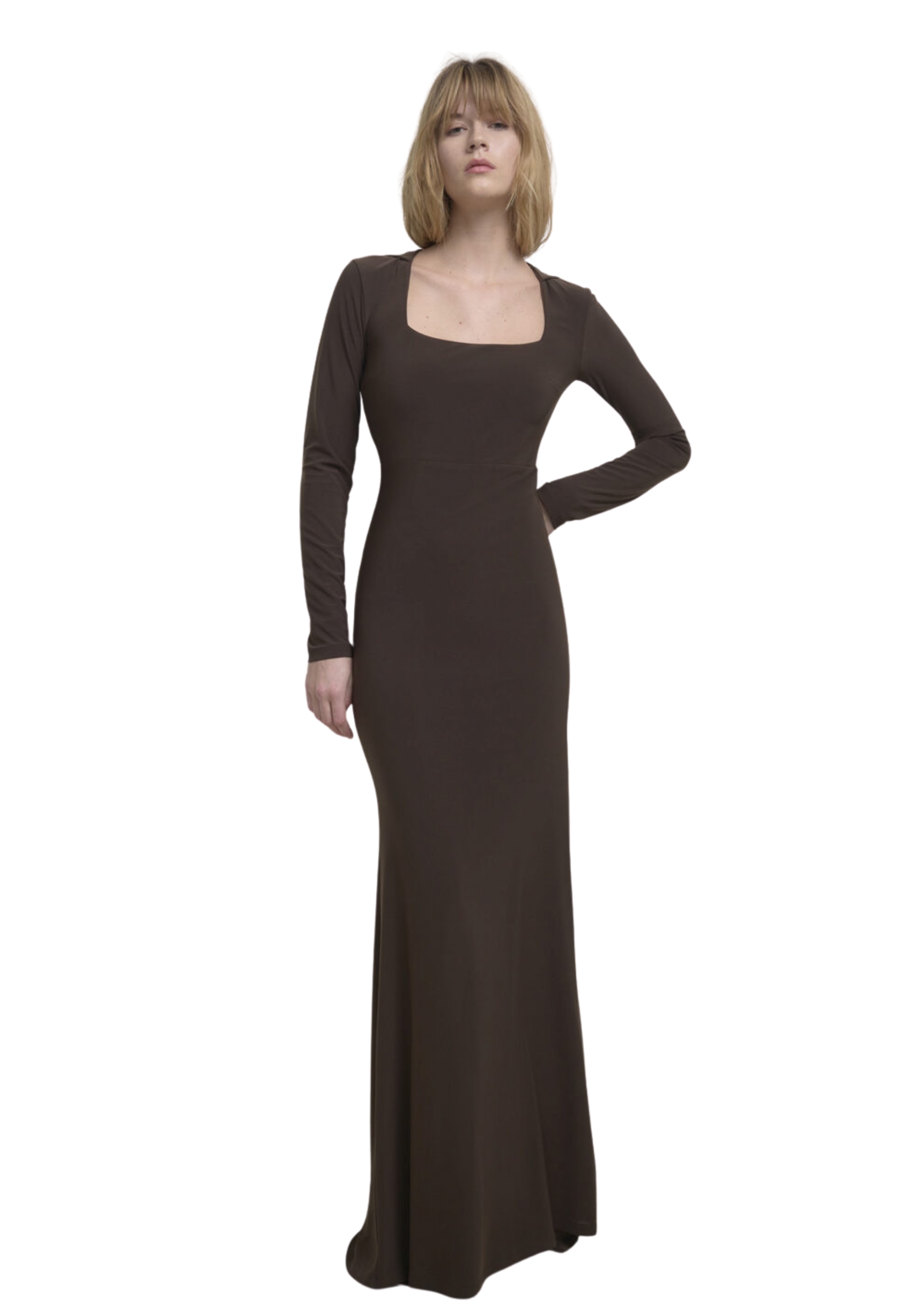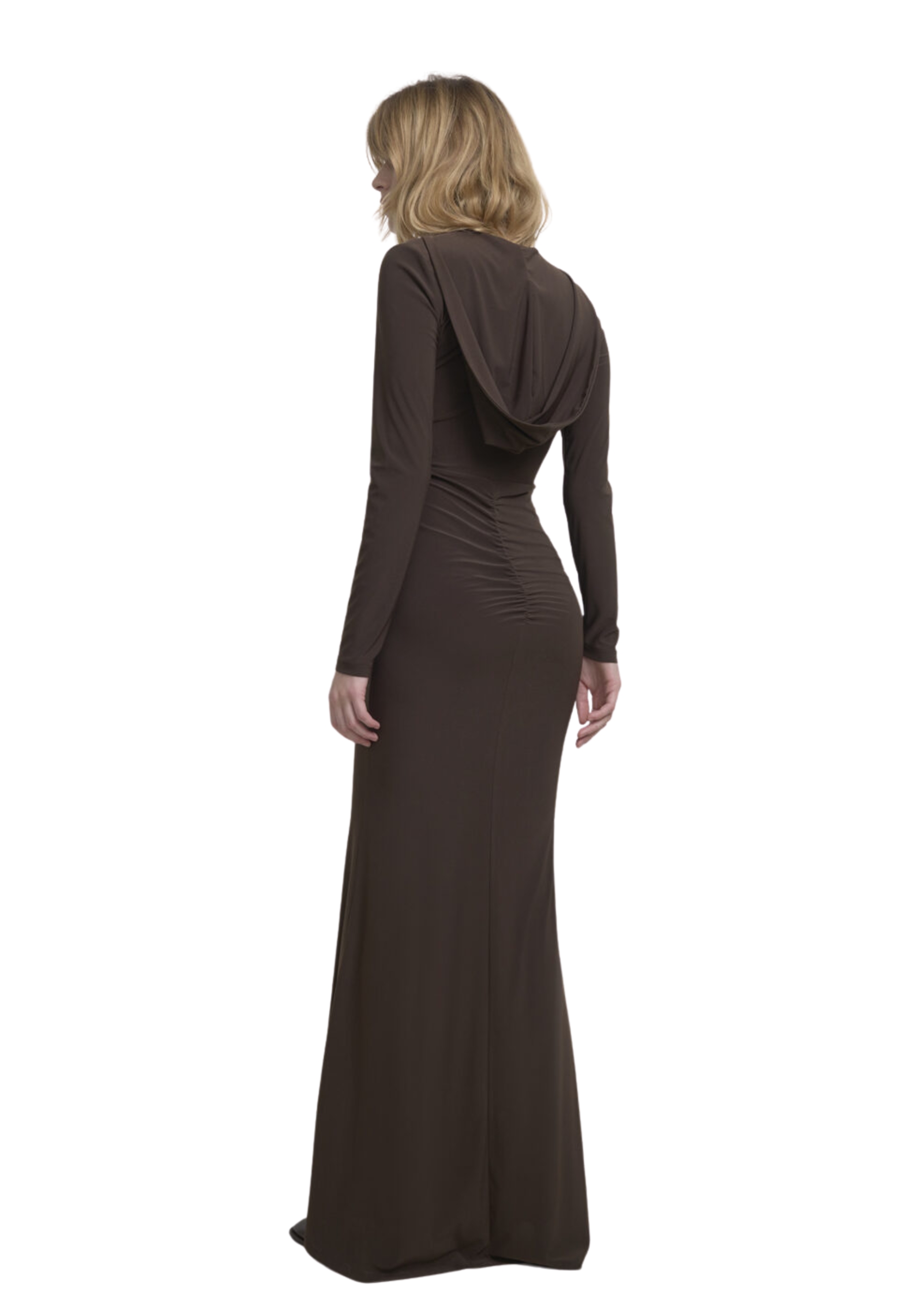 stretch jersey long dress with contemporary design And sensual with square neckline And long sleeves. adherents.characterized by a hood that adds an urban touch And distinctive.taglio adhering with curlings on the back that enhance the silhouette.