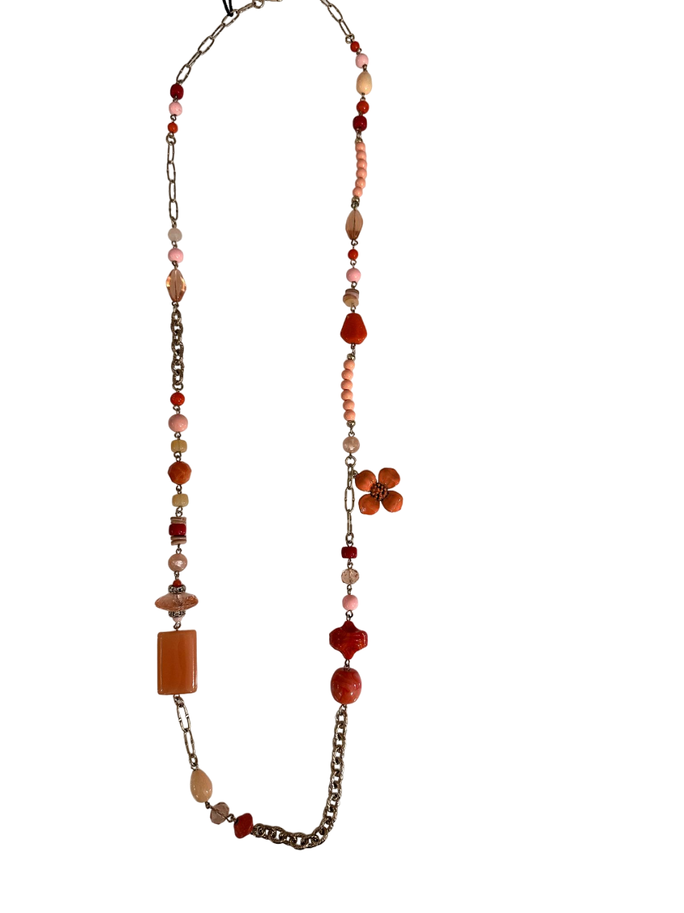 Beautiful long necklace with golden metal and stones in the warm shades of orange, pink and red. A unique and original bijoux 100% made in Italy. Sodini Bijoux is a guarantee of success.