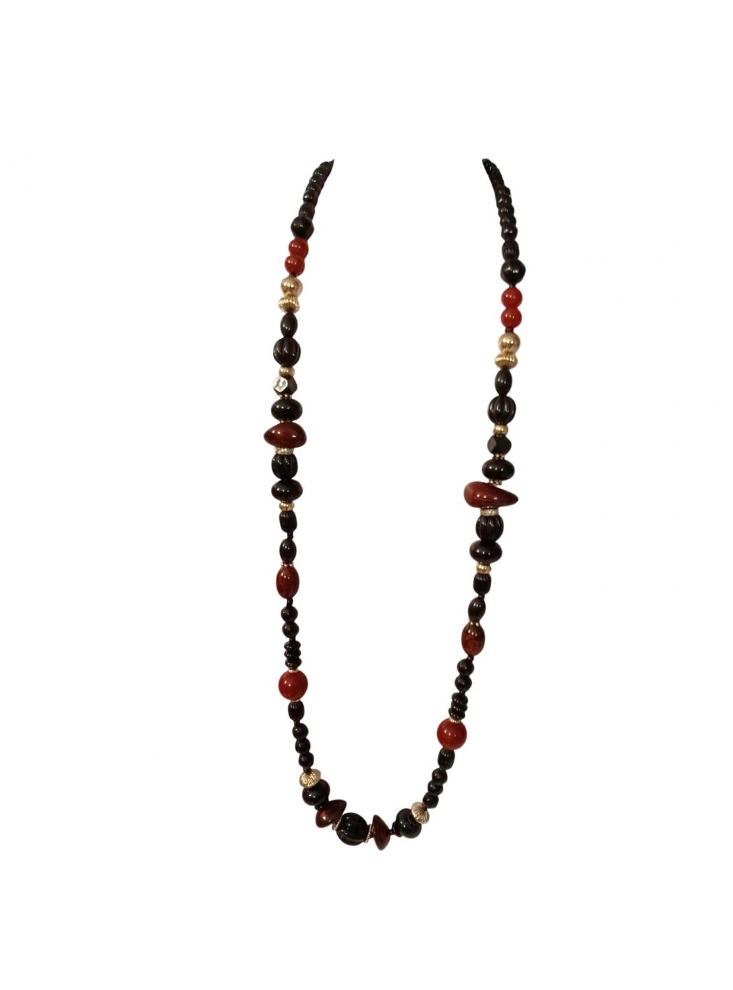 Make your look exclusive by wearing this refined and highly effective necklace. Design with a thread of bright black and burgundy stones alternating with golden boules and metal washers with rhinestones. An accessory in a version with shades of green, black and burgundy, perfect for any occasion. Sodini plate on the closure.Materials: resin. Length 112 cm. Closure with snap hook.
