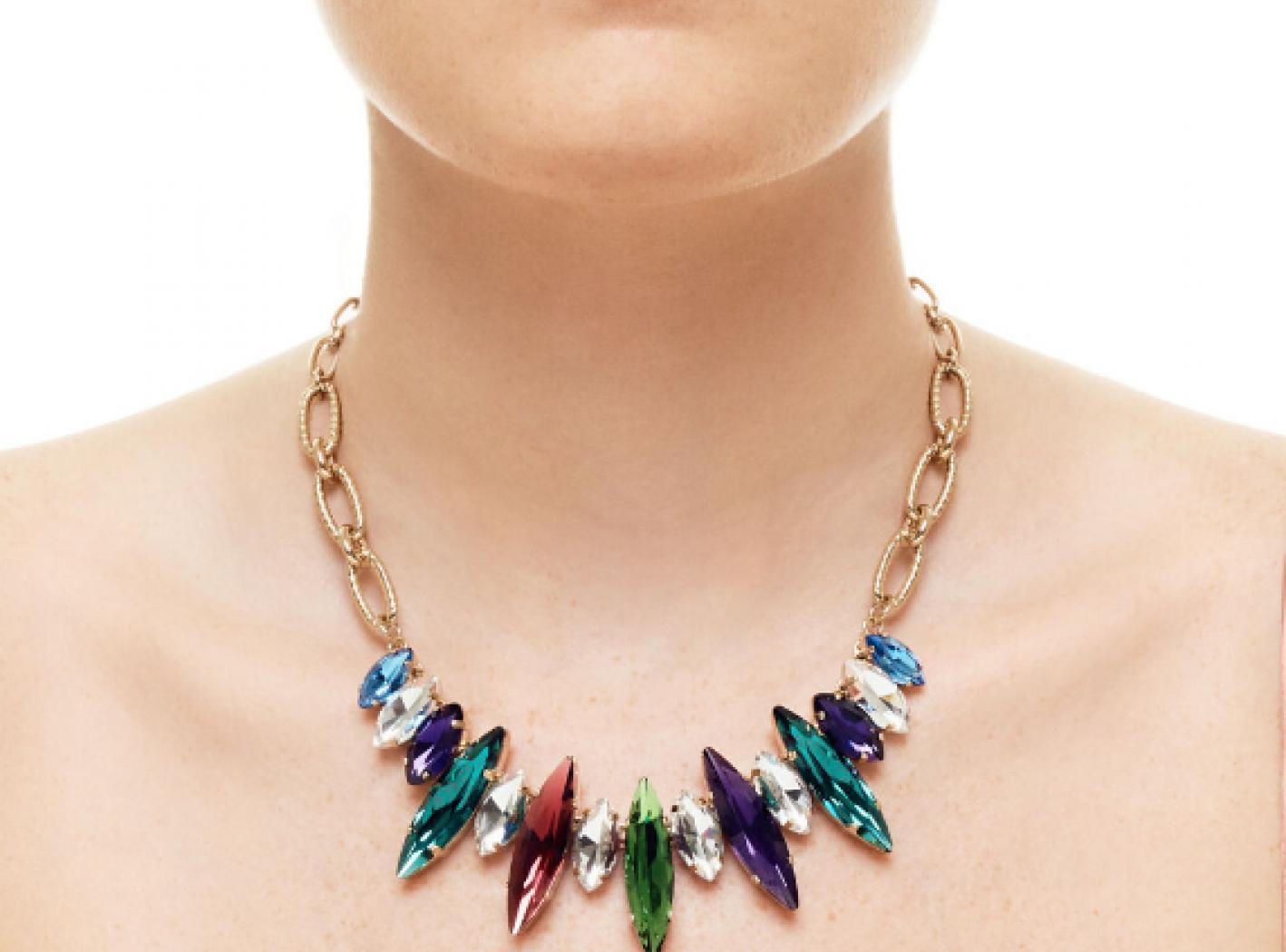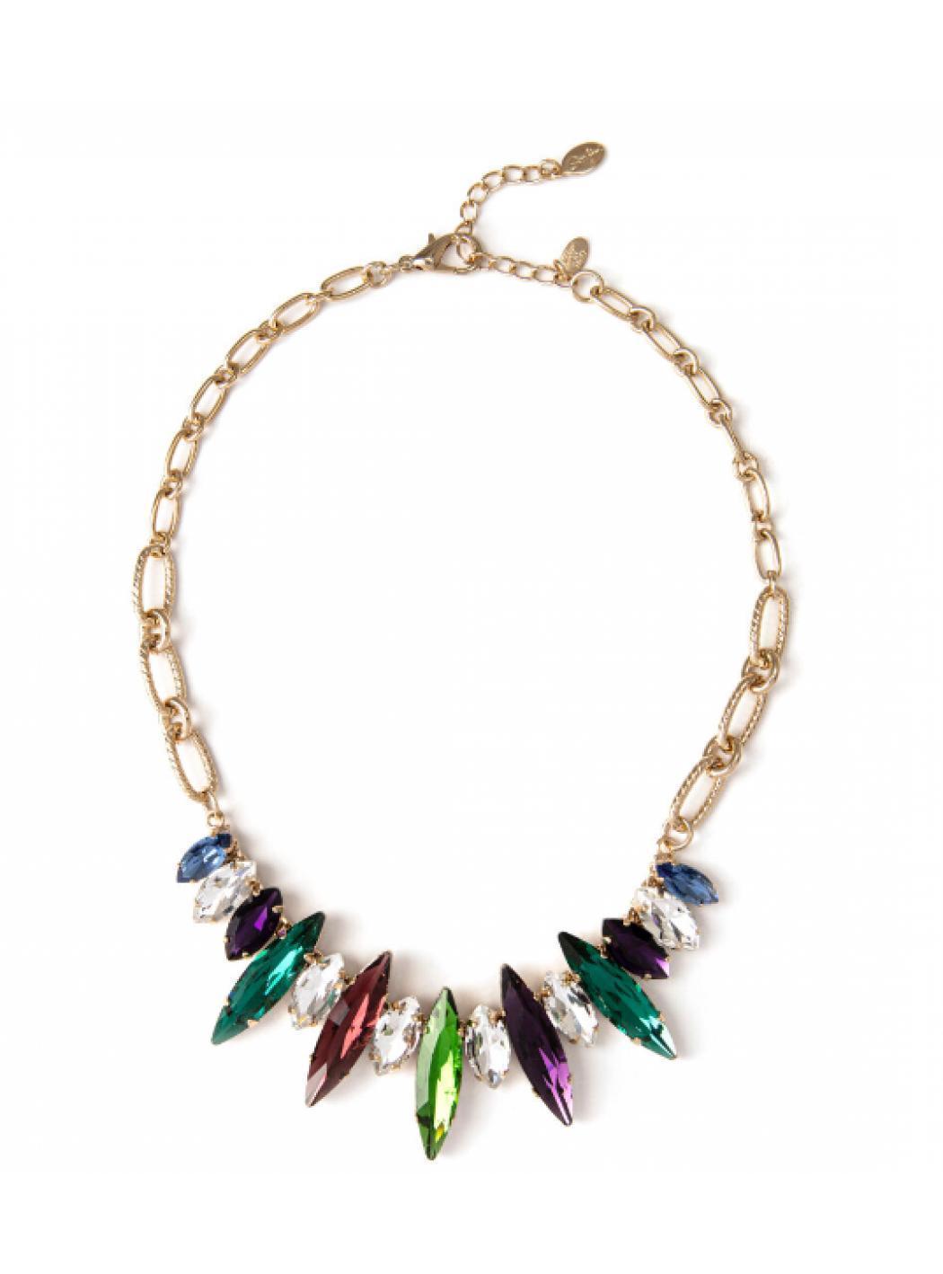 A sumptuous crew neck that gives a cool and absolutely classy touch on your decollete. Design with shining chain of big jerseys, embellished in the center by a series of crystals shuttled with dazzling reflections. A perfect accessory with any outfit, in its multicolor and gold chromes. Plate Sodini on the extension chain.