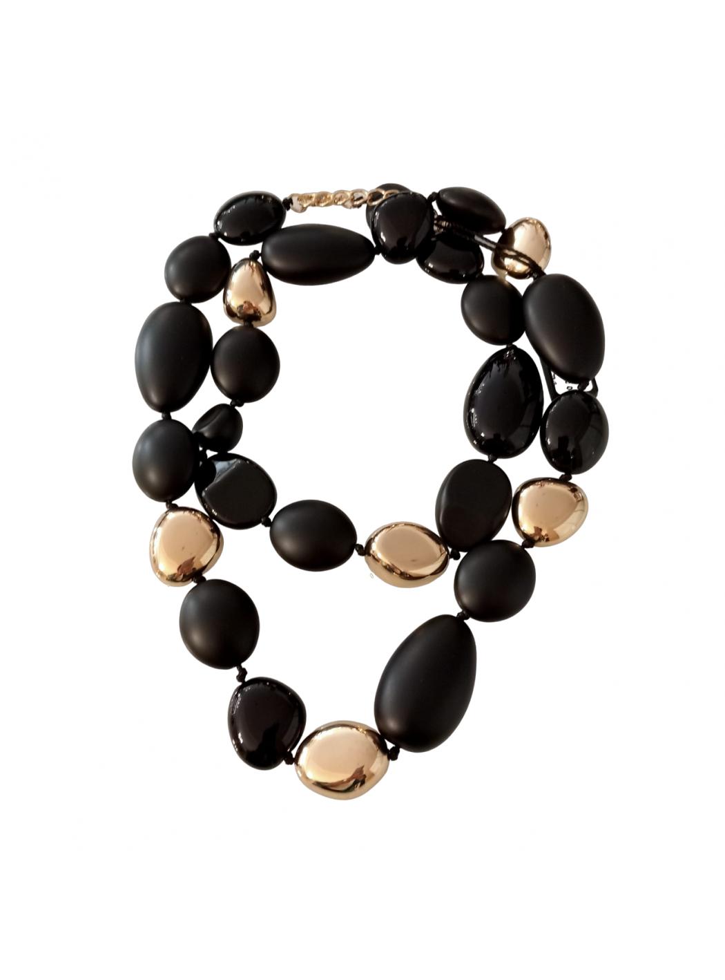 Elegant necklace with absolutely trendy design, with a thread of large asymmetric elements with smooth and harmonic lines in their shiny or translucent chromes. An accessory that enriches your decollete in a version with black and gold tones, to be always at the center of attention. Plate Sodini on the extension chain.