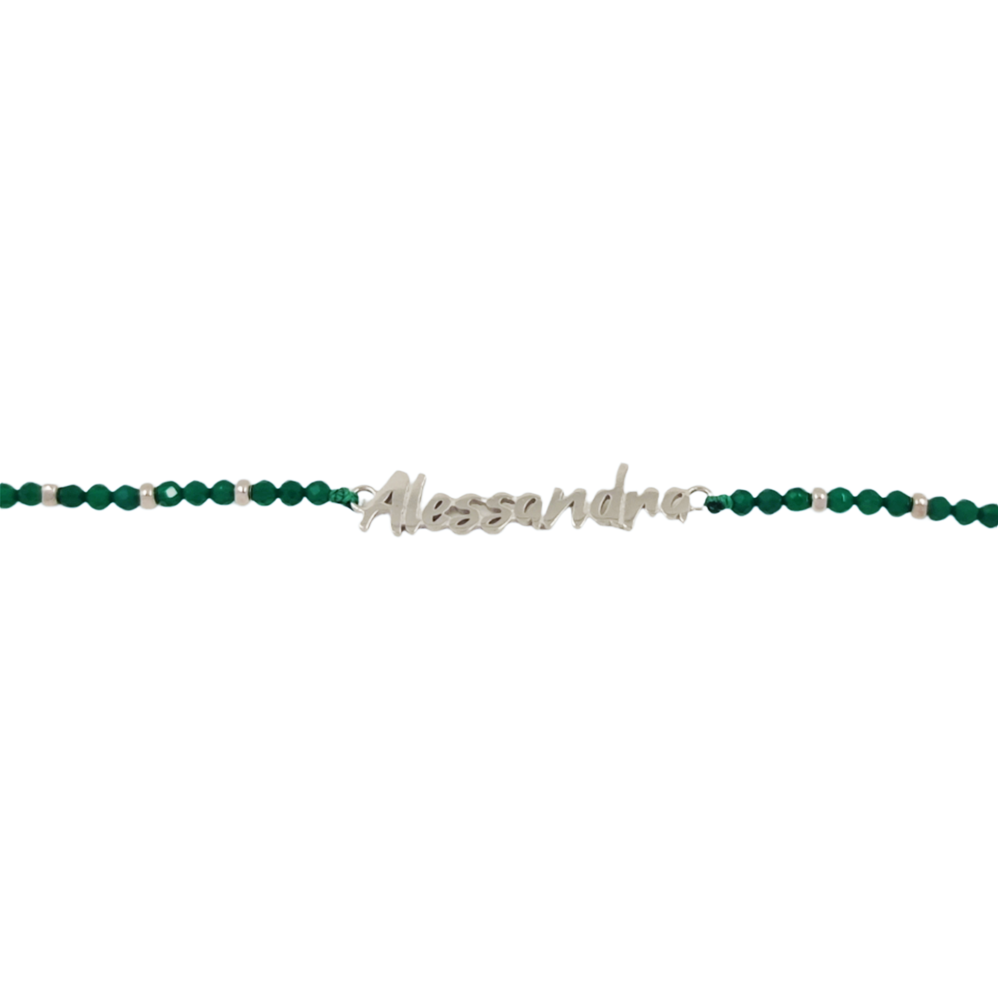 925 Silver Bracelet with Green Peppers and Written 'Alessandra' Central.