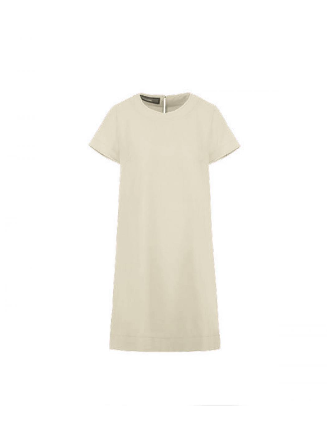 Crepe fabric dress with short sleeves. Closure on the back with button wrapped in fabric. Contrast piping edge color . Knee length.