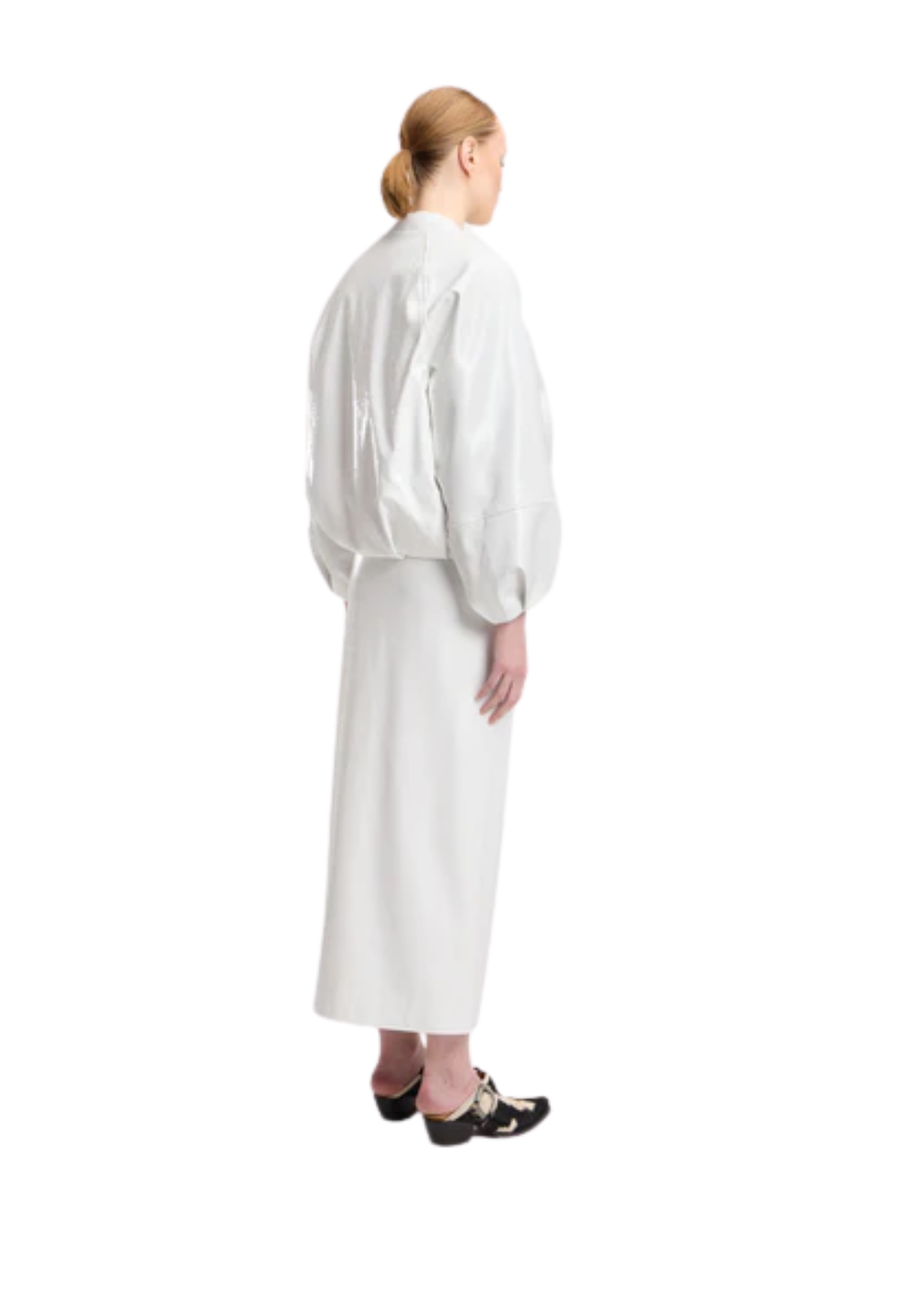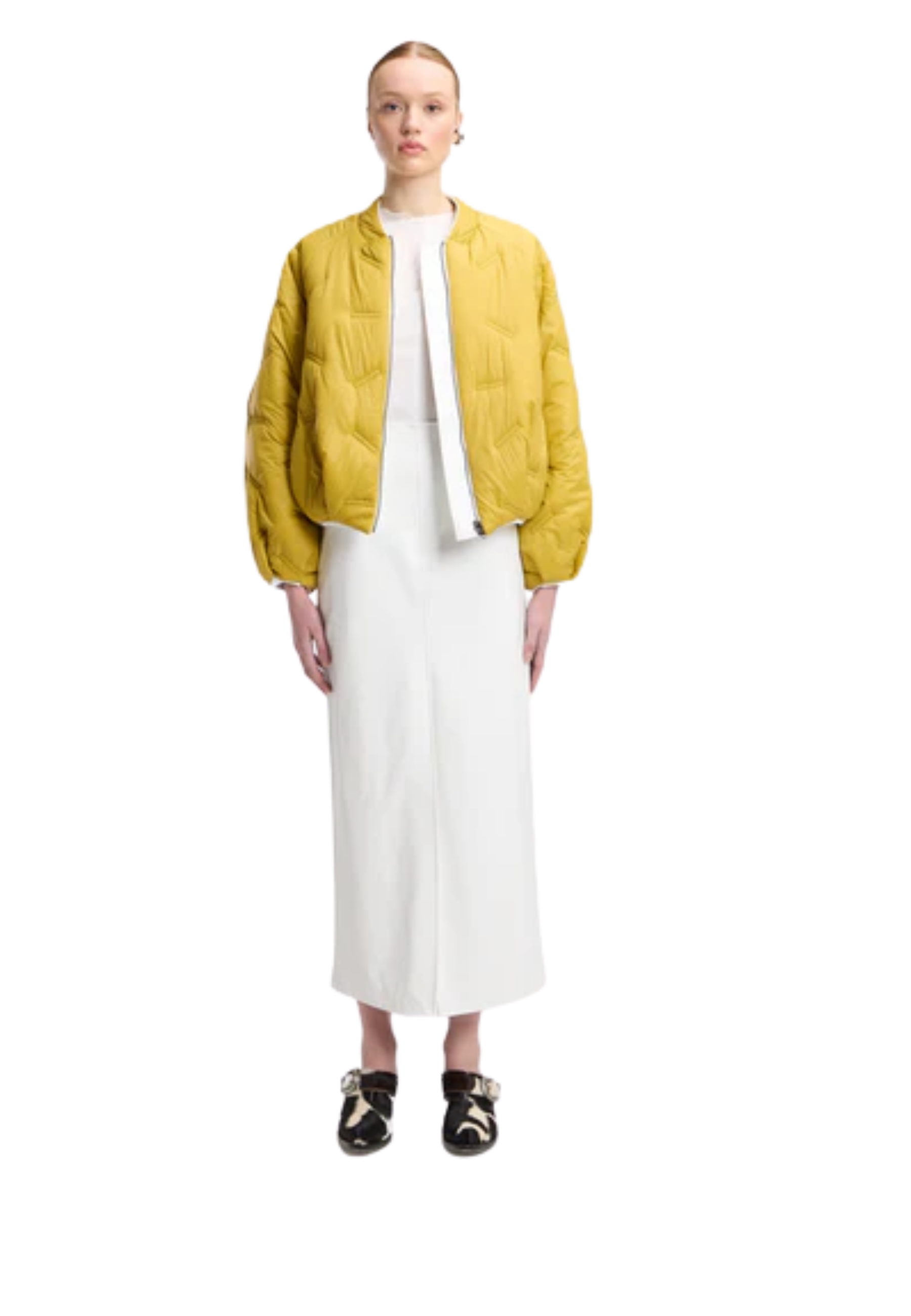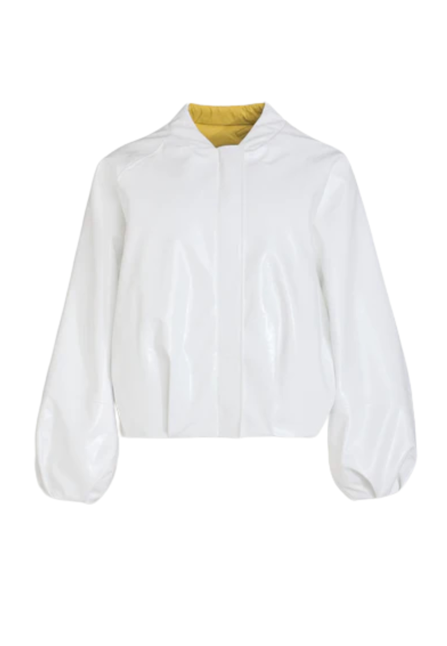 short white vinyl bomber with curls on the revcersible yellow jacket
