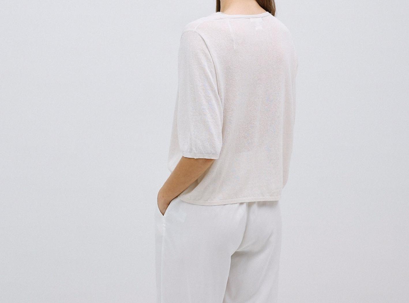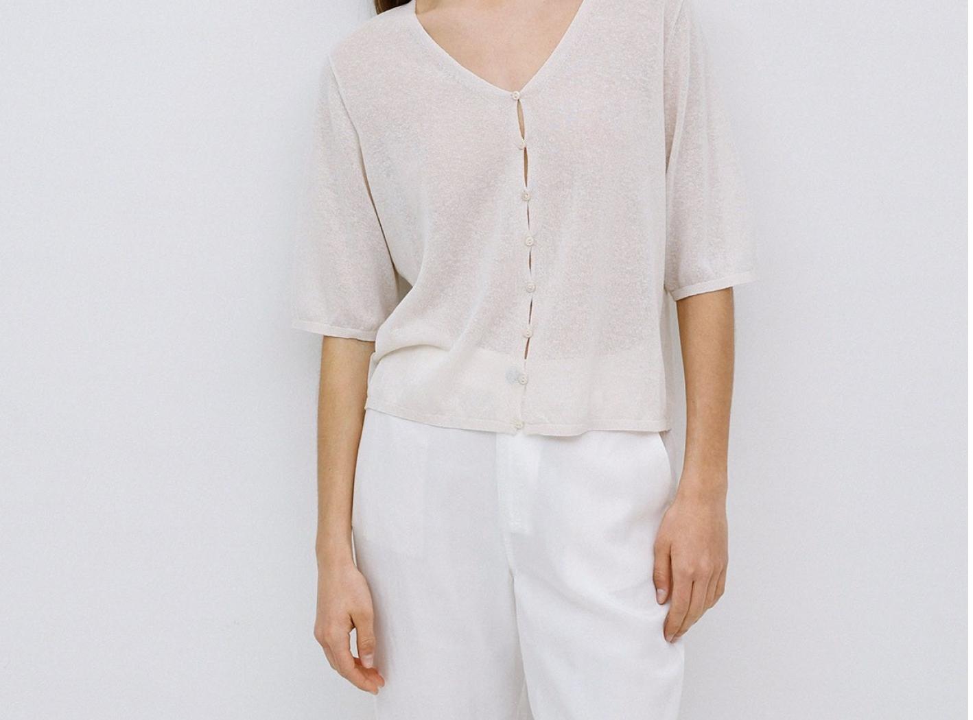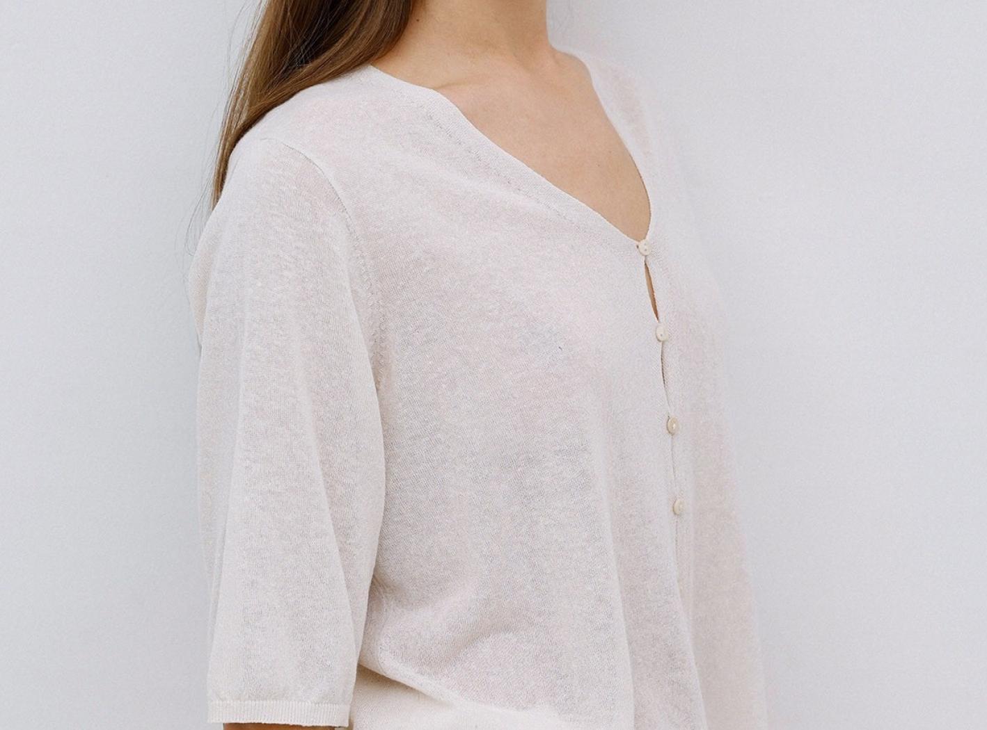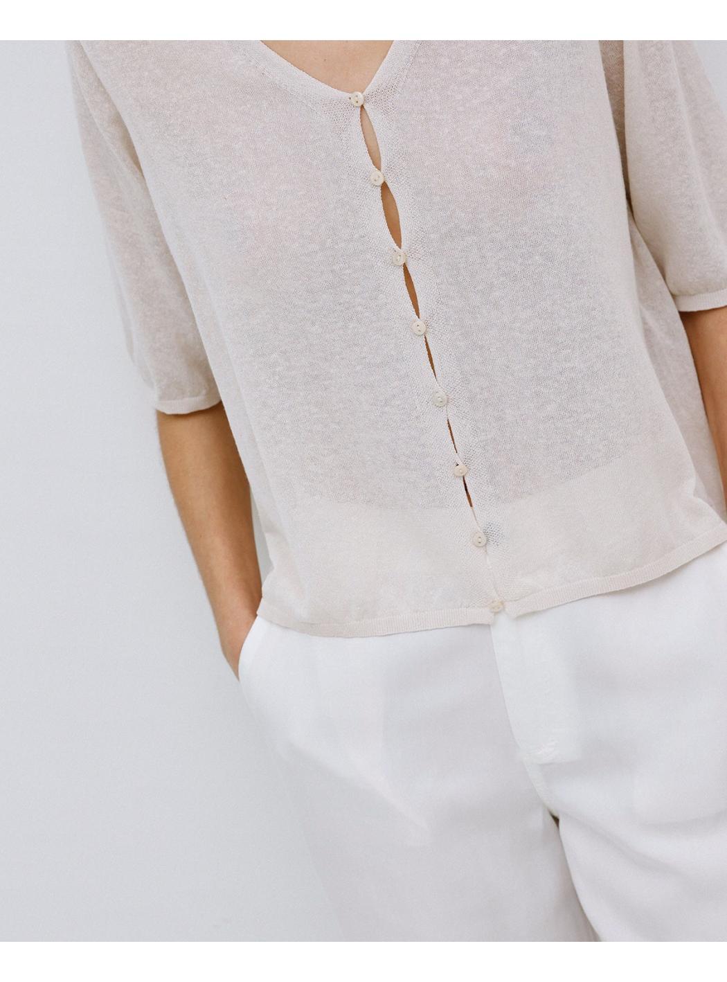Cardiganshort.Cotton,linenandfibresrecycledmixfabric.Necklineround.Manufacture to 3/4.Closure with buttonsinMother of pearl.Finishesa coastal areas onsleevesandon'edge.