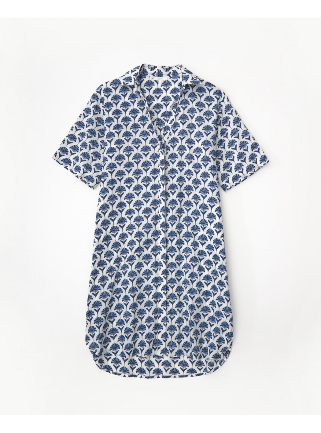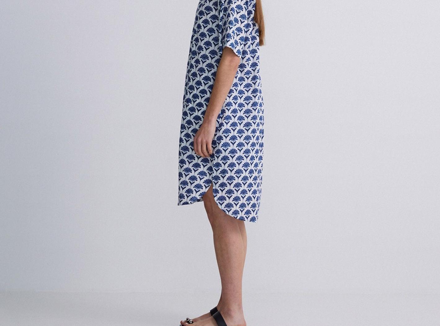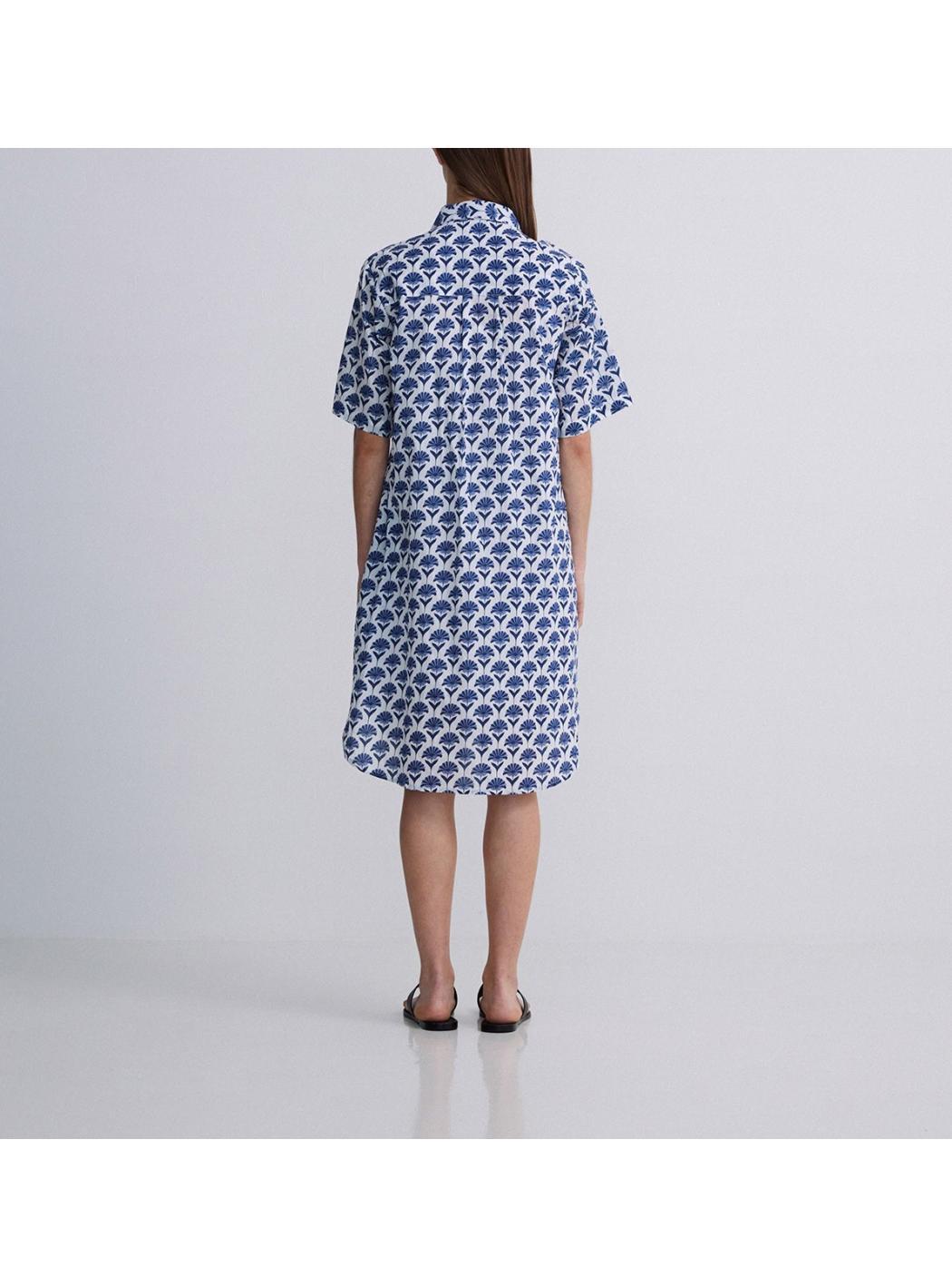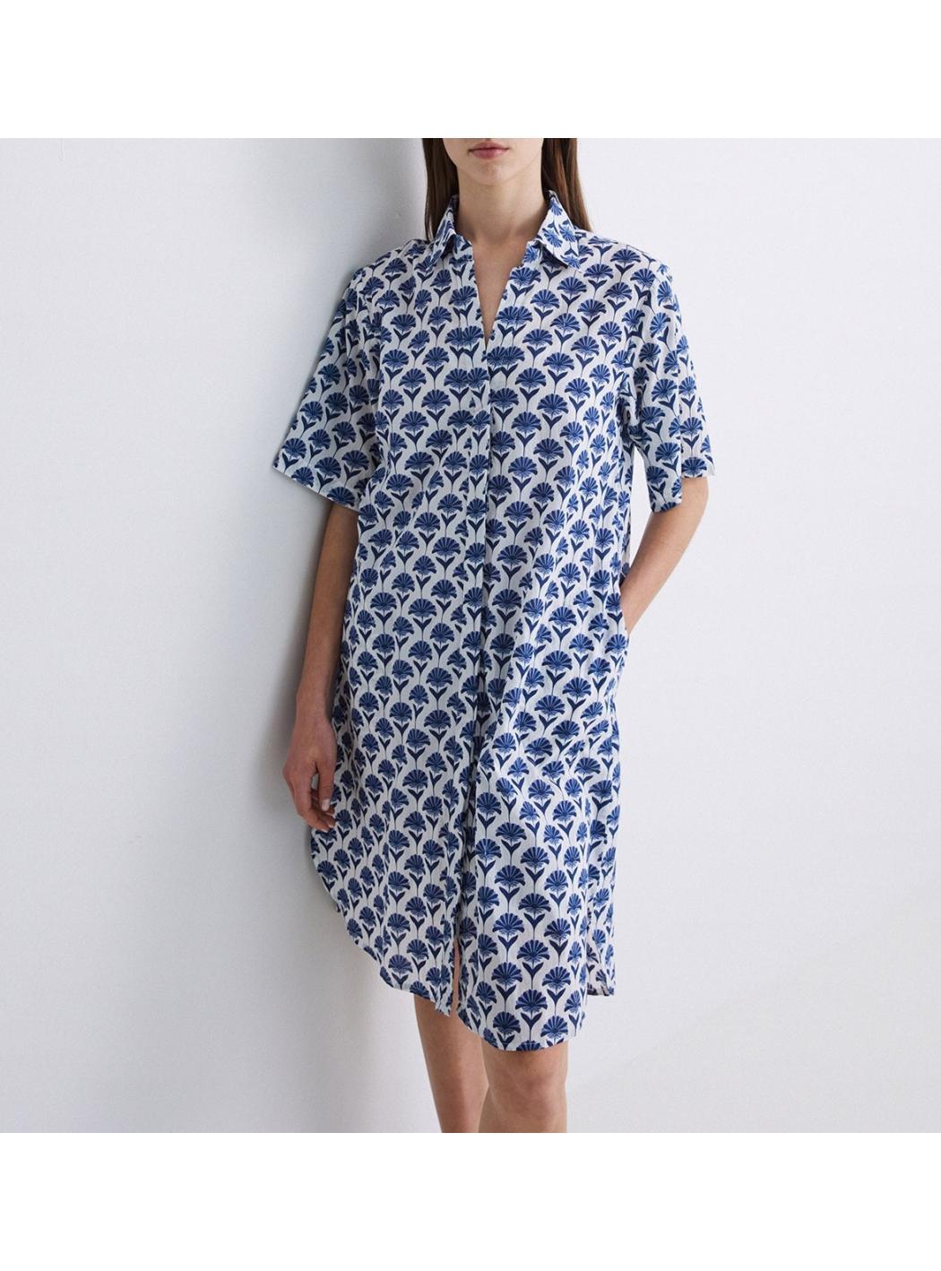 Shortcottondress. Floral print design. Collar. Short sleeves. Button fastening in front. Lined. Side sleds at the hem. Pleated back.
