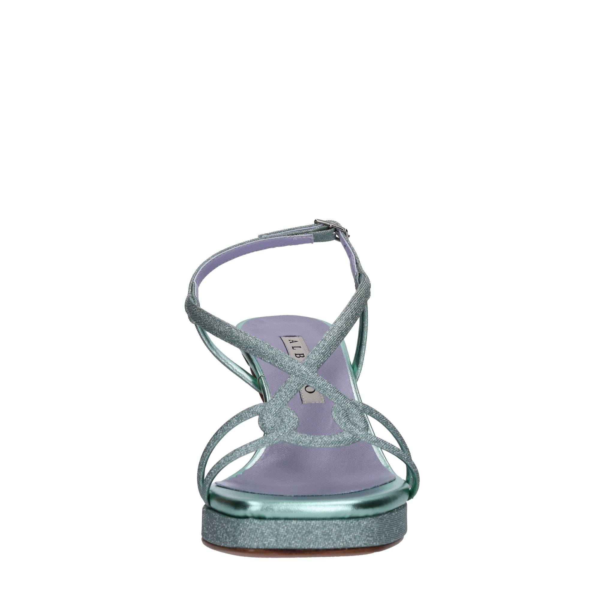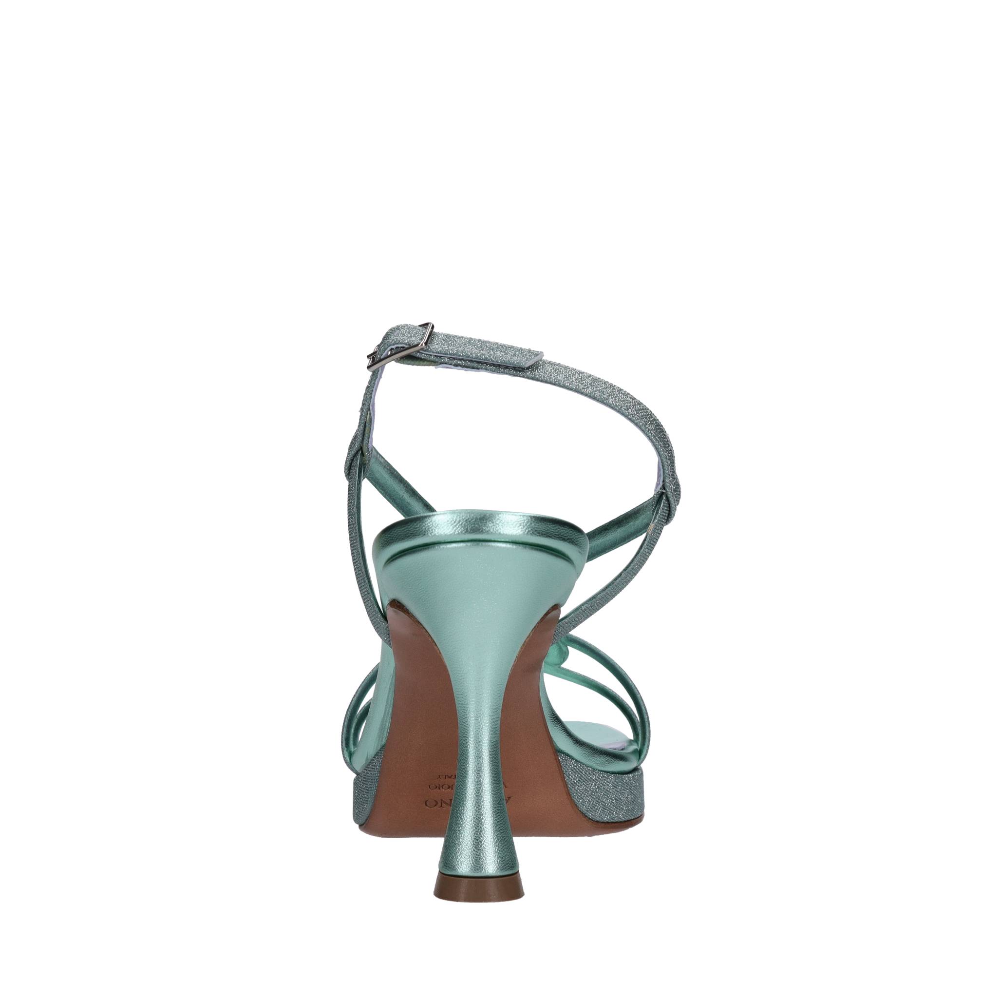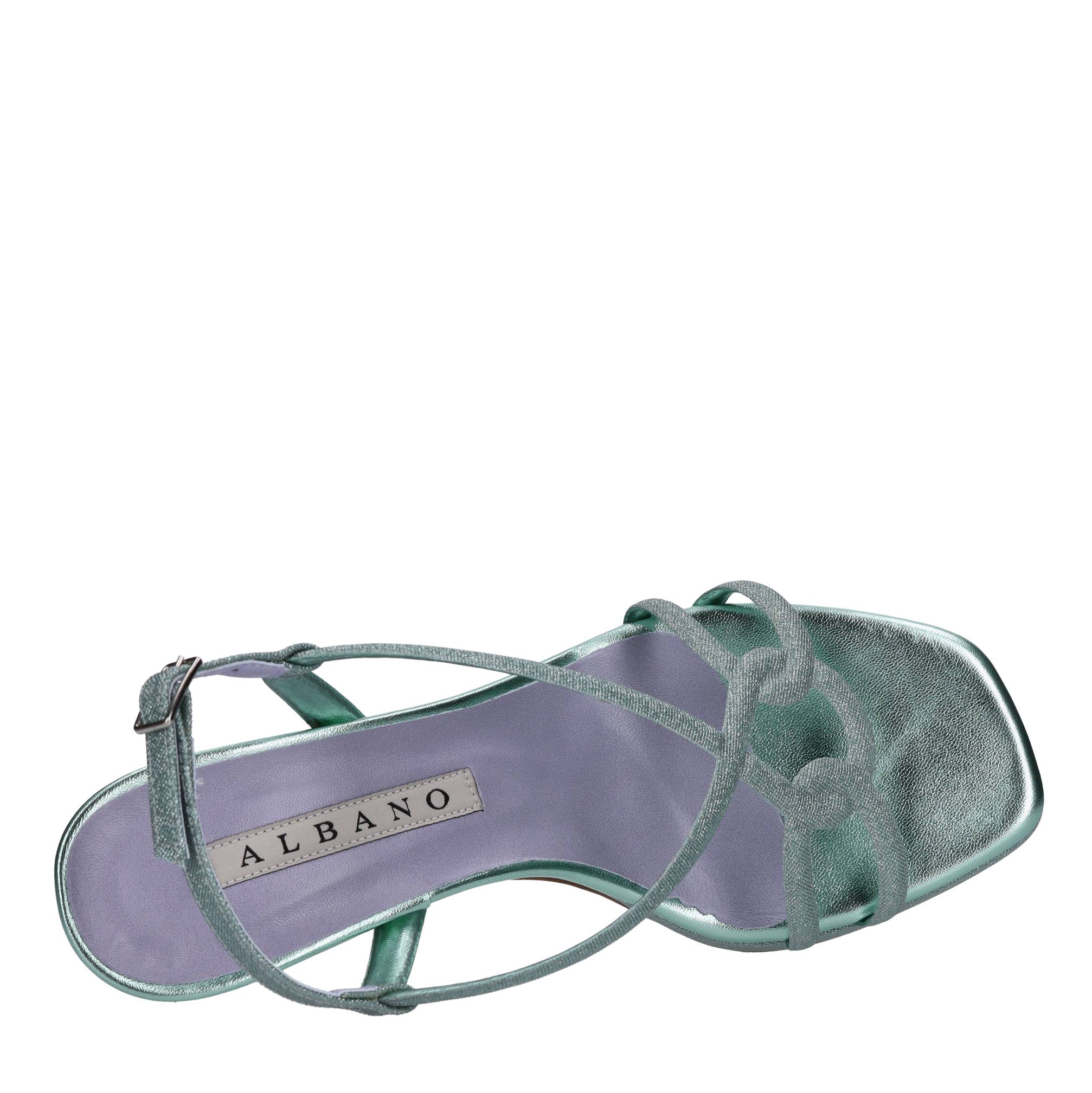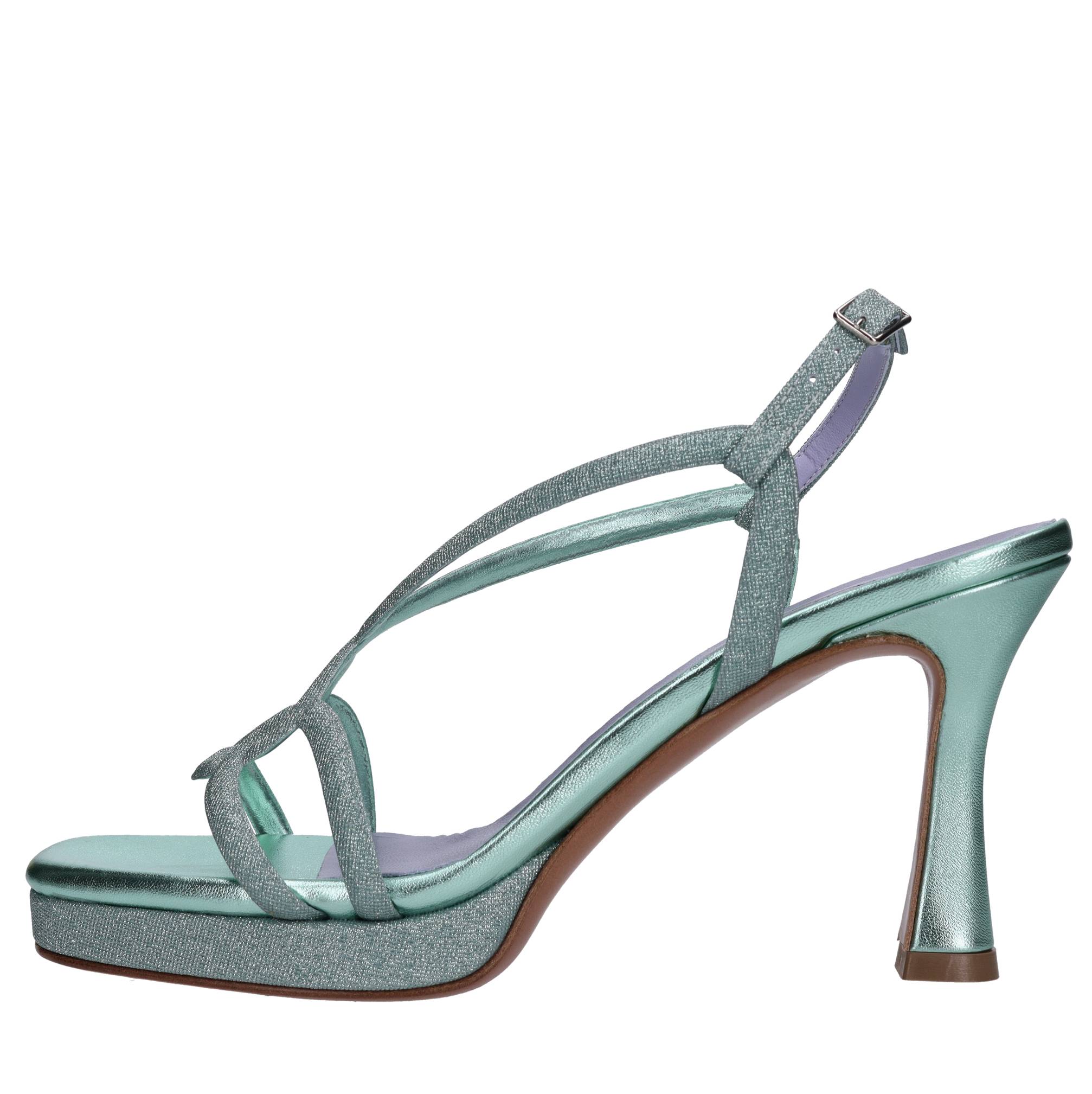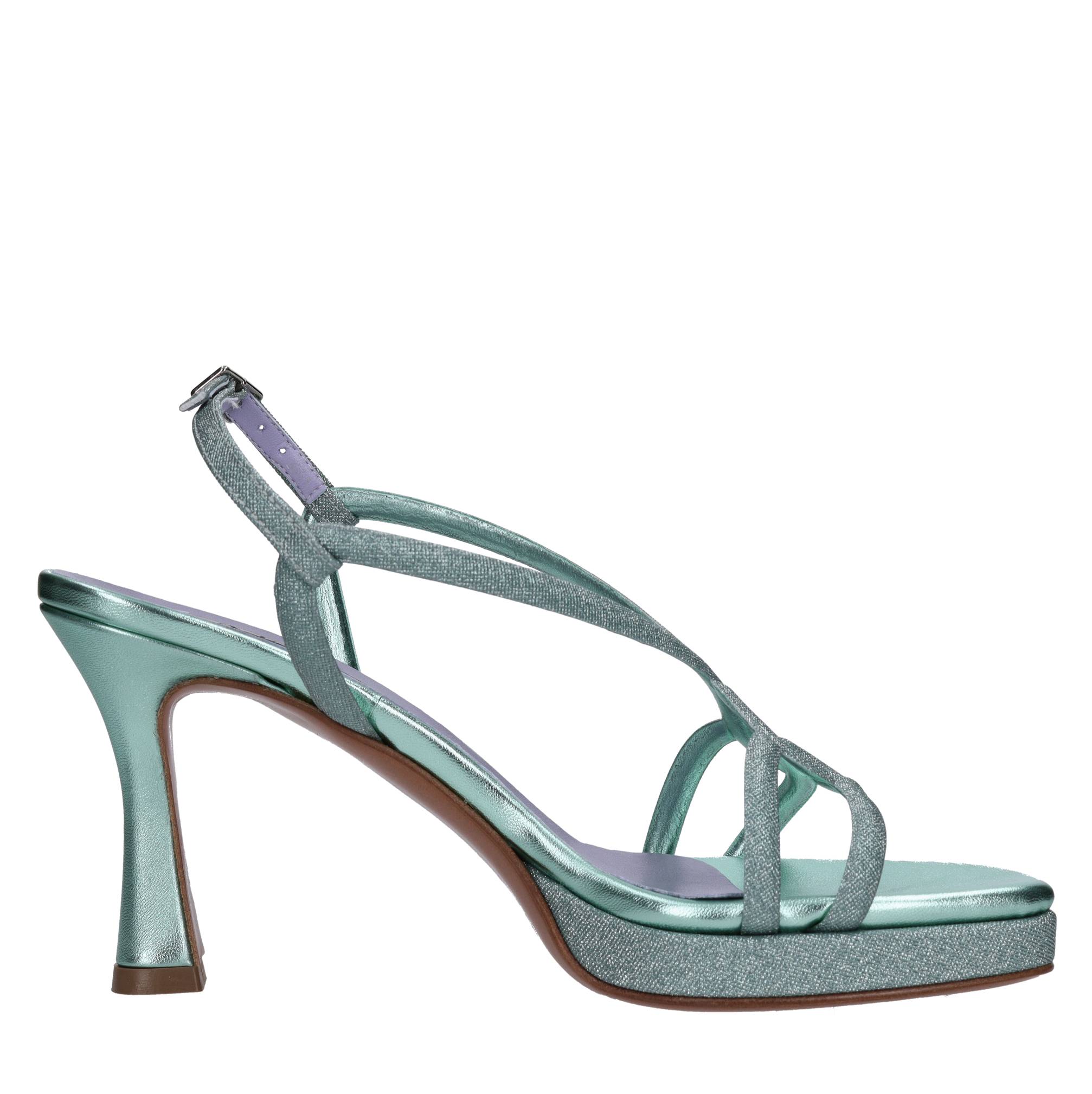 Sandalias de cuero y brillo. Correa ajustable. Suela exterior de cuero. Parte superior interna en satinado y cuero.